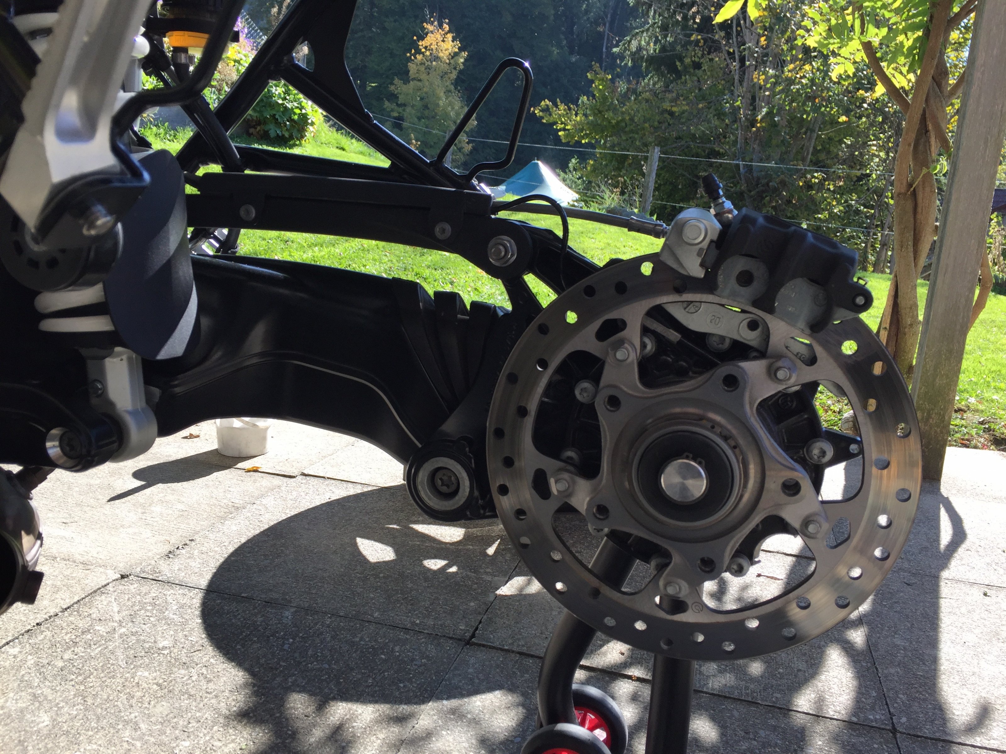 Die Besfestigungsschrauben des hinteren Bremssattels müssen auch mit Schraubensicherungsmittel eingesetzt werden, da schon Bilder aufgetaucht sind, wo ein sich selbstständig gemachter Bremssattel die Speichen des Hinterrades "abgemäht" hat.... So etwas braucht keiner. Abgesehen davon, sind die Speichenfelgen robuster als die Gussfelgen (z.B. bei starken Schlaglöchern).