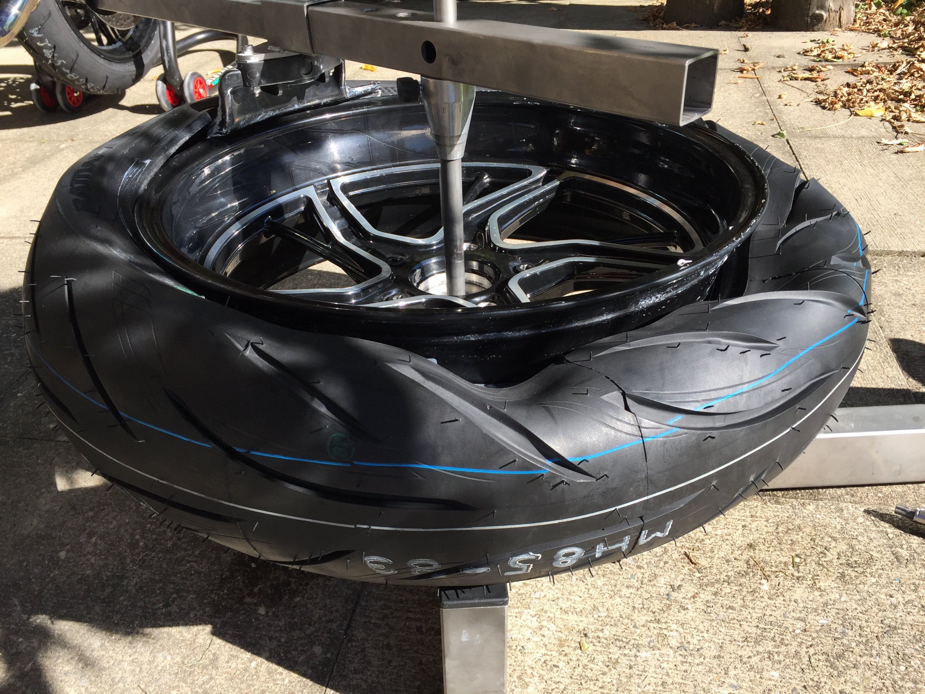 Da der Michelin bereits zum zweiten Mal montiert war, fällt er wie von selbst von der Felge: