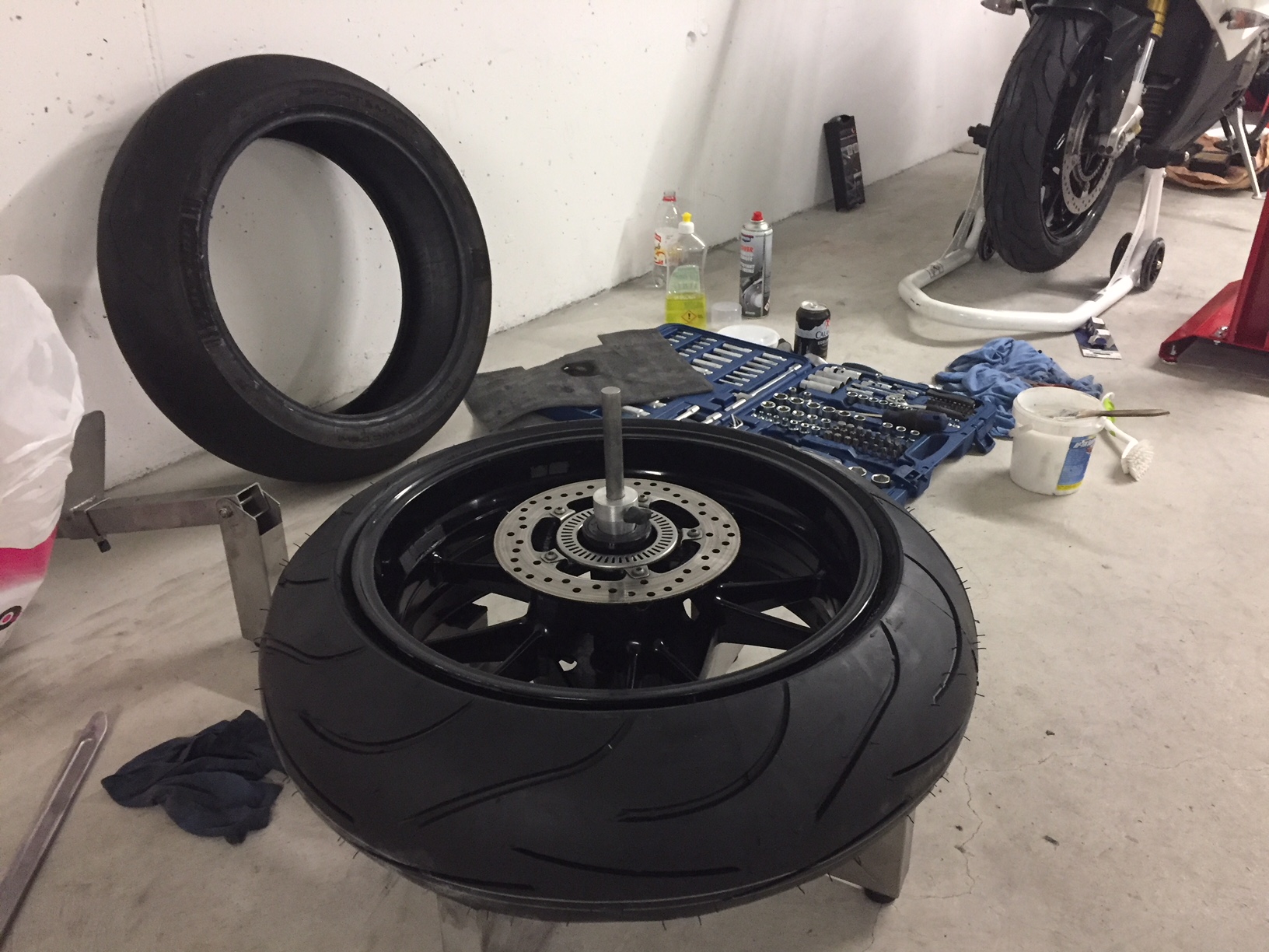 Was für ein Unterschied bei der Montage der Michelin Pilot Power 2CT: gut eingeschmiert flutsche die erste Flanke jeweils geradezu wie von selbst übers Felgenhorn und die zweite war mit dem Pitlane-Gerät eine wahre Freude. Ein Bekannter, der gerade nebenan bei seinem Handschneepflug einen Ölwechsel machte, kam herüber, um diesem kritischen Moment beizuwohnen. Ich glaube, er war ein bisschen skeptisch und glaubte nicht so recht daran, dass das mit einem Handgerät so einfach funktioniert. Aber bis er da war, machte es bereits "flutsch" und der Reifen war drin.