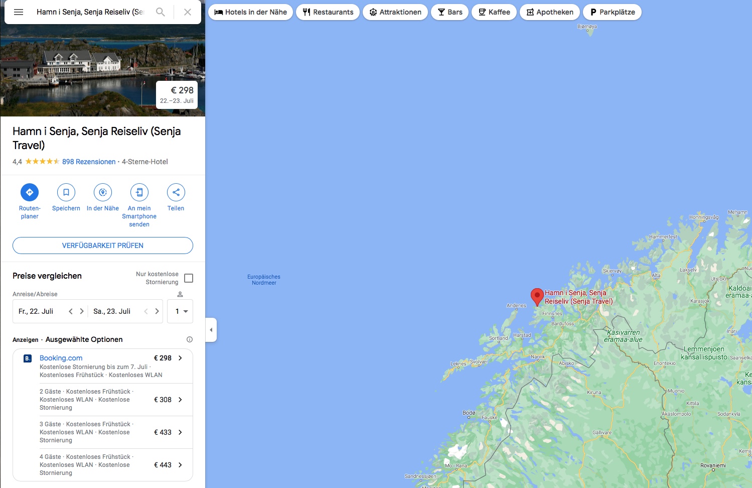 Hamn i Senja ist wirklich sehr teuer. Das hätte ich für die Lage auch bezahlt, es war aber bei meinem Anruf am Nachmittag schon nur noch ein Minizimmer mit Blick (only) auf das 2m entfernte Nachbarhaus frei. Aber was soll ich in der Landschaft, der Umgebung, in dem Hotel bei dem Wetter in meinem Zimmer außer schlafen? Fotos unter #808, ab Foto Nr. 2020_0724_360.