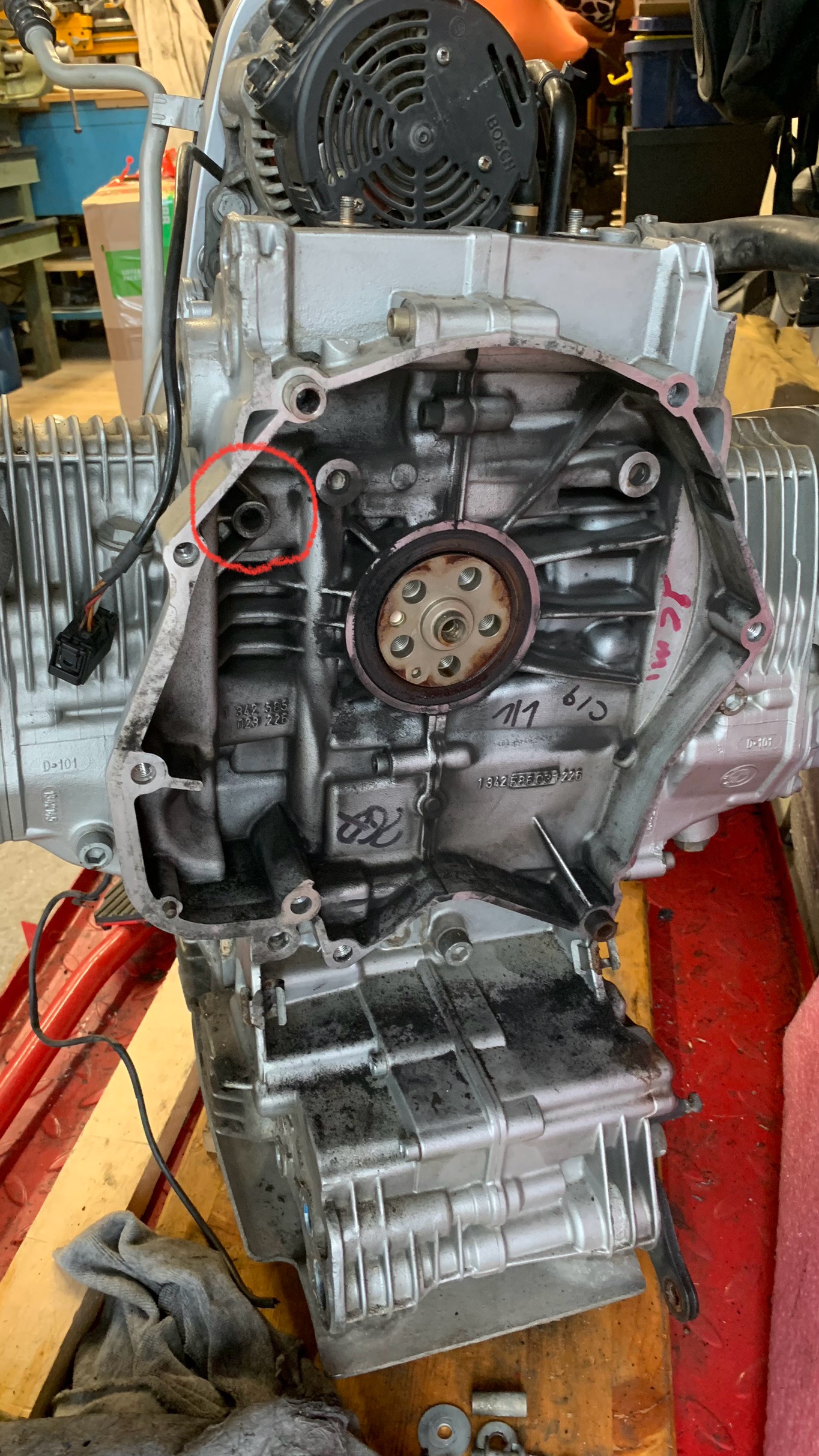 Im Bild ist das Gegenstück im Motorgehäuse markiert.