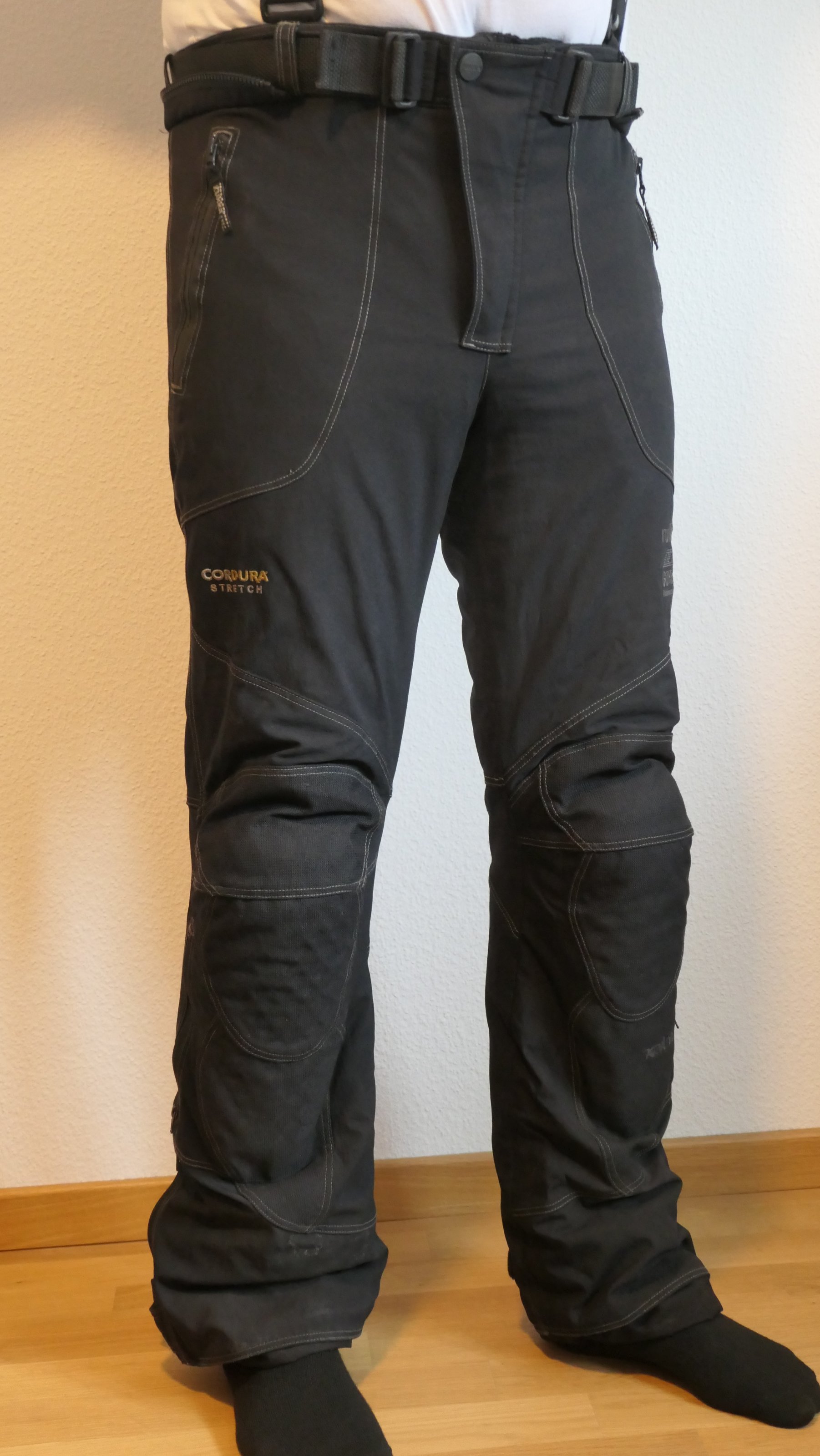 Mit allen Protektoren, Thermo-Innenhose und Rukka-Hosenträgern.