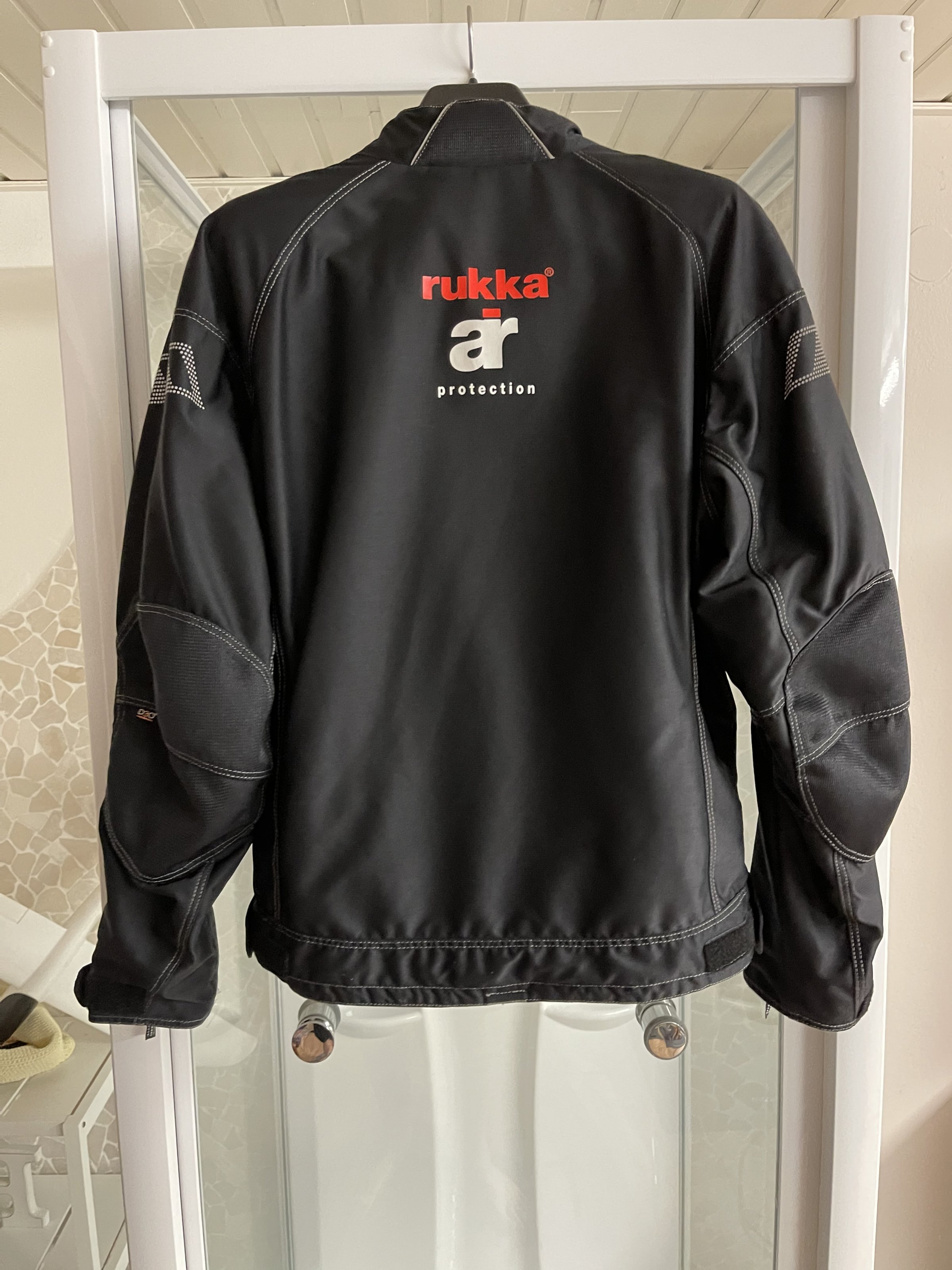 Rückenprotektor ist nachrüstbar, Schulter, Ellbogen, Knie und Hüfte sind mit Rukka D30 Protektoren bestückt.