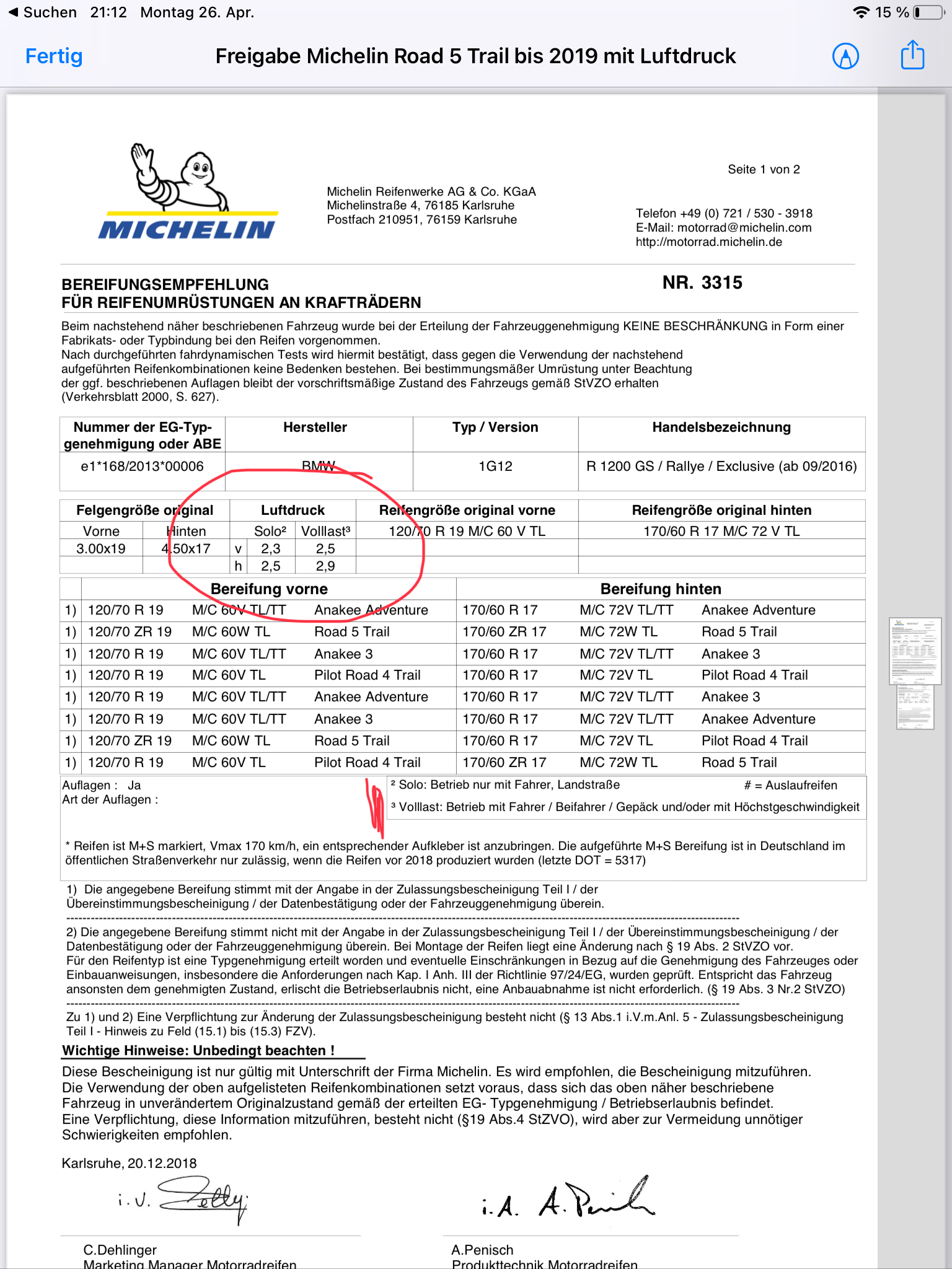 Luftdruck war fälschlicherweise auf 2,9 bar für ca. 3000km, also für Sozia und Vollgasfahrten. Kann das schon der Grund für die Bildung sein? Habe gestern dann den Luftdruck für den Solobetrieb angepasst auf 2,5bar. Beide Werte beziehen sich auf die Freigabe seitens Michelin.