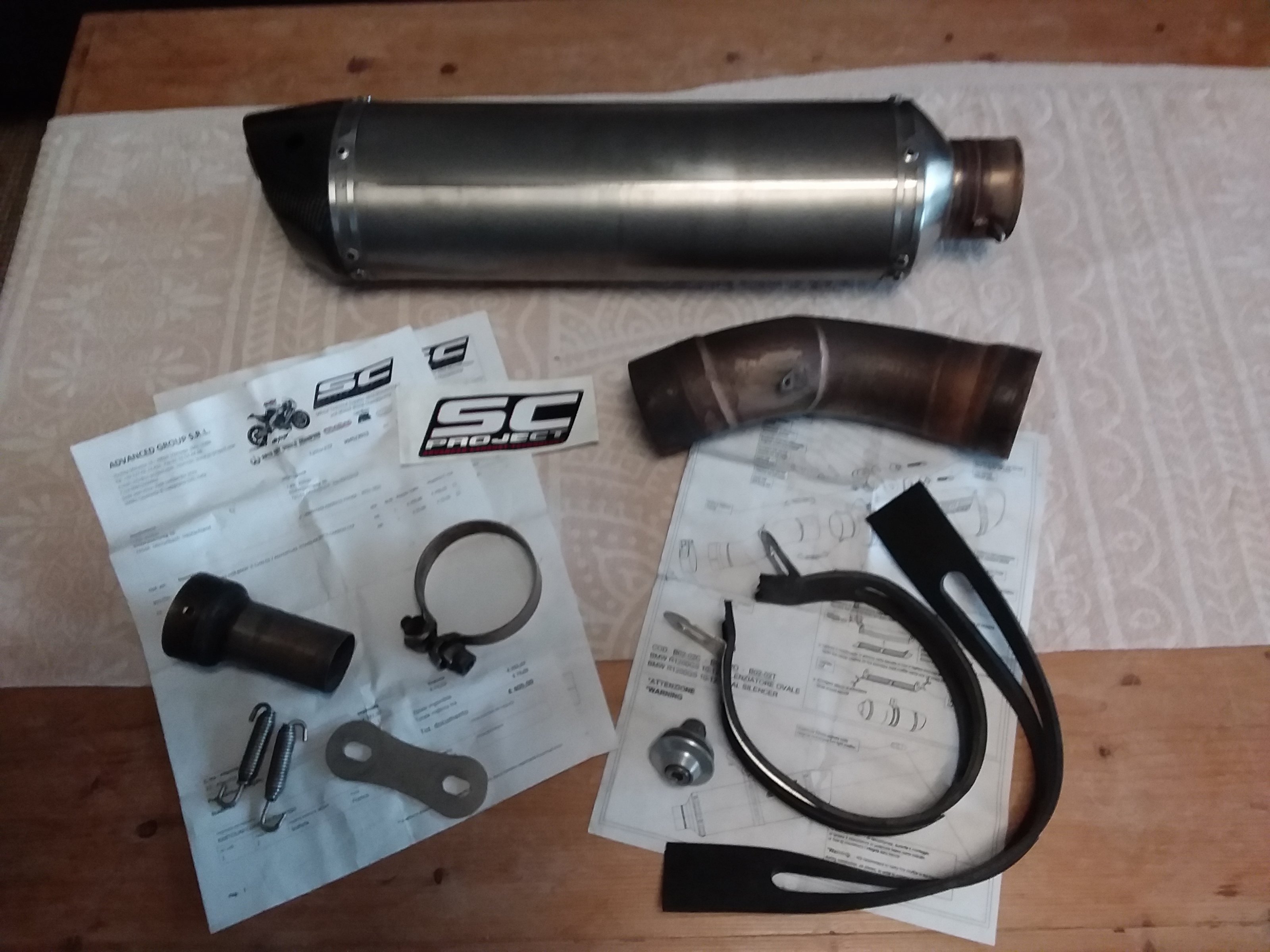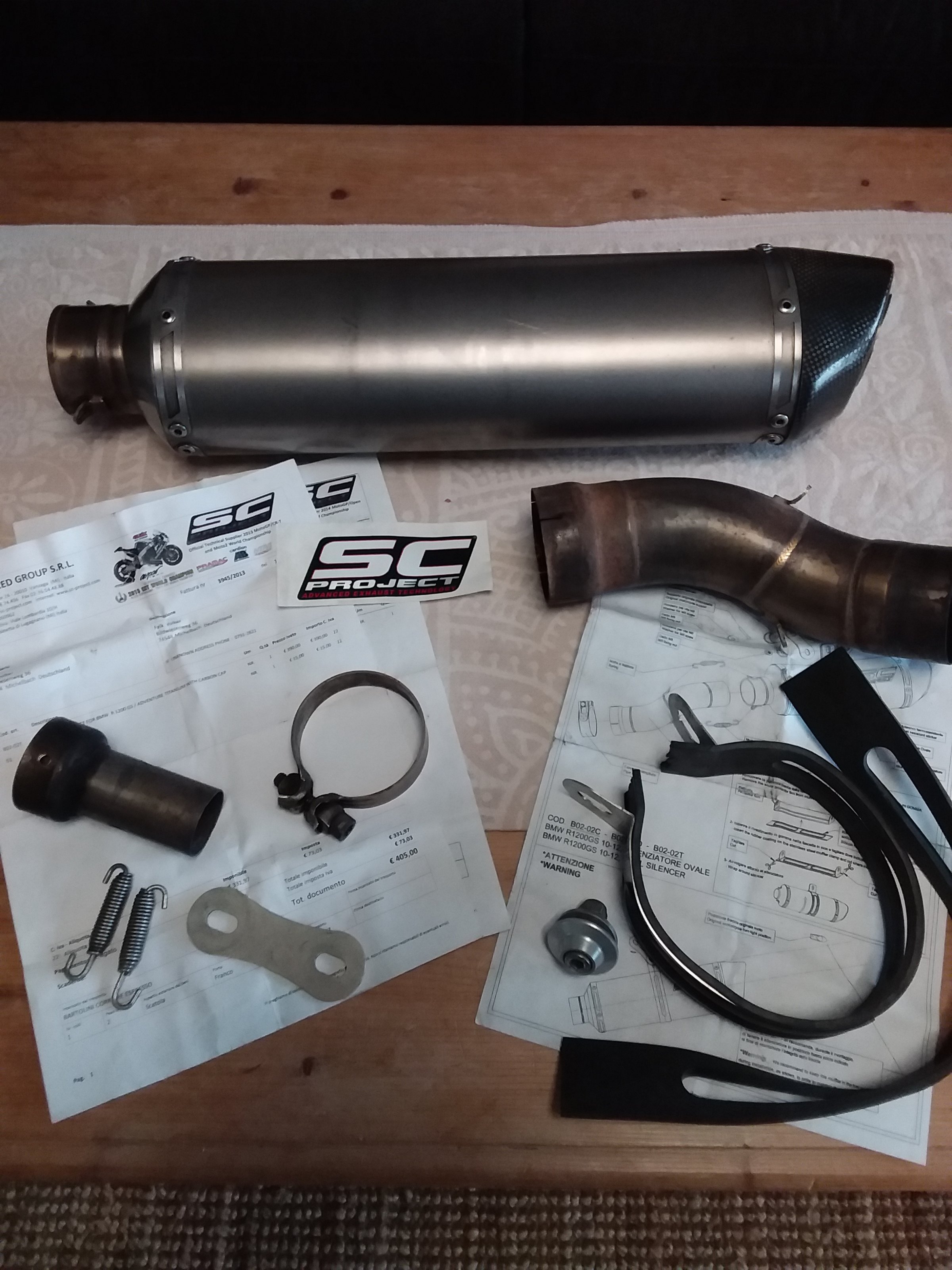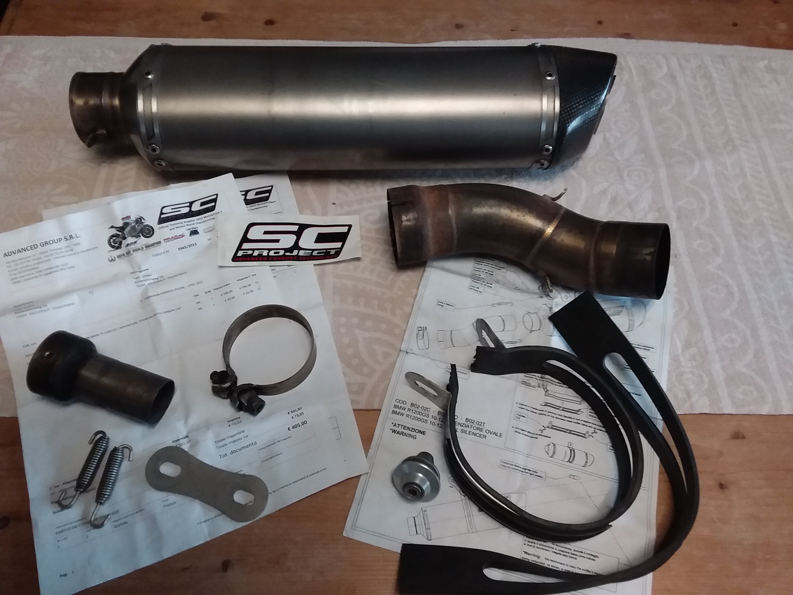 ich möchte hier einen gepflegten SC-Projet Titan Auspuff mit Carbon Endkappr für die BMR R1200GS und Adventure TÜ Baureihe (Bj. 2010 bis 2013) zum Kauf anbieten. Der Auspuff hat aufgrund der verwendeten Materialien ein sehr geringes Gewicht (ca. 4kg leichter als das Original). Um den Sound zu variieren, verfügt der Auspuff über zwei verschiedene DB-Killer oder kann ganz entnommen werden. Da der Auspuff über eine E-Nummer verfügt (siehe Bilder anbei), ist einer der wenigen, zulassungsfähigen Varianten am Markt, die eine nachweisliche Drehmoment und Leistungssteigerung herbei führen und dabei legal und ohne zusätzliche Tüv-Abnahme oder Eintragung betrieben werden dürfen.