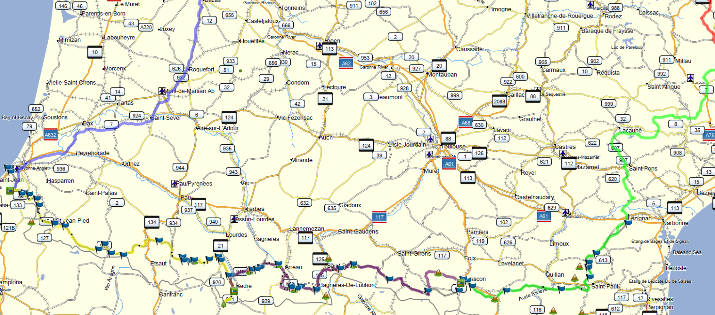 Die Fahrt durch die Pyrenaen würde ich aus Erfahrung mit Max 350 km veranschlagen danach bist du schlapp.
