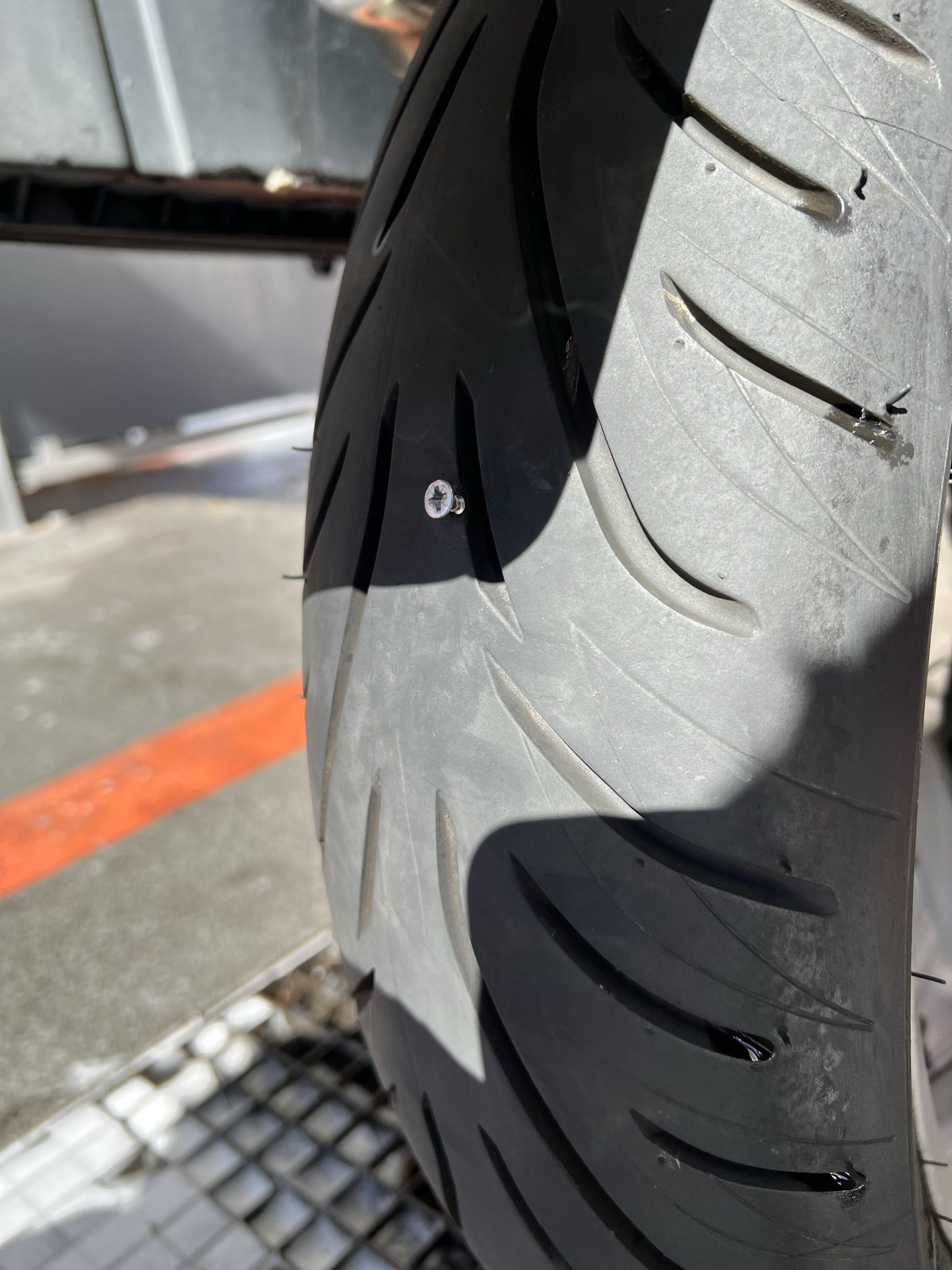 ein Kumpel hat sich eine Schraube in den Hinterreifen gefahren (siehe Bild) - was tun? Kann man den Reifen nicht einfach flicken, oder wird ein Austausch des Pneus empfohlen? Was sagen die Experten?