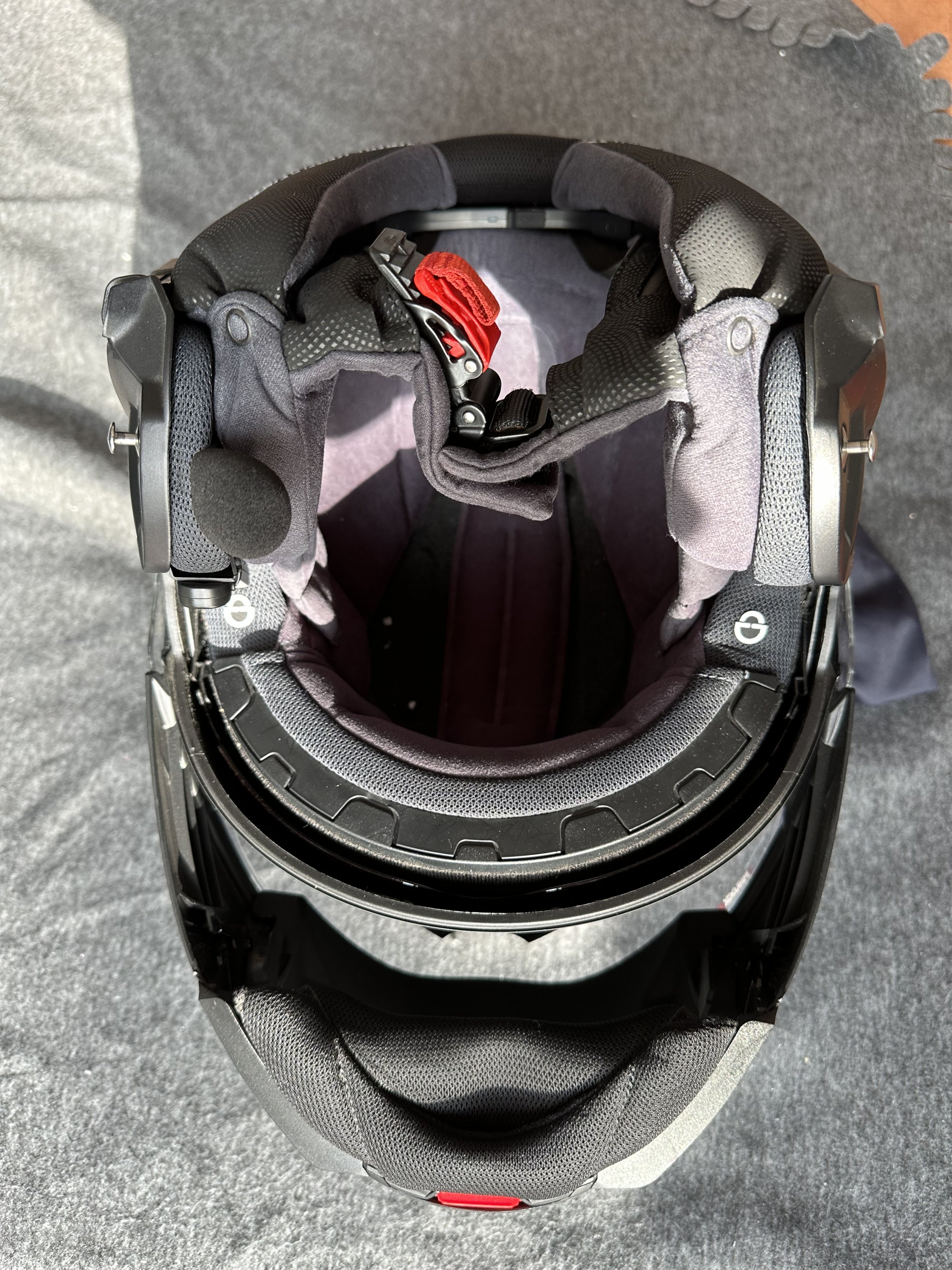 In dem Helm ist das original Sena SC10UA eingebaut. Den Schaumstoff um das Mikrofon habe ich neu aufgezogen.