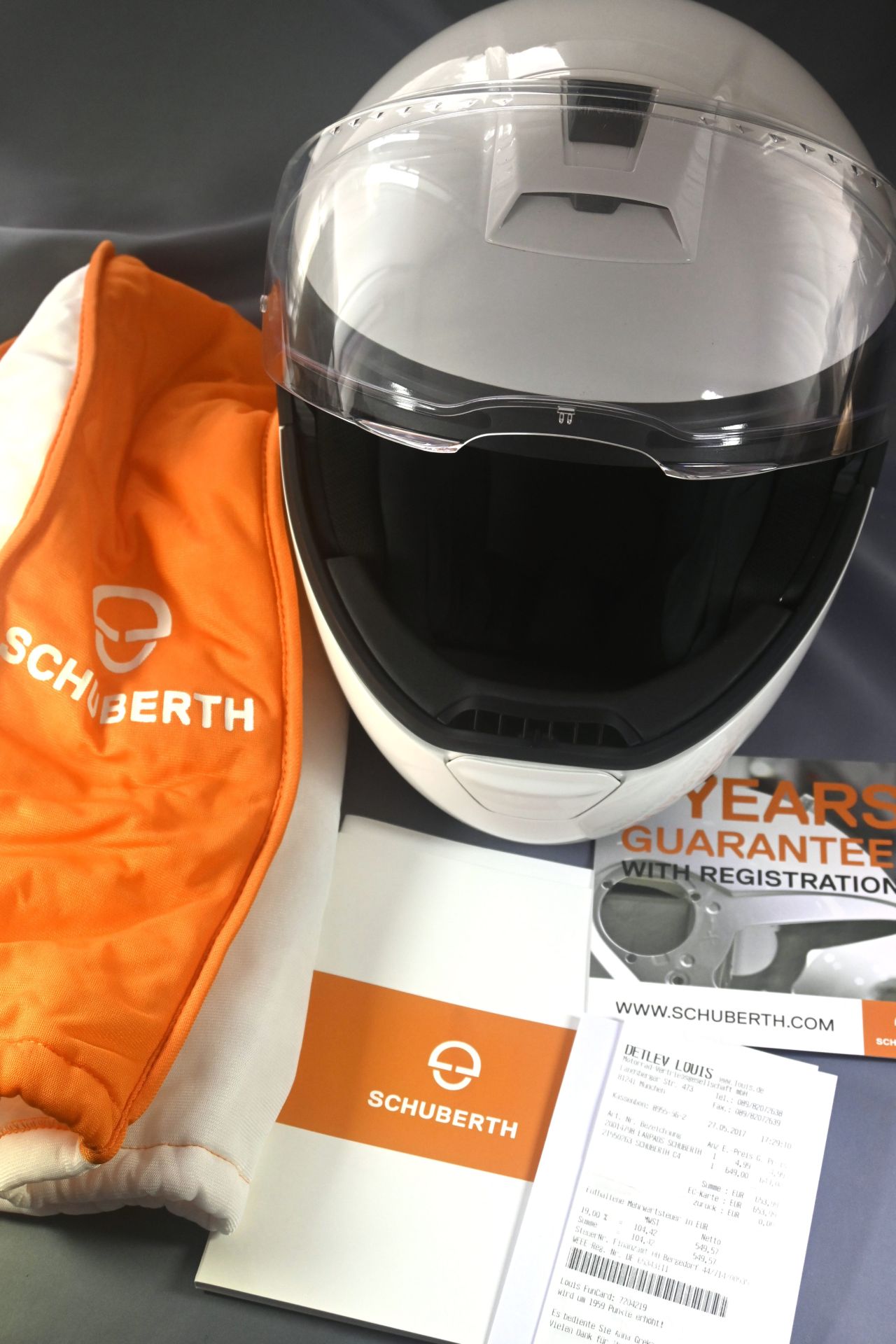 Der Helm ist unfallfrei und unbeschädigt mit Helmbeutel, etc. im Originalkarton. Der Helm hat noch 2 Jahre Garantie von Schuberth (die Originalrechnung von Louis in München liegt bei). Nichtraucherhaushalt.