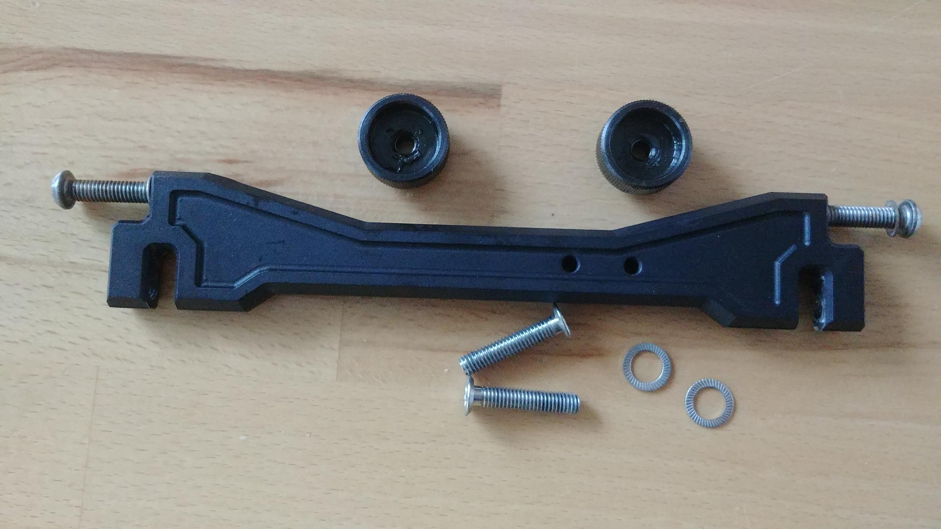 Da ich auf eine kurze Scheibe umgestiegen bin, brauche ich den Versteller nicht mehr. Schwarz eloxiert, alle Schrauben dabei. Die großen Fixierschrauben haben auch bei mir etwas Flugrost angesetzt, scheint wohl am Material zu liegen. Die Drahtbürste und Ballistol haben aber gut geholfen.