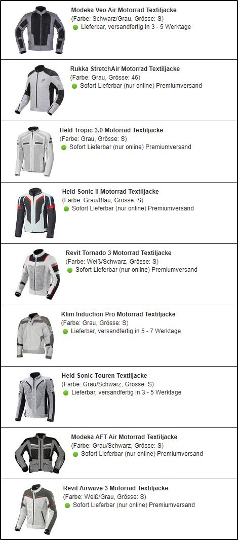 Sommerjacken bin ich auch am suchen / überlegen, da mir meine Hakuna eben ab 30°C zu warm wird. Im Anhang mal meine Liste. Auch die Held steht zur Auswahl