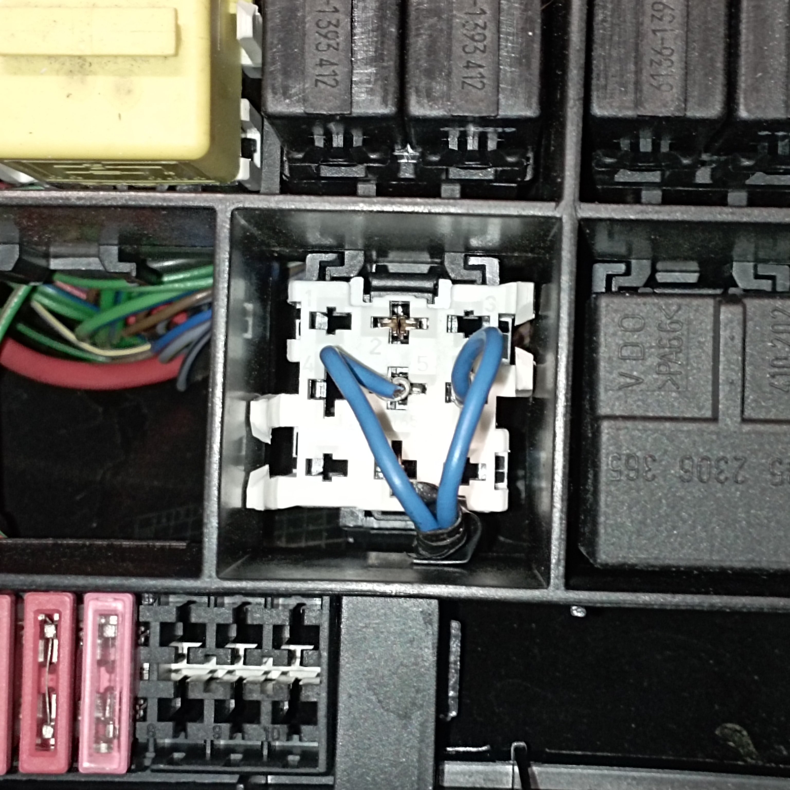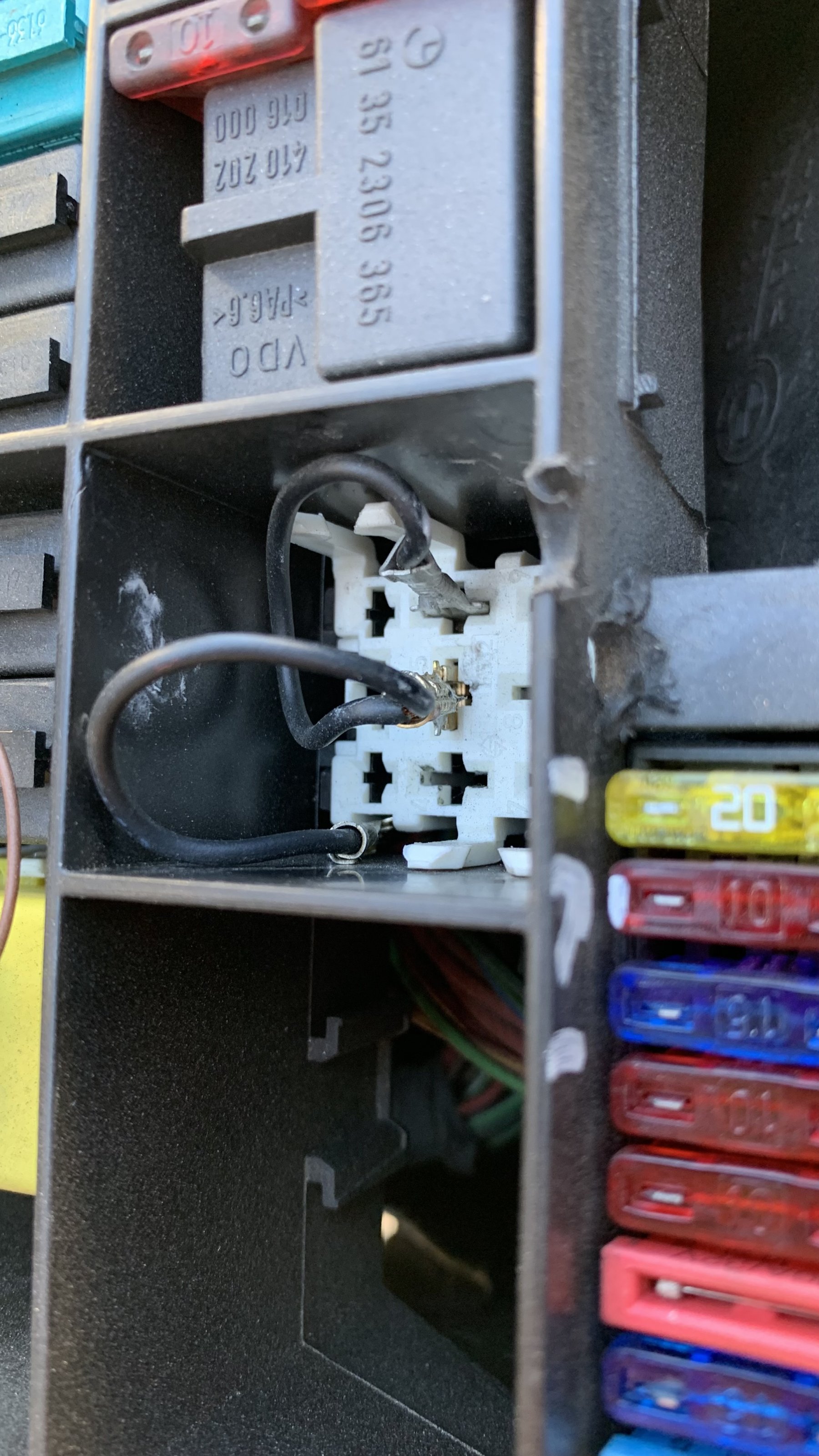 Heute hatte ich die Sitzbank runter und habe im Sicherungskasten (siehe anderen Thread "Stecker") etwas nachgesehen, dabei ist mir aufgefallen, dass im Steckplatz des Codiersteckers eine selbstgebastelte Brücke (evtl. sogar mit nem Poti, hab die Verklebung nicht geöffnet?!) hängt.