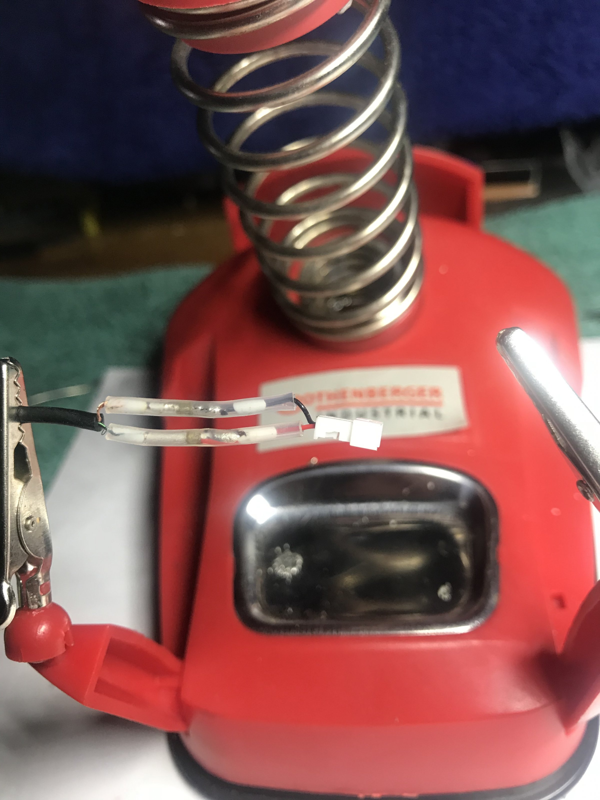 Von den lackierten Litzen den Isolierlack abbrennen, alle blanken Enden verzinnen und in die Lötverbinder schieben. Vorsichtig heiß machen, bis das Lot im Verbinder flüssig wird und die Litzen verlötet. Gleichzeitig dichtet der Schrumpfschlauch mit der weißen Masse an den Enden die Verbindung ab. Nicht unpraktisch die Dinger.