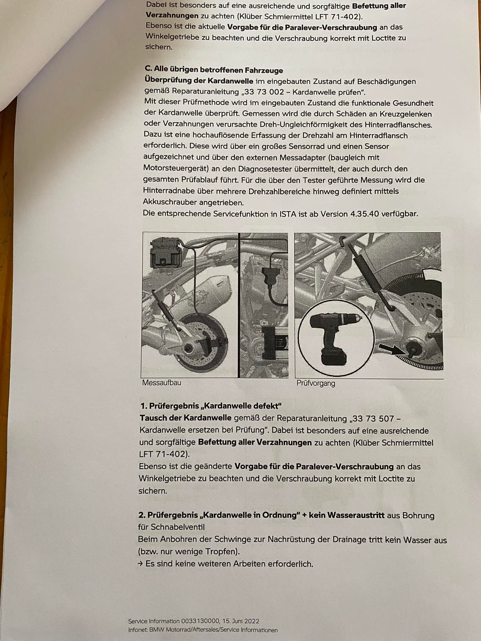 Meine 05 /2015 wird auch dann irgendwann kontrolliert. Ich bin nur gespannt welche Rückmeldungen von der Aktion dann hier eingehen.Schöner BMW-Satz: Mit dieser Prüfmethode wird im eingebauten Zustand die funktionale Gesundheit der Kardanwelle überprüft.