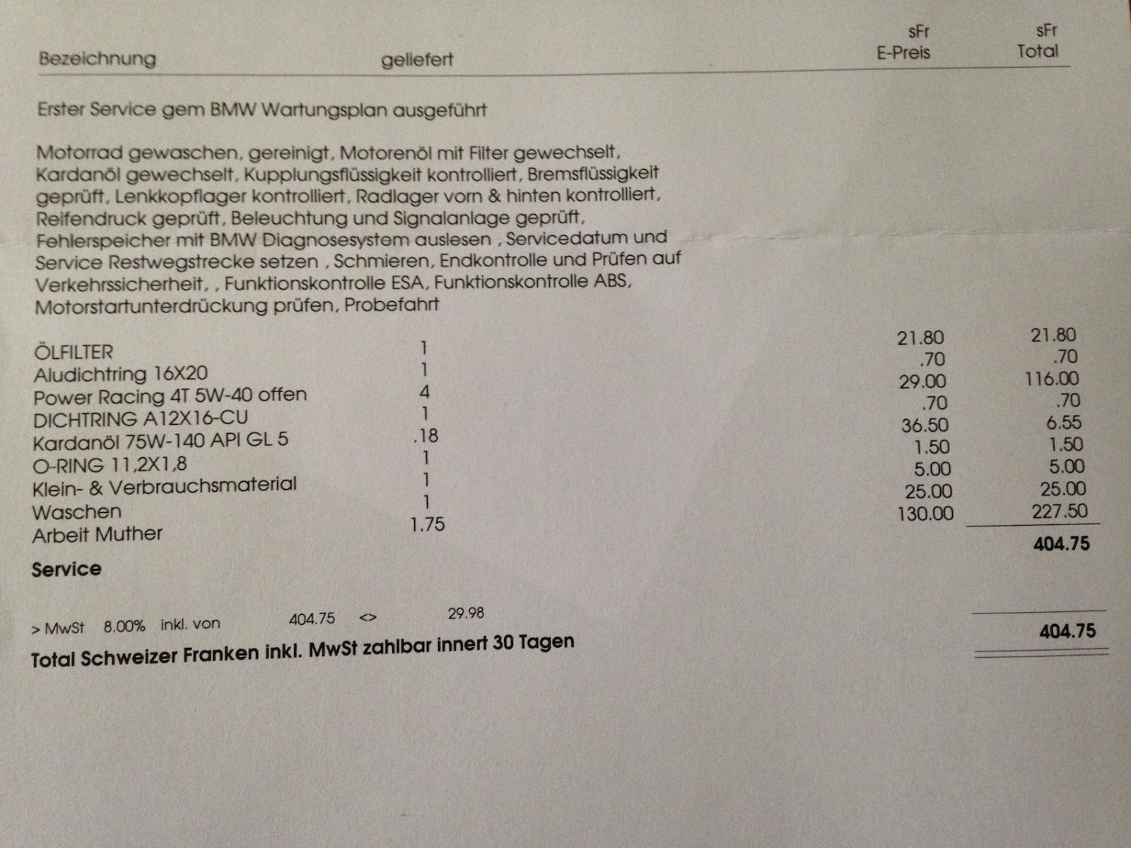 hatte meine GS 1200 (EZ 04.04.13 BJ 12.12) letzte Woche beim BMW Service (5056 Km) und habe folgende Rechnung erhalten: