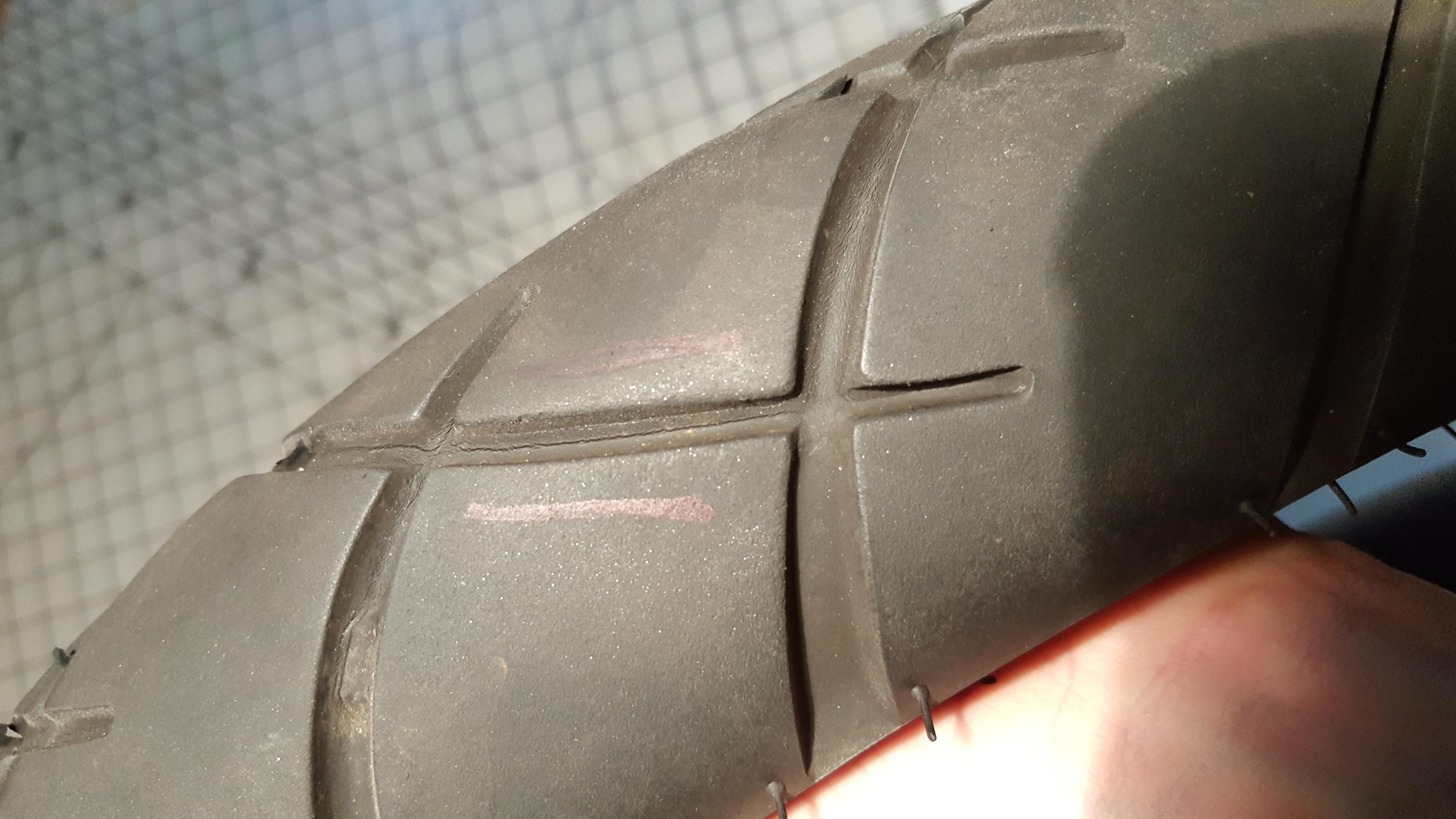 ich habe an meinem ca. 1 Jahr alten Trailsmart seltsame sichelförmige Abplatzer entdeckt. Es sind insgesamt 11 Stück recht regelmäßig auf der Lauffläche verteilt. Alle Sicheln oder auch Halbkreise zeigen in die gleiche Richtung.