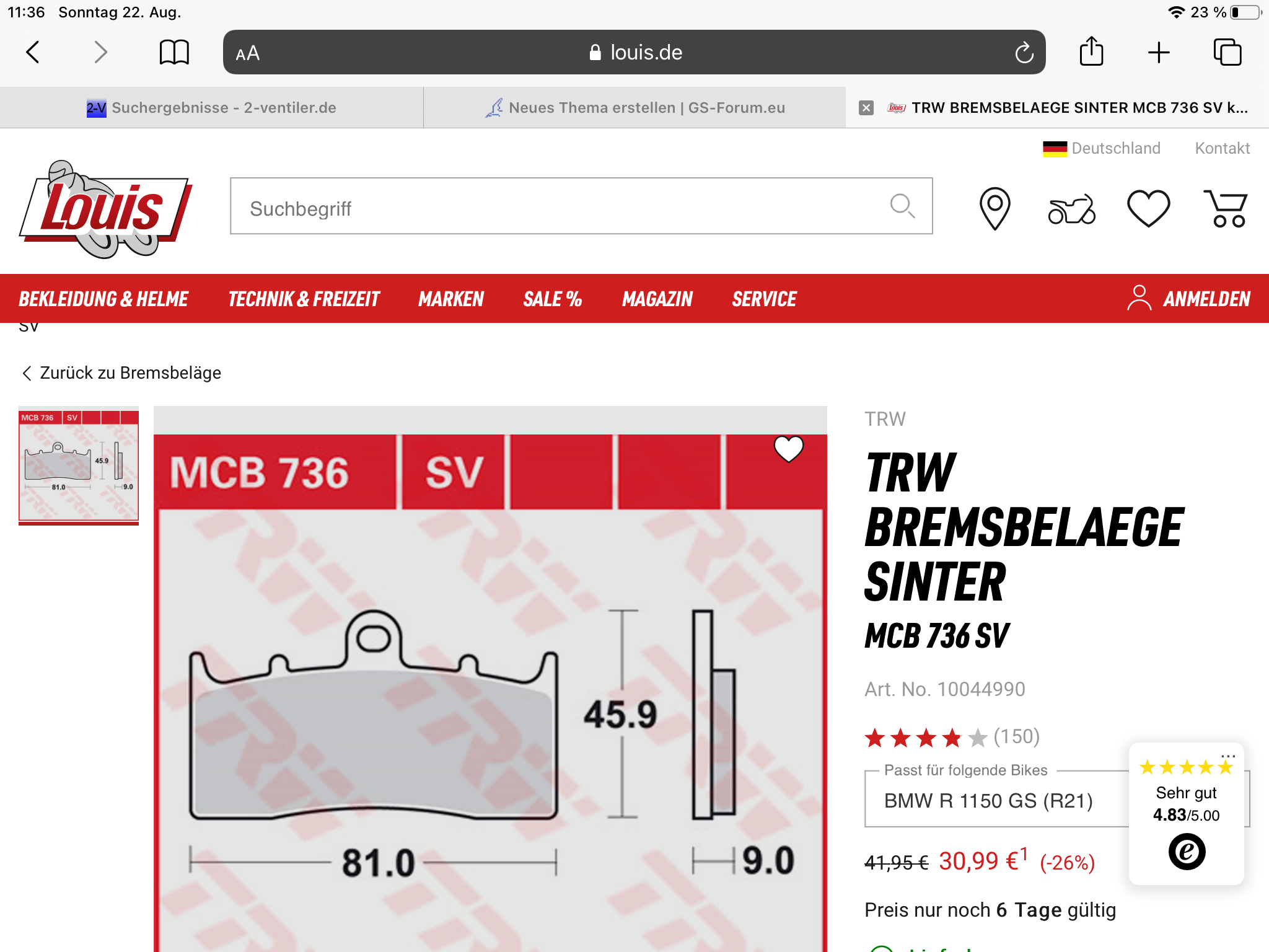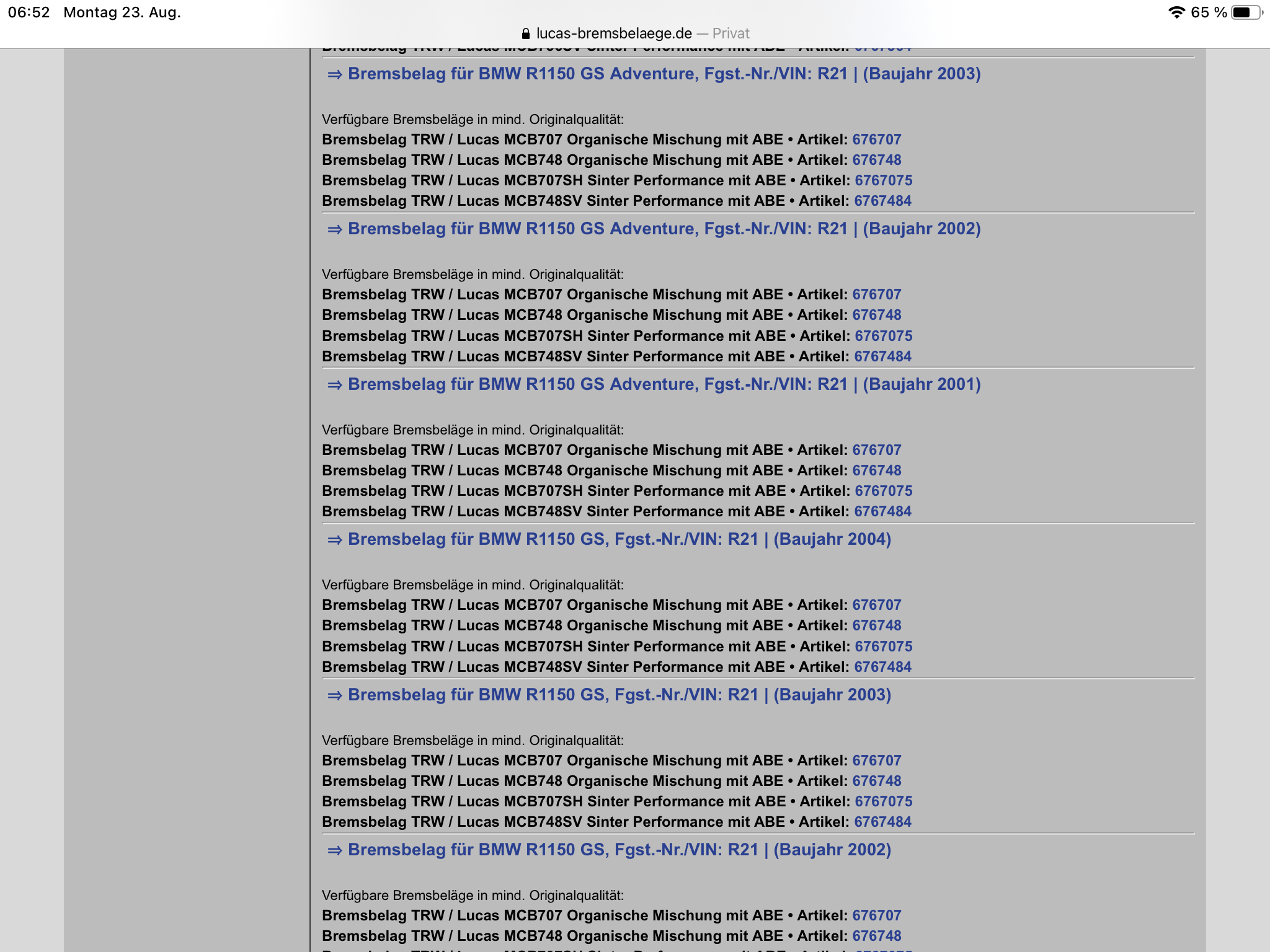 Meinung war ich auch und in der Typenliste bei Lucas wird immer der 748er Belag angezeigt, der 736er gar nicht (nur für die R, RS, R1100S und K1200), gehe ich aber über die Artikelnummer in den Shop kommt auch hier die 1150GS