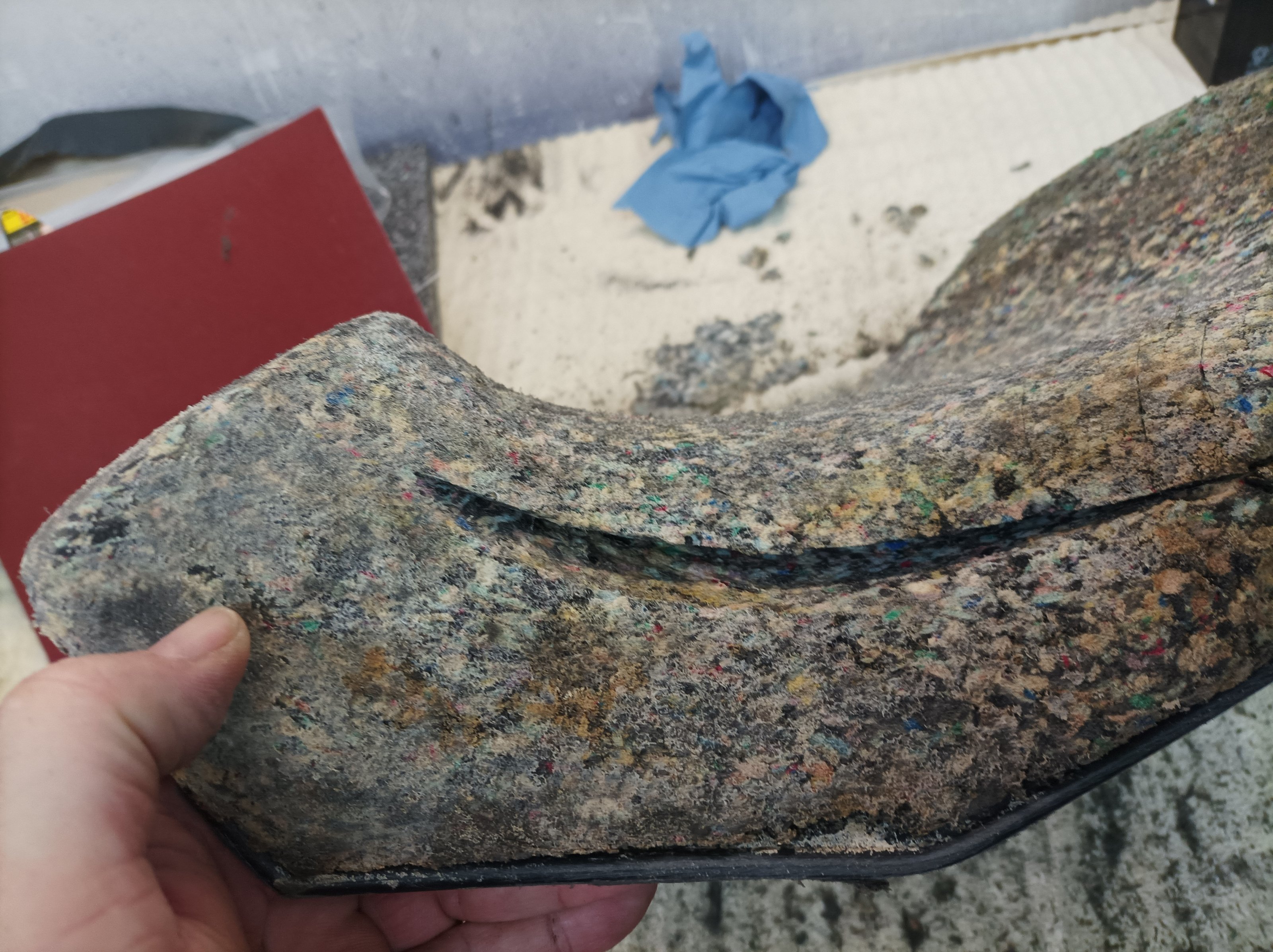 Anschliessend den Rohling grob zugeschnitten und angepasst. Materialstärke sind 2cm. Da ich den originalen Bezug wieder verwenden wollte, habe ich mich nicht getraut dickeres Material zu nehmen. Rückblickend wäre aber auch mehr gegangen.