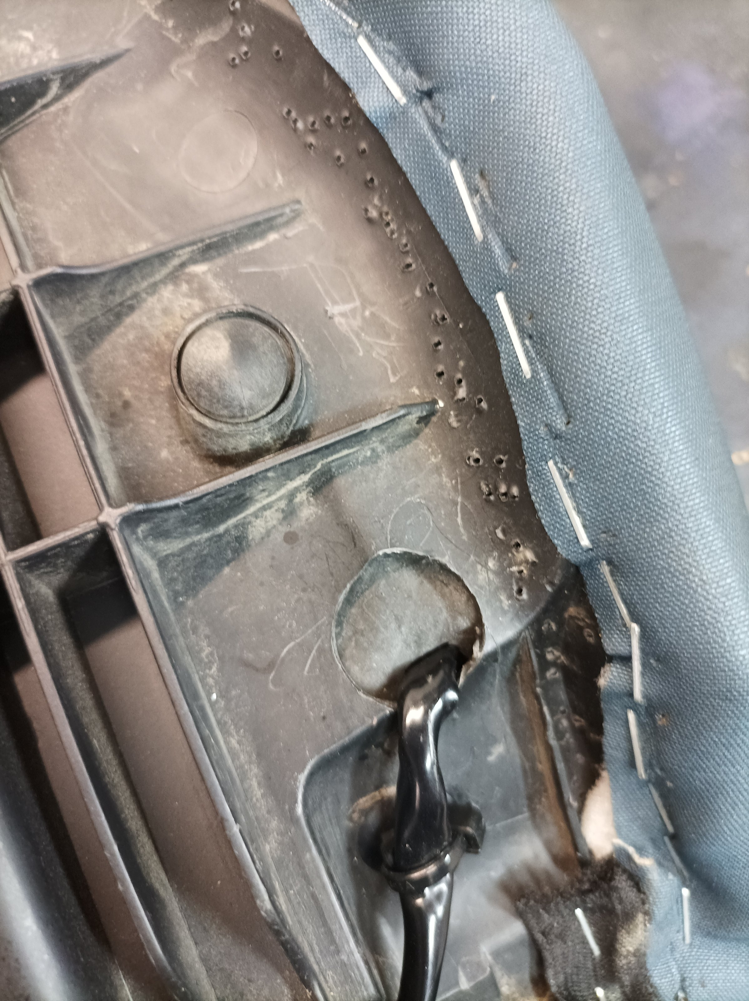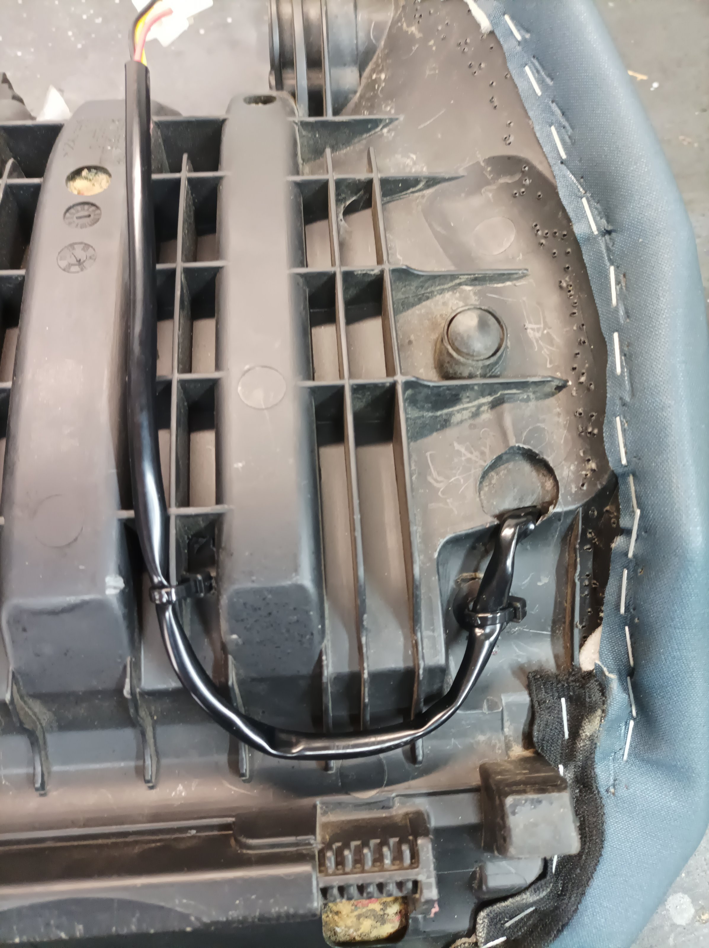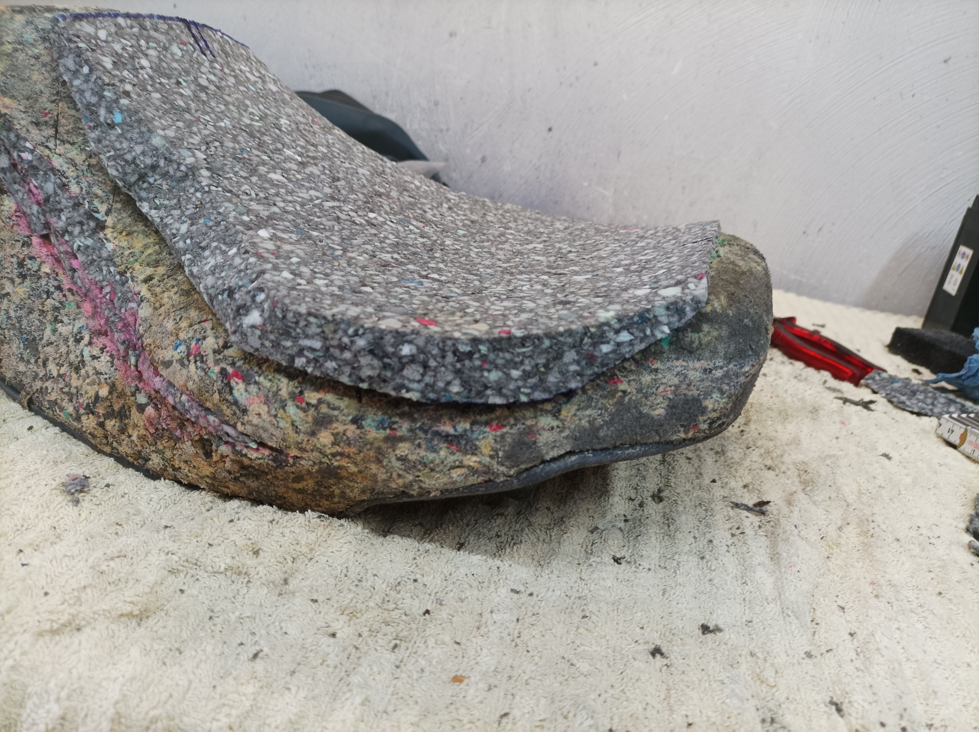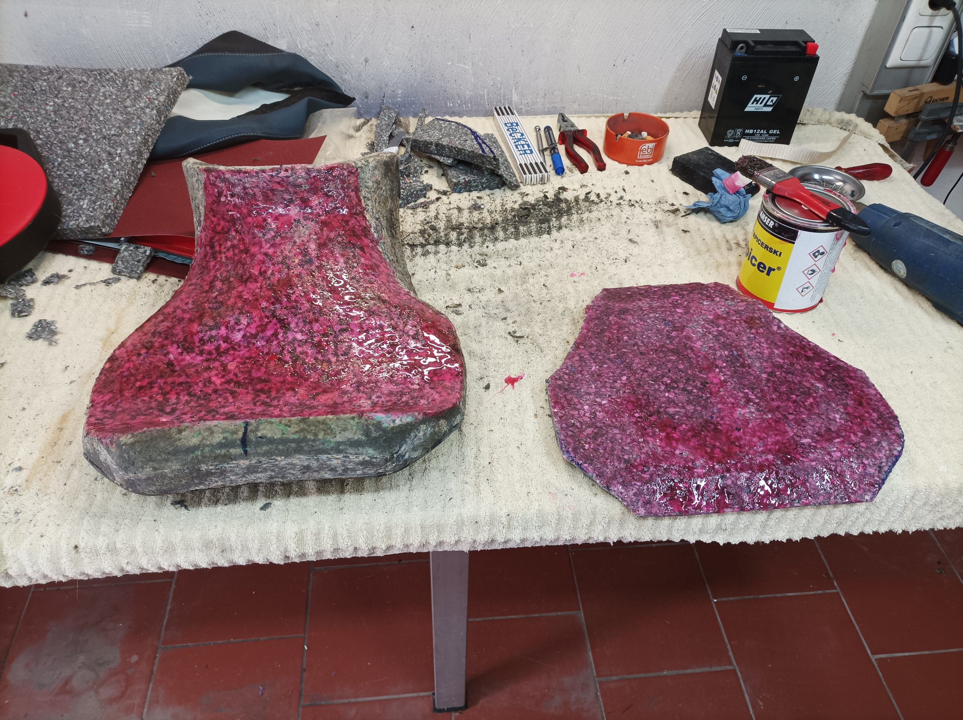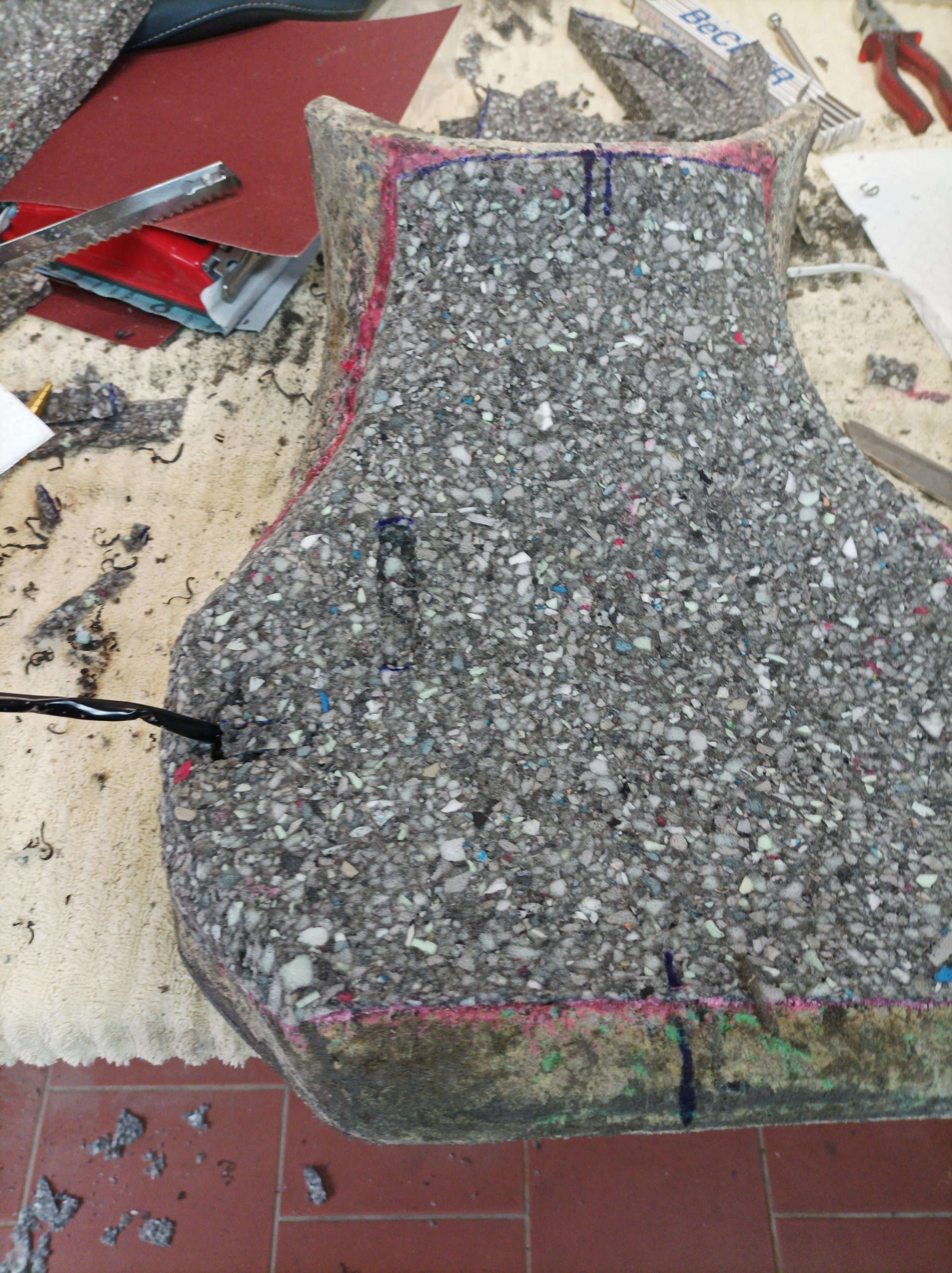 Nachdem die Passform soweit stimmte, habe ich geklebt und anschliessend mit Elektromesser und Schleifklotz die richtige Form hergestellt. Auf dem zweiten Bild ist bereits die Zuleitung für die Sitzheizung zu sehen. Da der Bezug einmal runter war und der nächste Winter bestimmt kommt.......