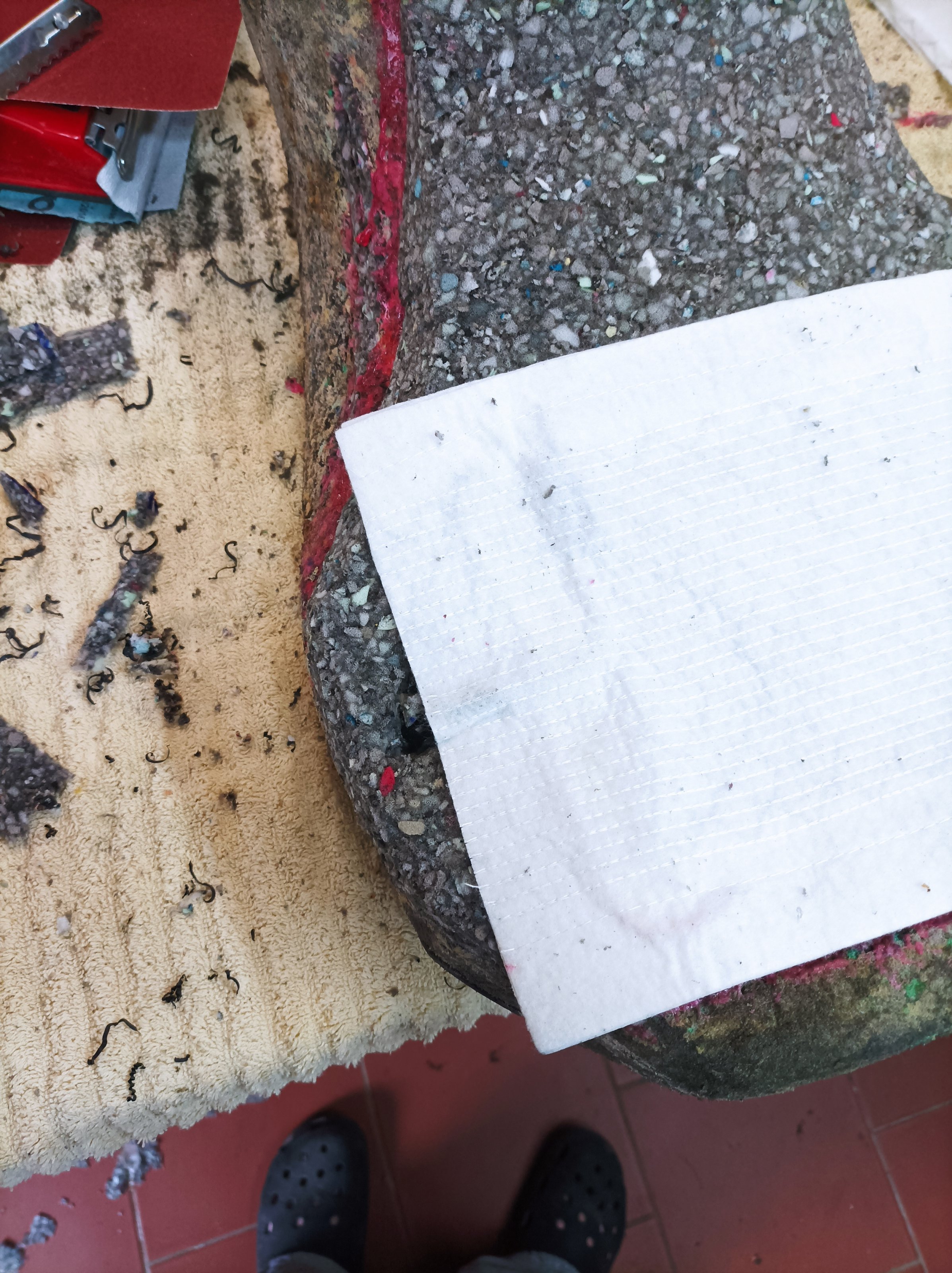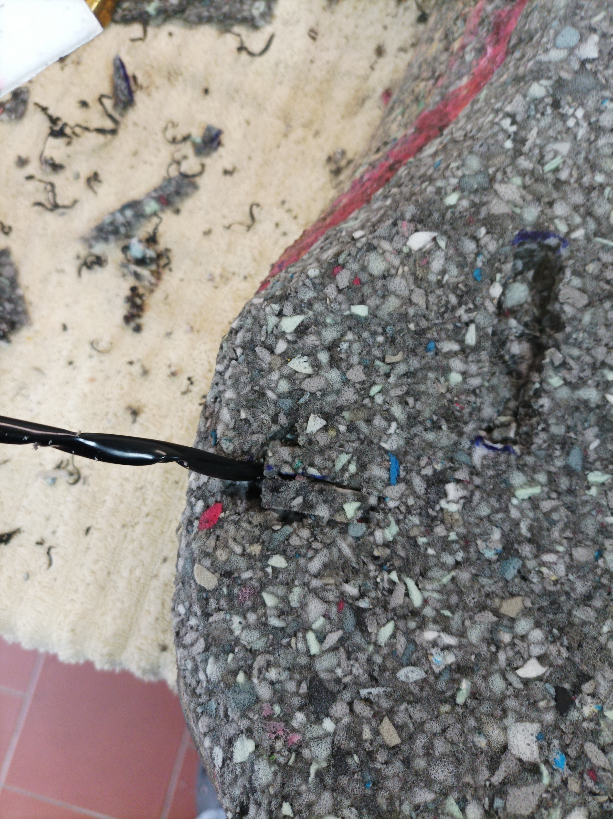 Die Aussparung im Polster ist für den Temp. Sensor der Heizmatte. Aus Erfahrung wusste ich, das dieser störend ist und sichtbar unter dem Bezug aufträgt. Mit der Aussparung liegt die Matte nun plan auf und nichts stört. Mit der neuen Kaschierung darüber ein perfektes Ergebnis.