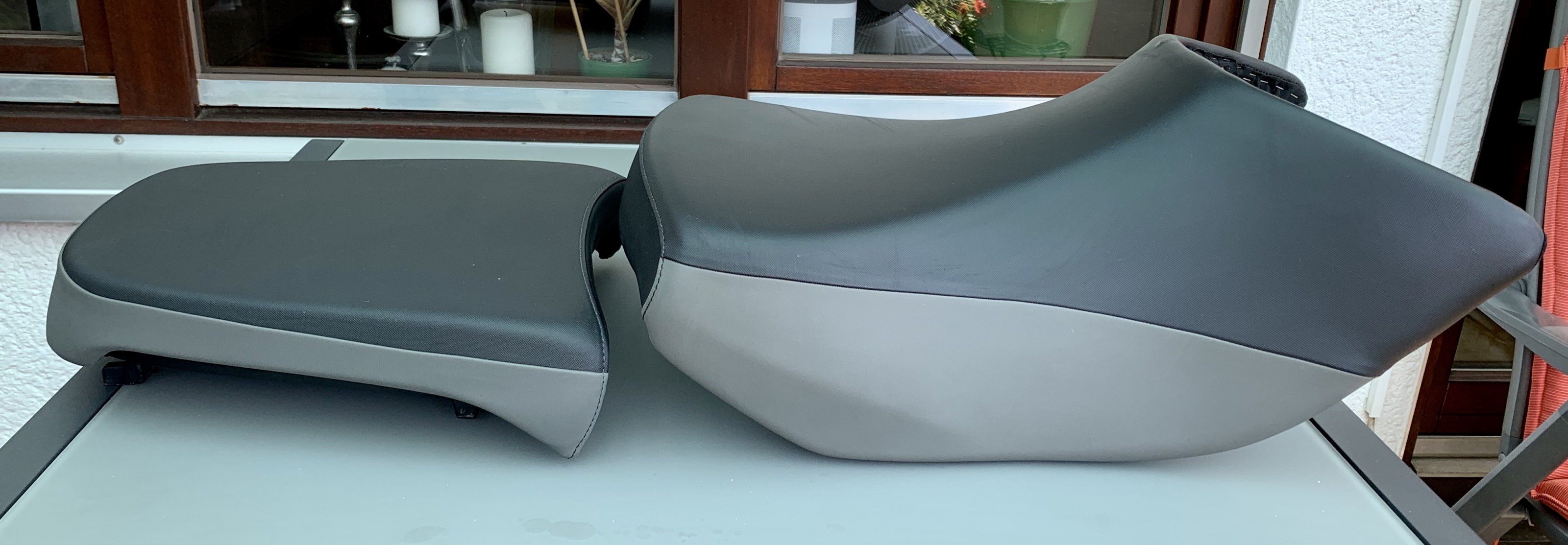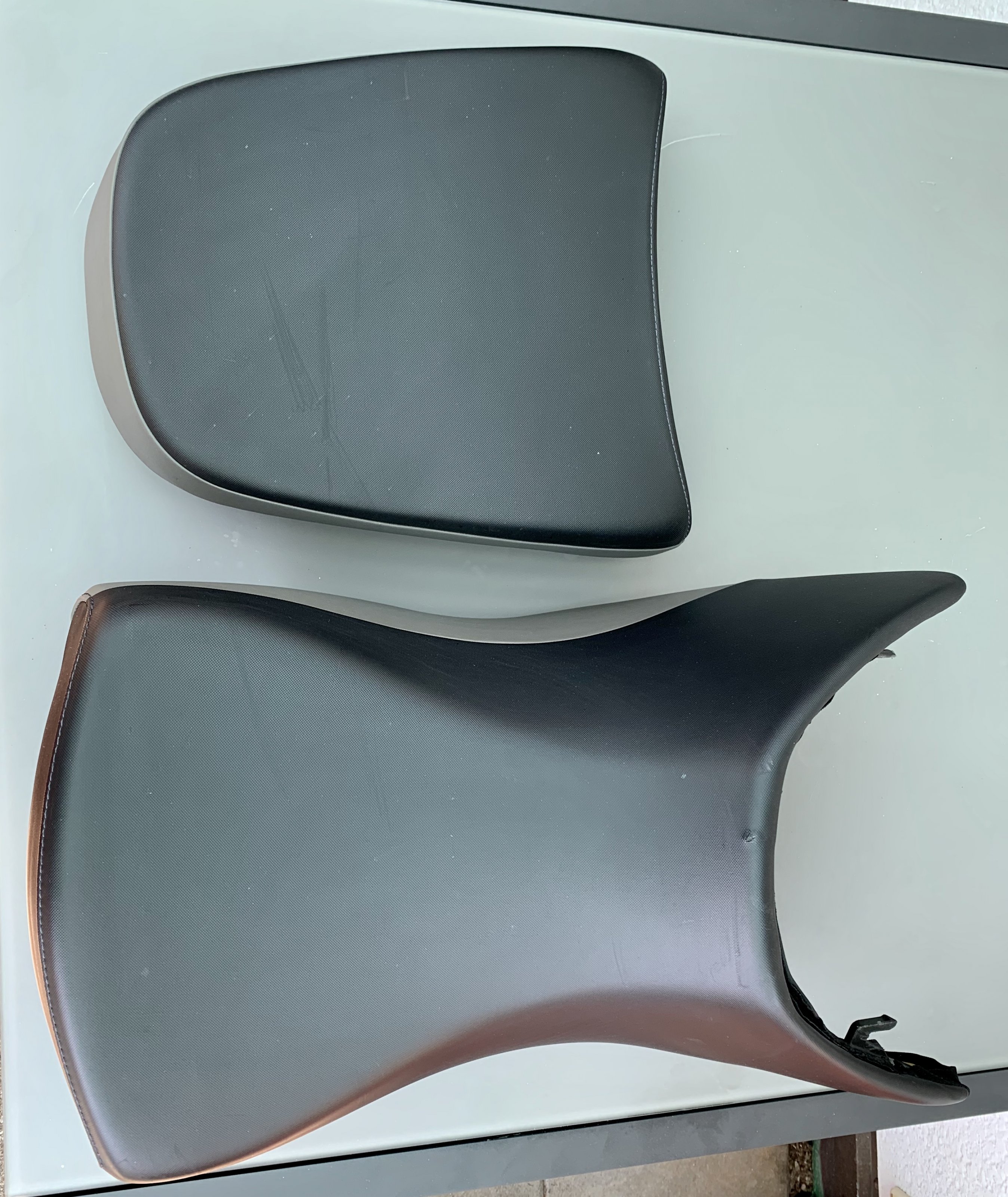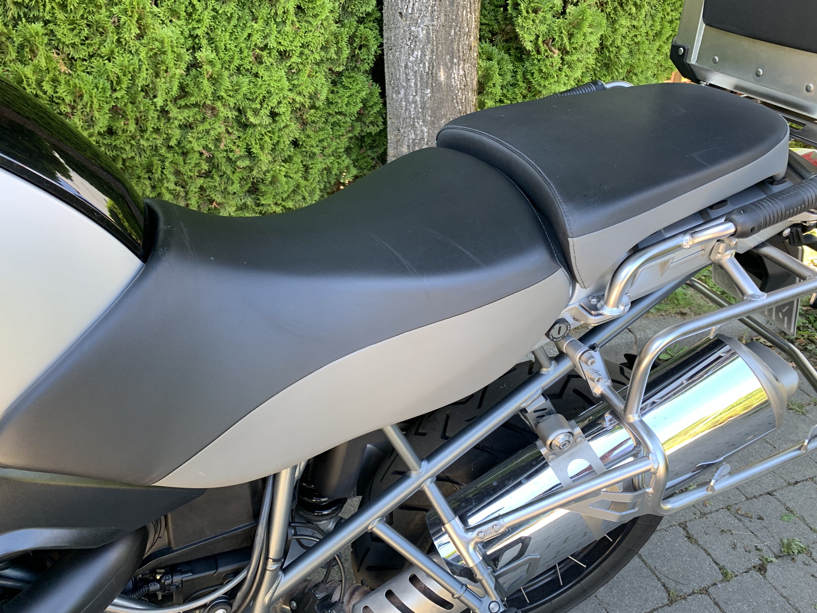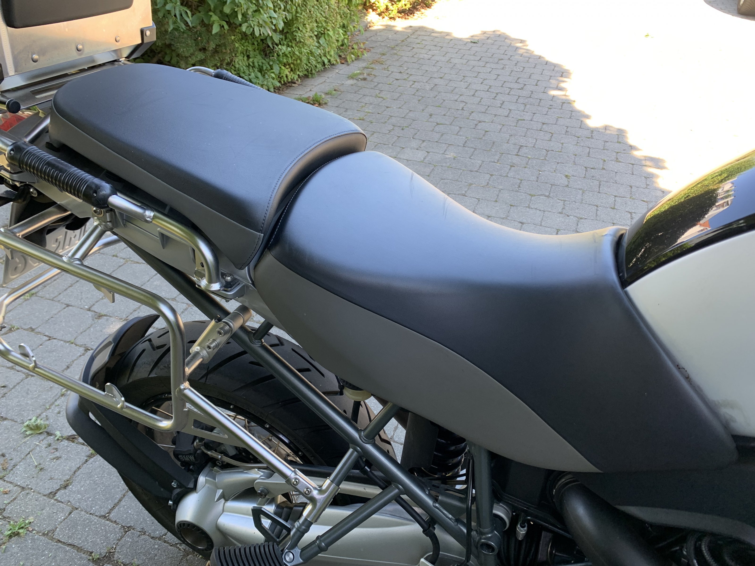 Sitzbank einer 2013er R 1200 GS Adventure (AC, K255); Fahrersitz hat eine kleine Delle im vorderen Bereich, Beifahrersitz hat ein winziges Loch (siehe Fotos); ansonsten keinerlei Schäden oder Defekte;