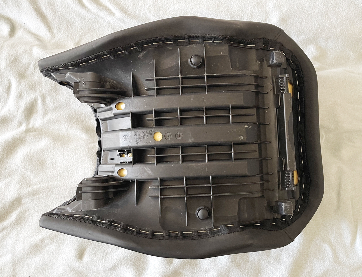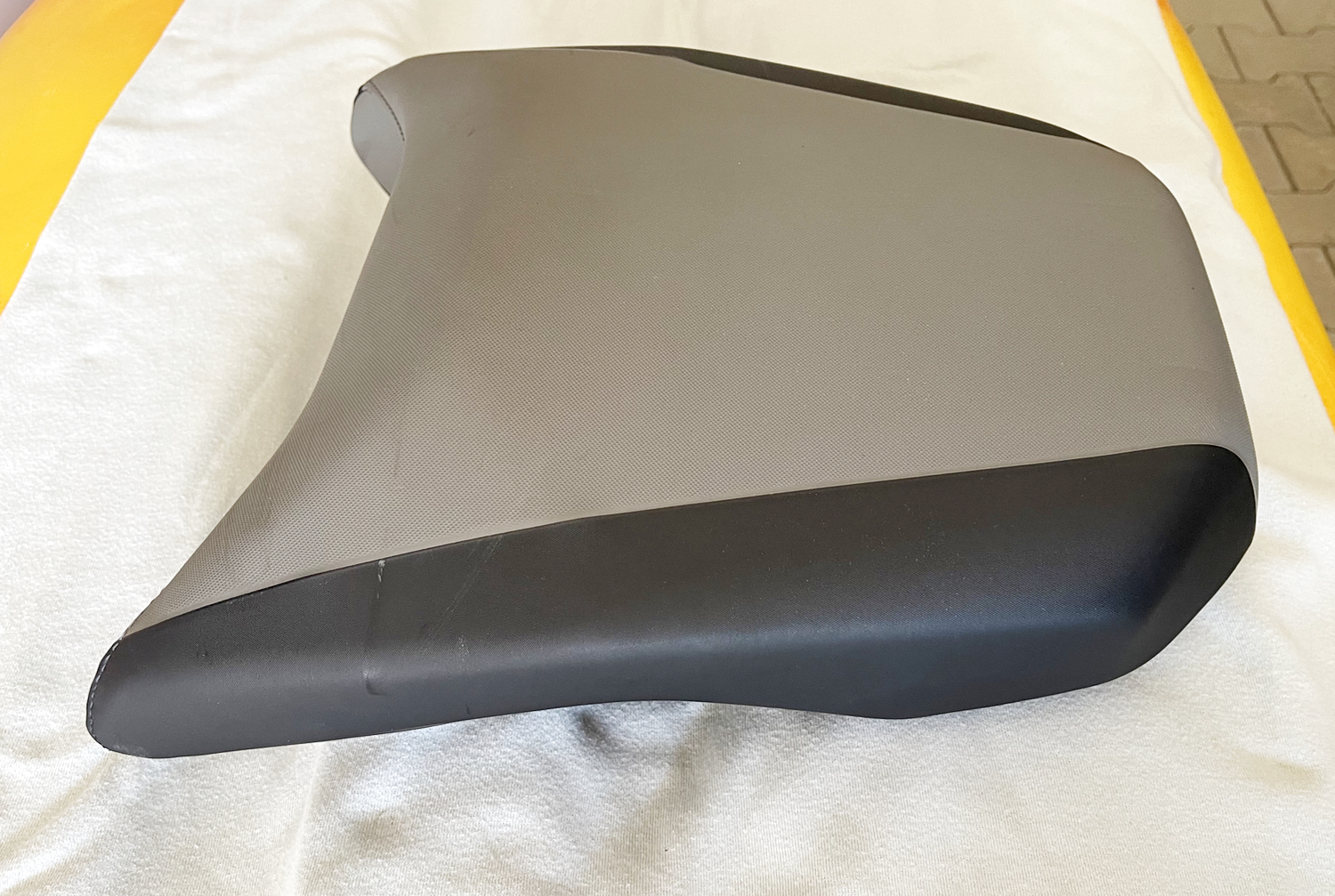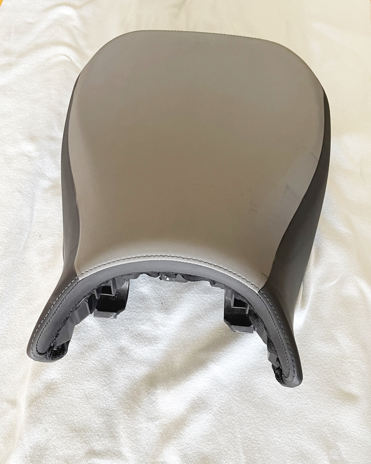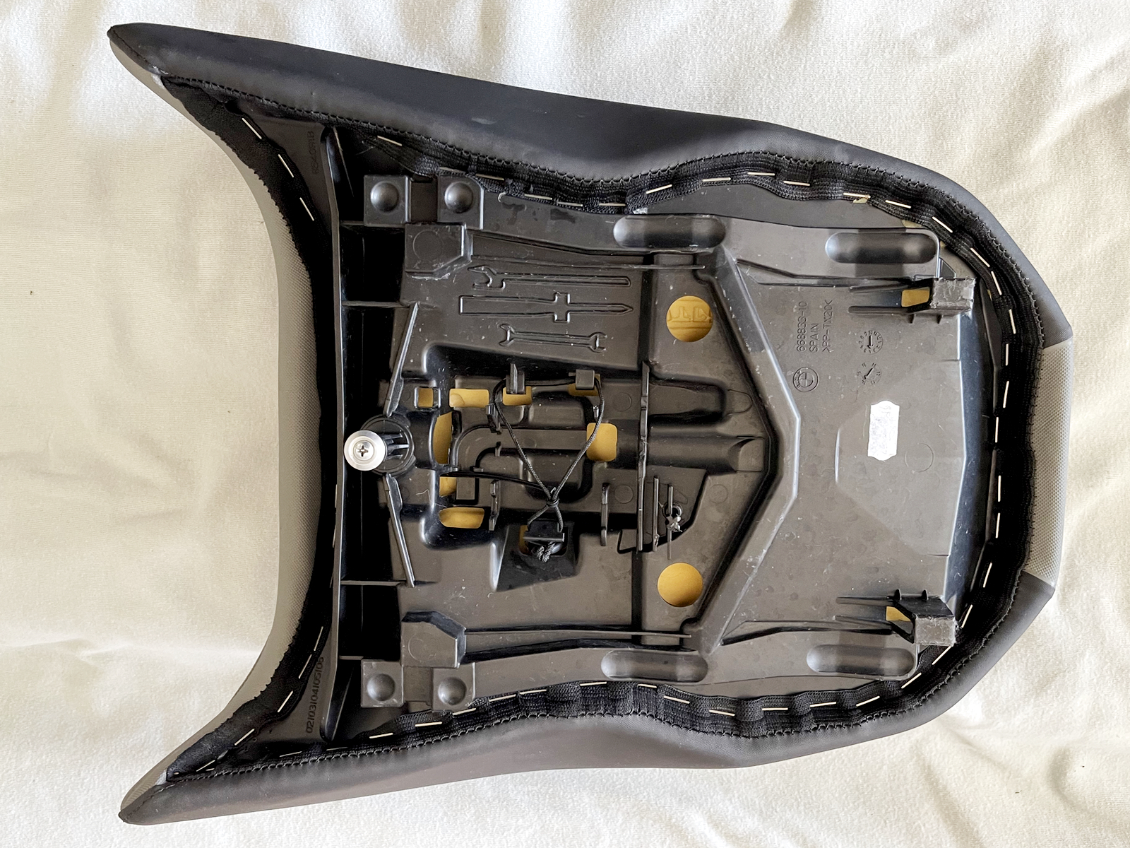 Auf der linken Seite haben beide Sitzpolster deutliche Gebrauchsspuren (aber keine Löcher oder Risse). Sieht fast so aus, als wäre der Vorbesitzer immer von rechts mit wildem Schuhwerk auf- und abgestiegen. Auch ist am Soziussitz der Plastiknippel für das Sitzbankschloss abgebrochen. Das wurde mit Schraube und Scheibe repariert. Klemmt beim abnehmen manchmal etwas, geht aber. Das Gummi für die Werkzeughalterung sollte auch ersetzt werden.