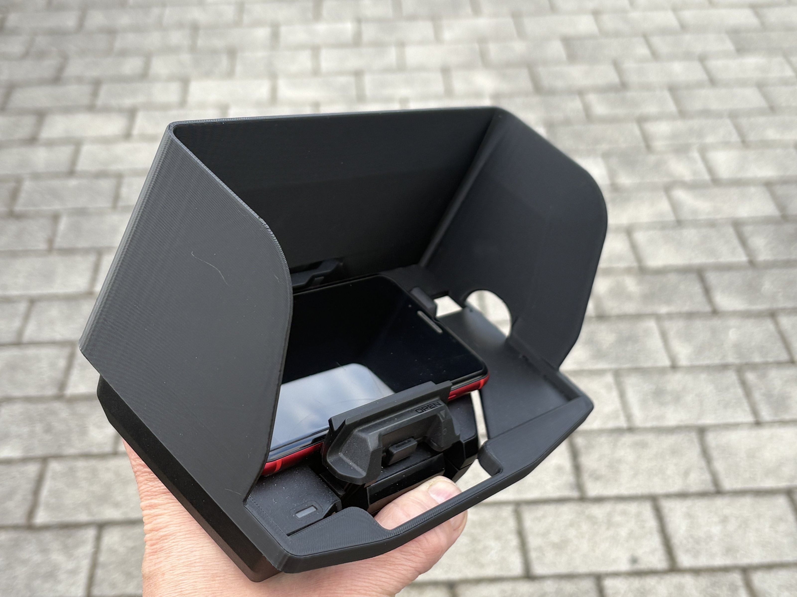 Habe eine Sonnenblende fürs CRC aus PLA übrig. Kann ich leider nicht verwenden, da das Teil mit meiner Scheibenverstärkung kollidiert. Wird mit doppelseitigem Tape am Cradle befestigt und hat zusätzlich Fixierpunkte für Kabelbinder o.ä.