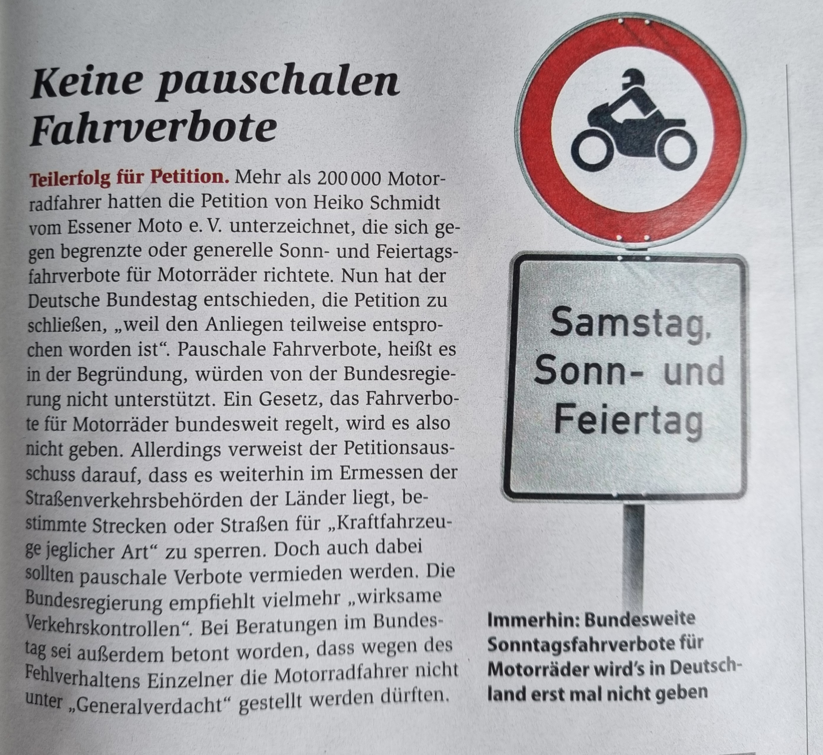 Zumindest ein Teilerfolg. Allerdings ist auch nur eine bundesweite Regelung vom Tisch. Die Länder selber können nach wie vor Streckensperrungen verhängen. Insofern glaube ich nicht an die Aufhebung schon vorhandener Sperrungen. Und es steht zu befürchten, dass die Länder da auch in Zukunft durchaus anders ticken (insbesondere die links/grün angehauchten) als der Bund. Wir werden sehen........und natürlich weitermachen!