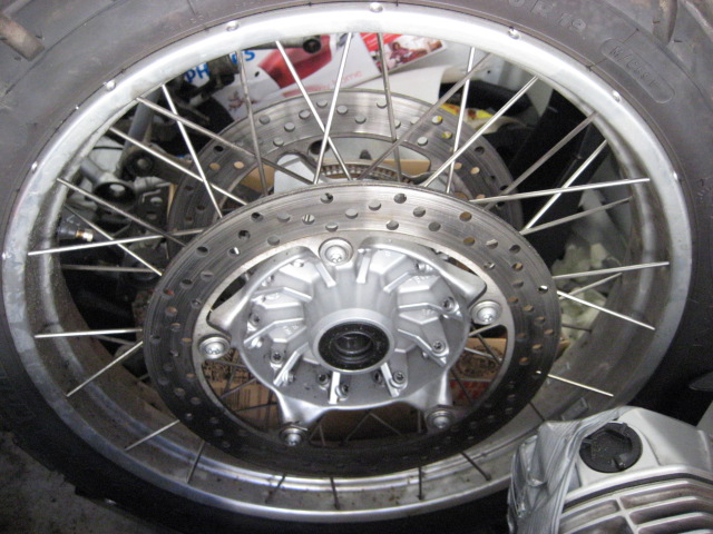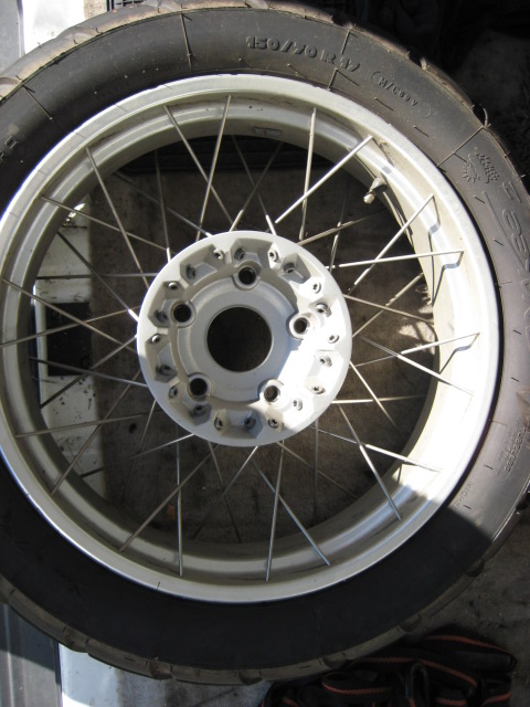 Speichenfelgen silber mit Bremsscheiben und gebrauchten Reifen (60% Profil)