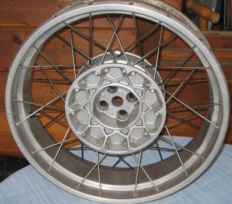 Original Felgen mit Speichen u. Reifen für vorne, ohne ABS-Ringe und Bremsscheiben.