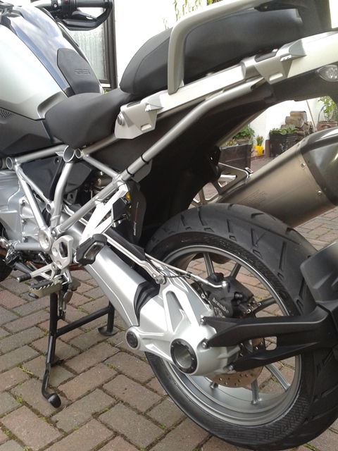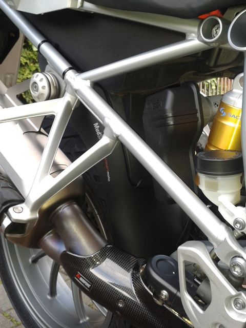 Unterschenkel und Unterseite Oberschenkel sind zwar feucht geworden, aber nicht wie üblich eingesaut. Soziussitz ist vom Regen naß geworden, ESD ab der Hälfte wie üblich eingesaut, Kardan ebenfalls bis zur Hälfte (bis dahin wo der Mudsling hängt), das Heck(Kennzeichen, Rücklicht, Gepäckbrücke) wie üblich eingesaut.