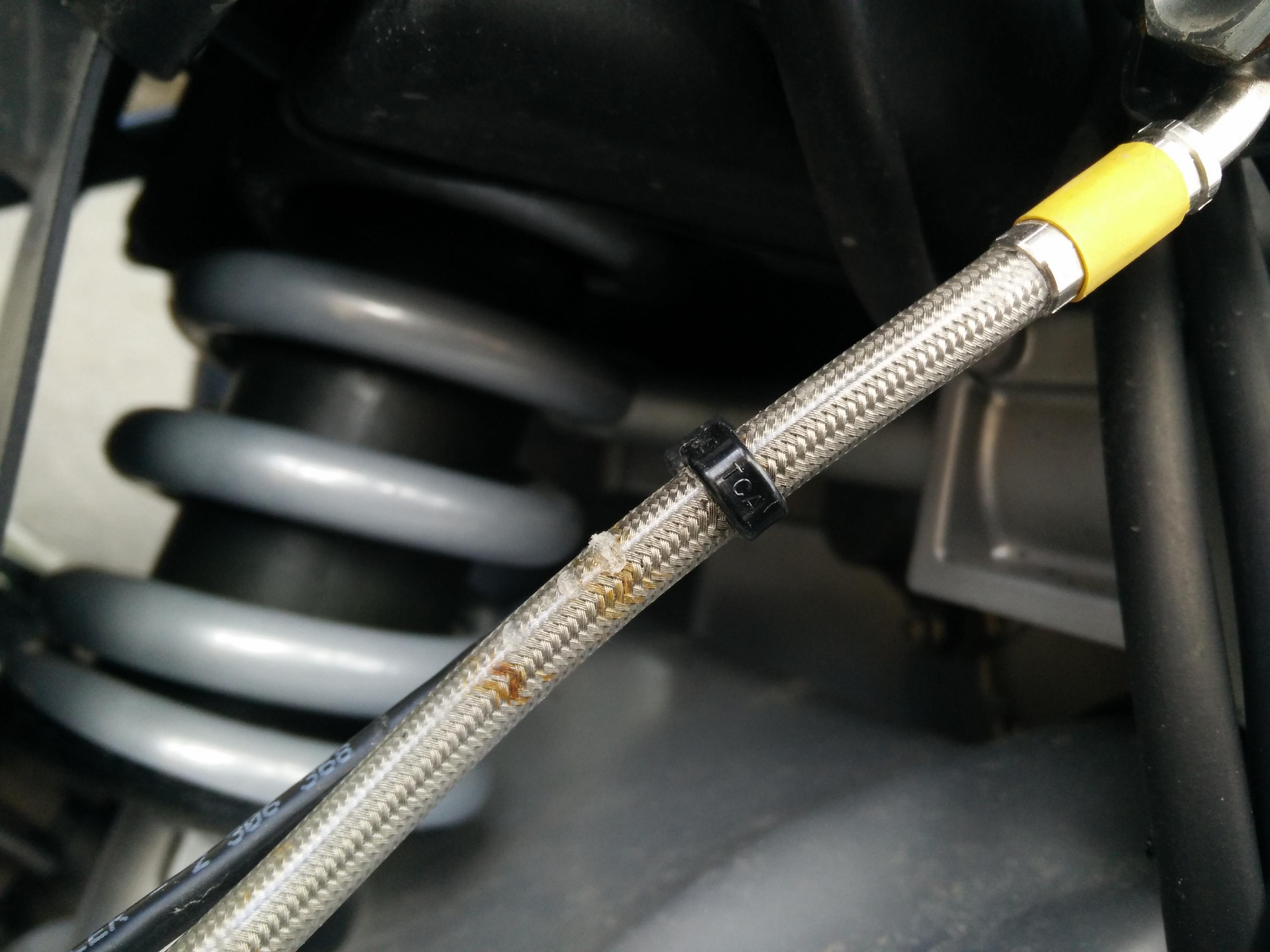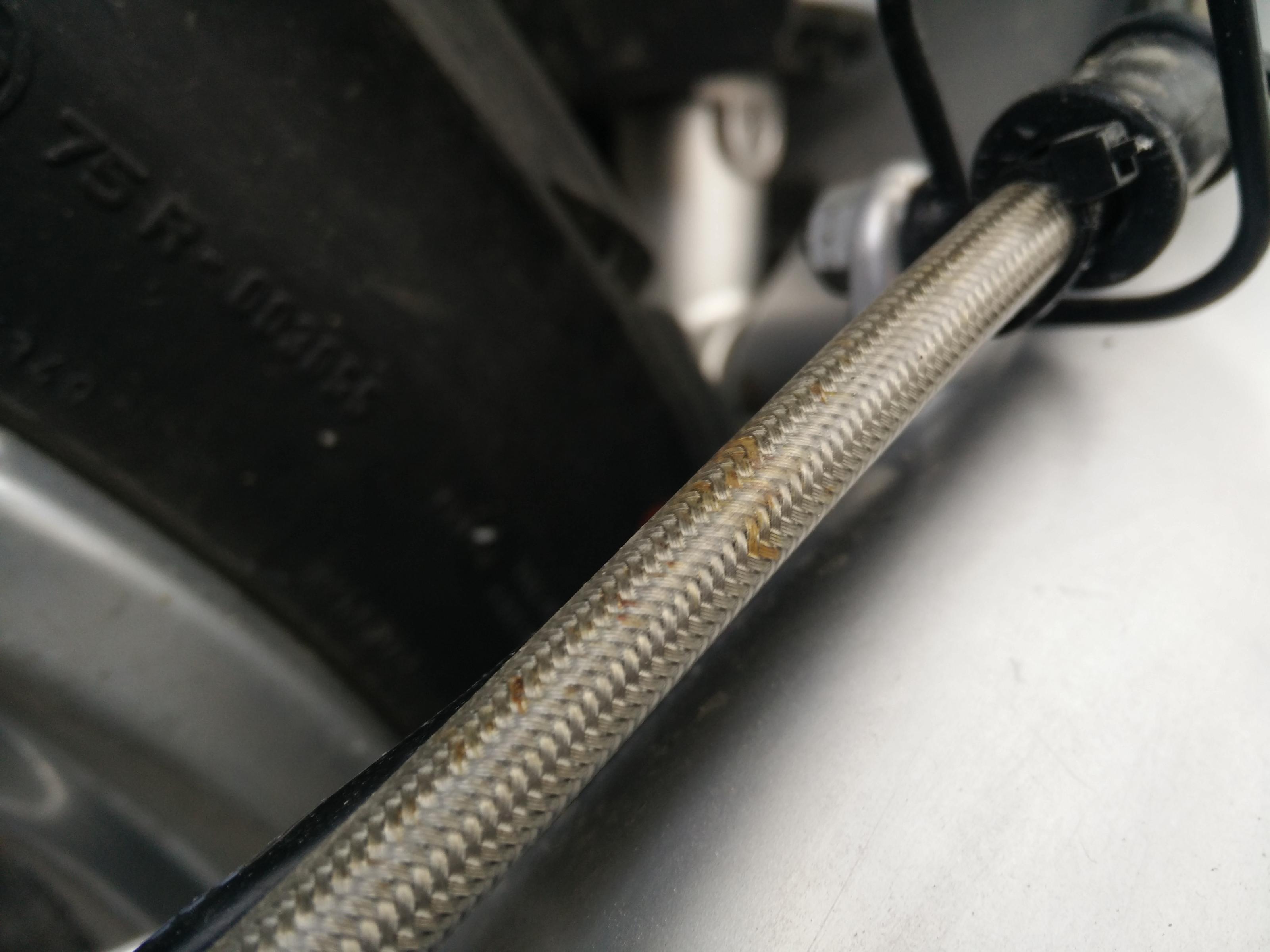 Jedoch seit einige Wochen sieht die hintere Bremsleitung gerostet aus. Jetzt habe ich das mal genauer unter die Lupe genommen. Der Rost scheint sich zwischen Stahlgeflecht und äußerer Gummiummantelung zu befinden. An einer Stelle sieht die Ummantelung auch gequetscht aus (ersichtlich am Foto). Maderbiss? Was ist möglich/ realistisch? Garantiefall?
