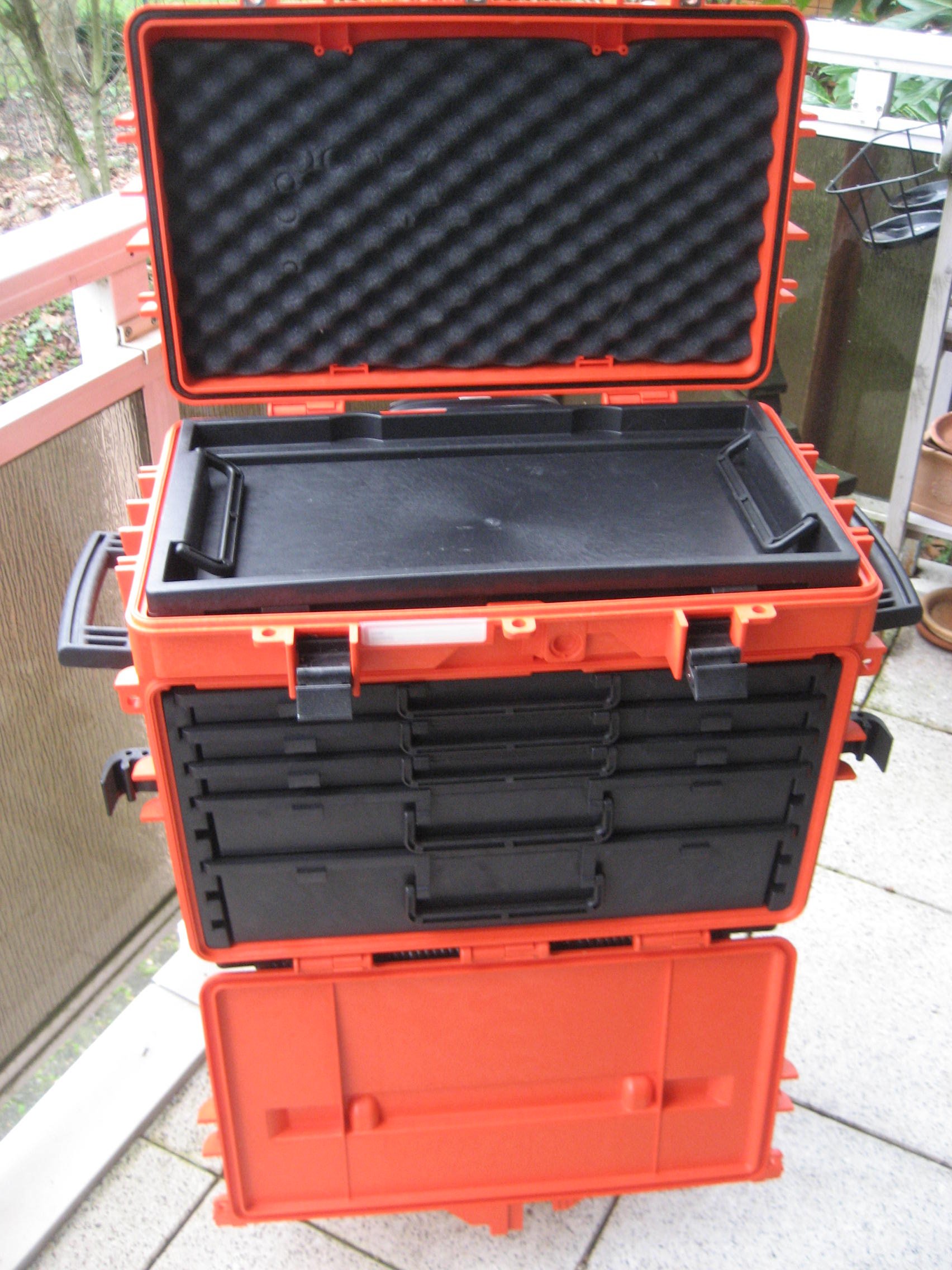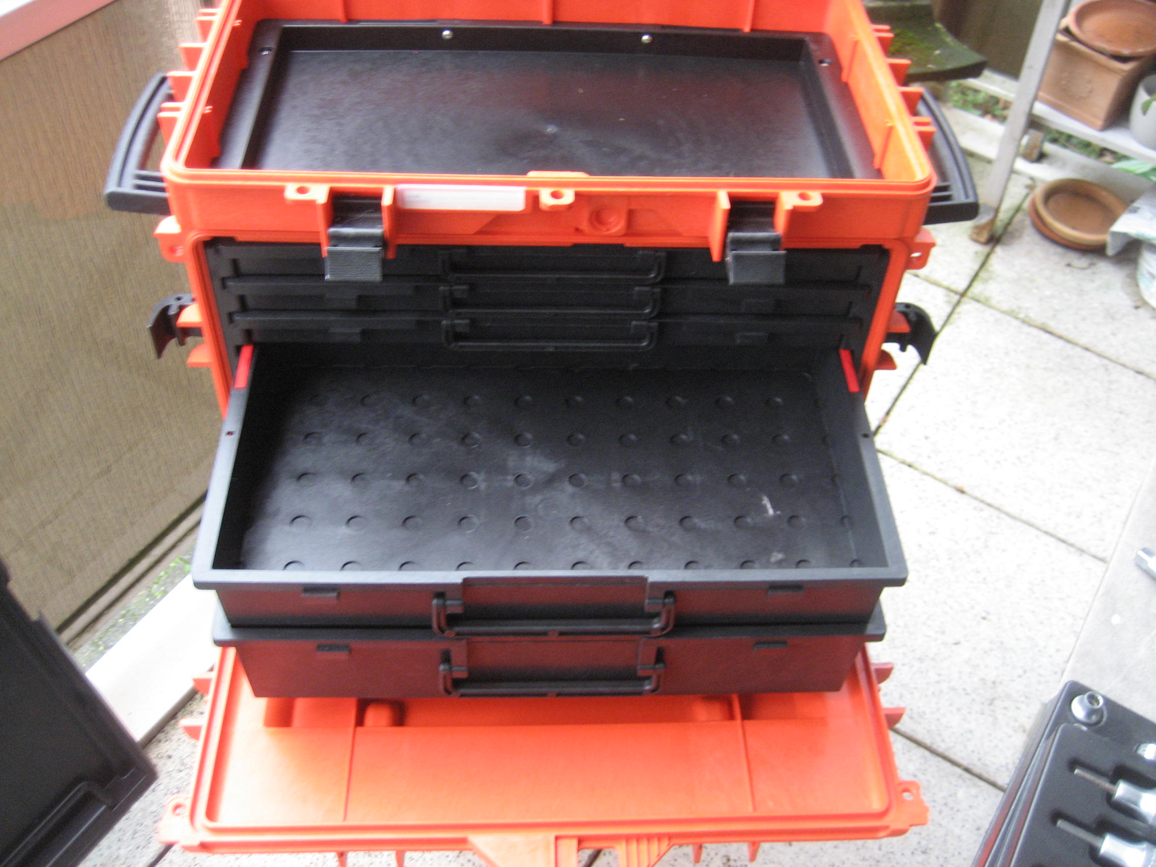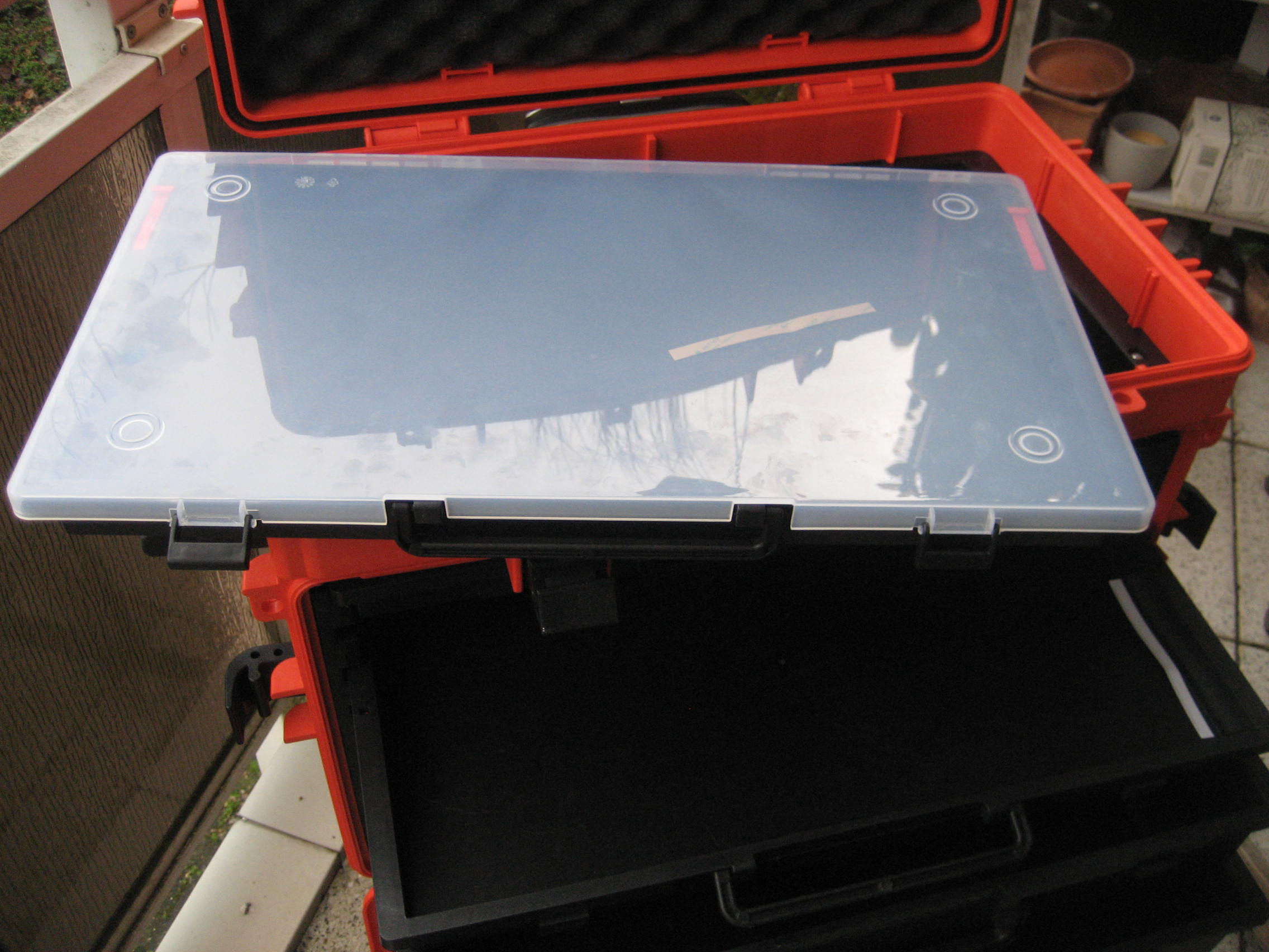 1 herausnehmbare Ablage mit 2 Griffen und 2 transparente Schubladendeckel unter dem oberen Deckel