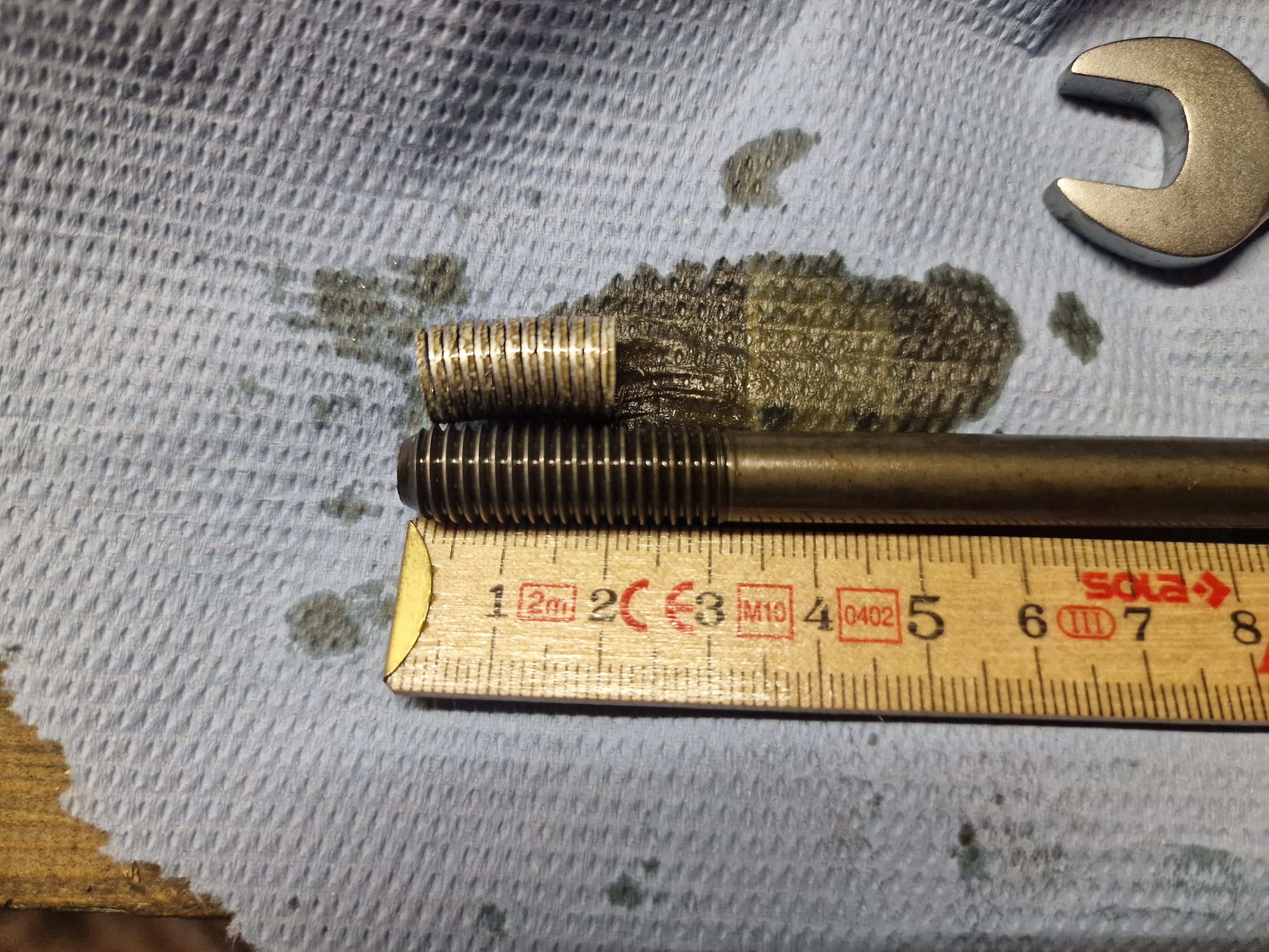Der Stehbolzen ist also glücklicherweise erstmal intakt, halt wie erwartet komplett aus dem Motorblock gerissen. Im unteren Bild sieht man sehr gut die 2cm "Gewinde" aus dem Motorblock - obwohl 3cm Gewinde auf dem Stehbolzen sind. Es können aber höchstens 3mm zum "auf Grund schrauben" gefehlt haben - was ich am Überstand des Stehbolzens gegenüber der Zylinderkopfmutter interpretiere.