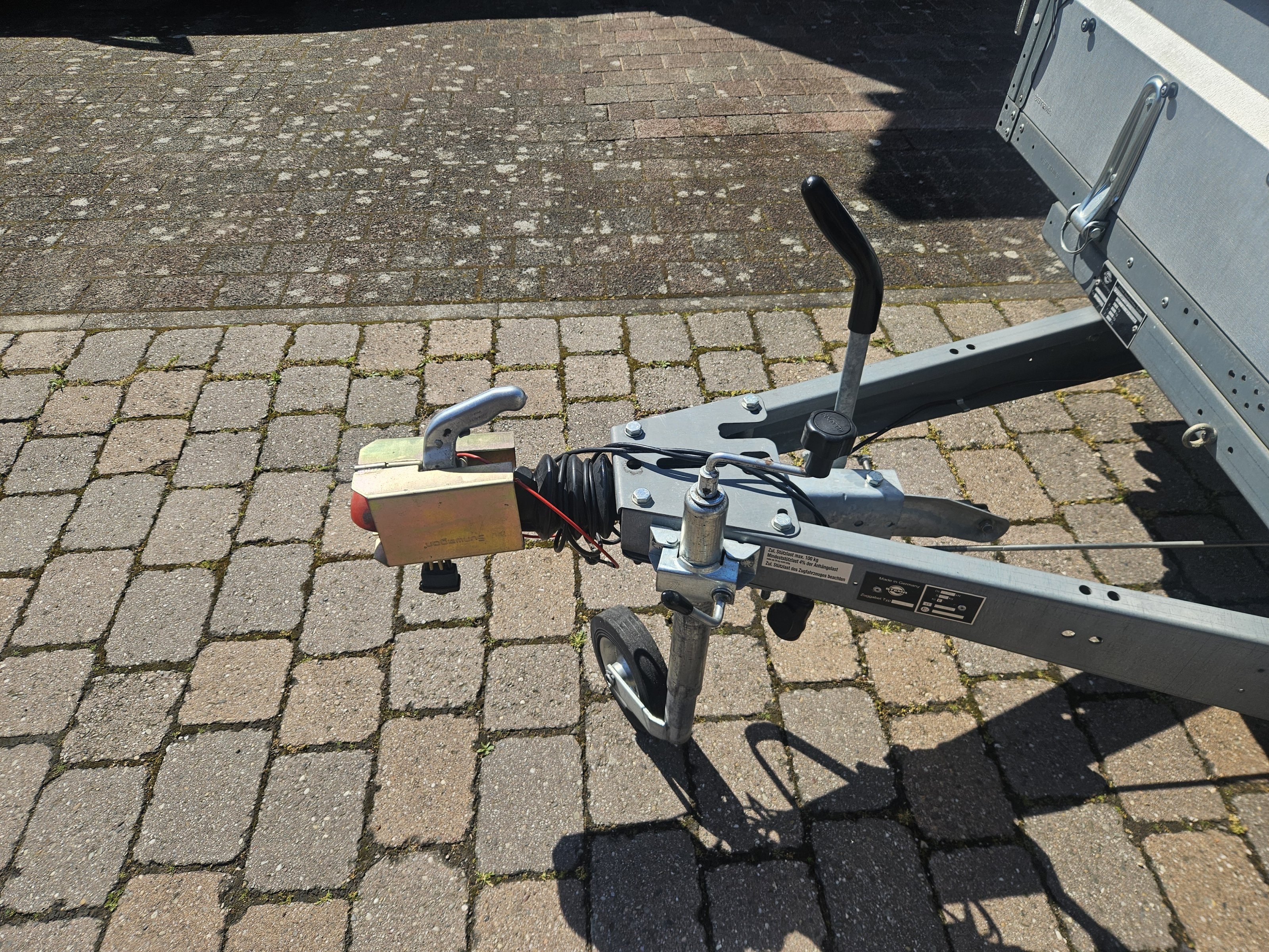 Der Anhänger ist aus 2016 und hat noch die Erstbereifung drauf. Die Reifen haben noch über 6mm Profil, daran sieht man, dass der Anhänger wirklich sehr wenig genutzt wurde. Deshalb verkaufe ich ihn auch, da er die meiste Zeit nur rum steht. In einer der Boxen befindet sich ein für einen Anhänger passender Wagenheber.