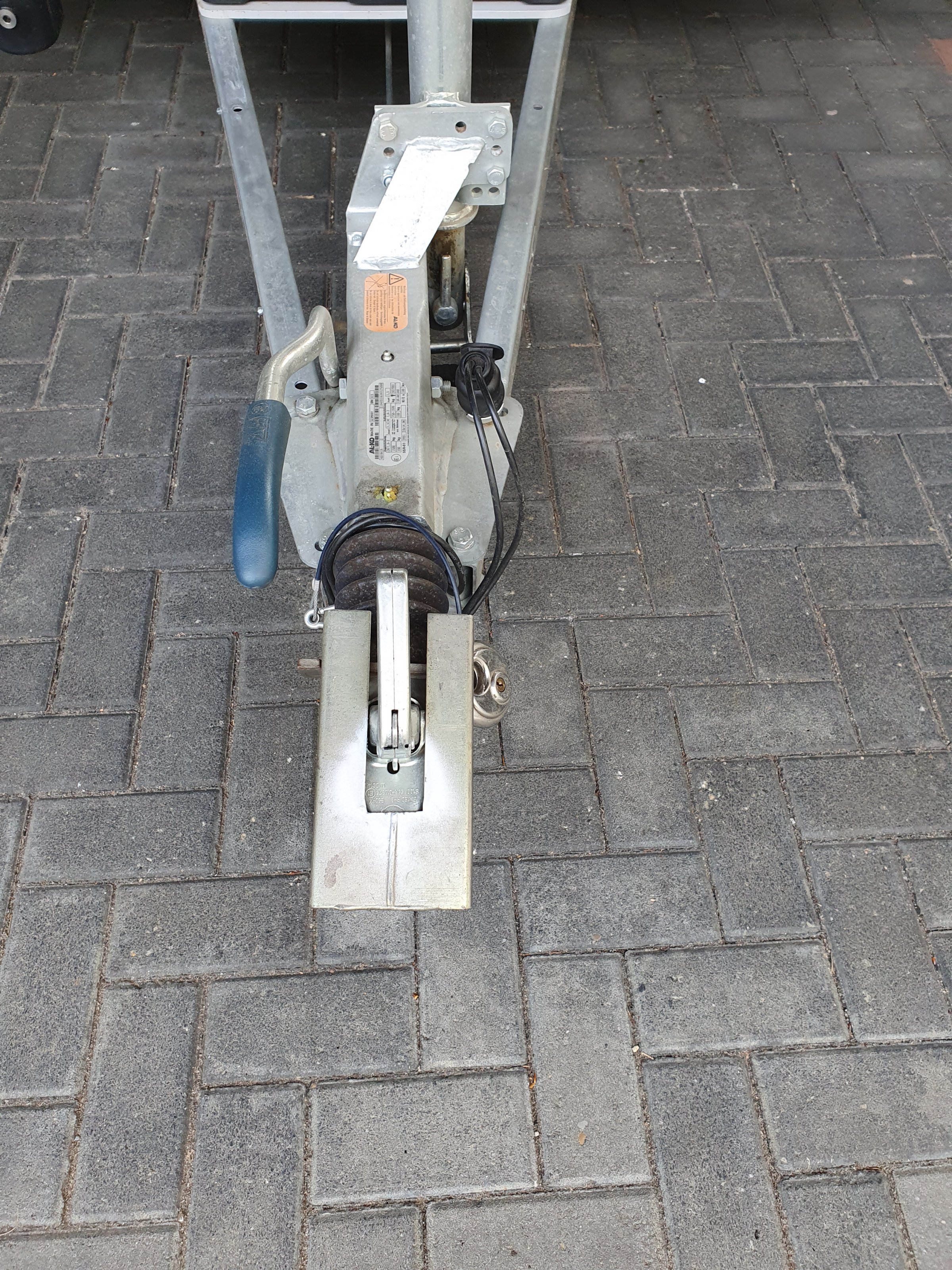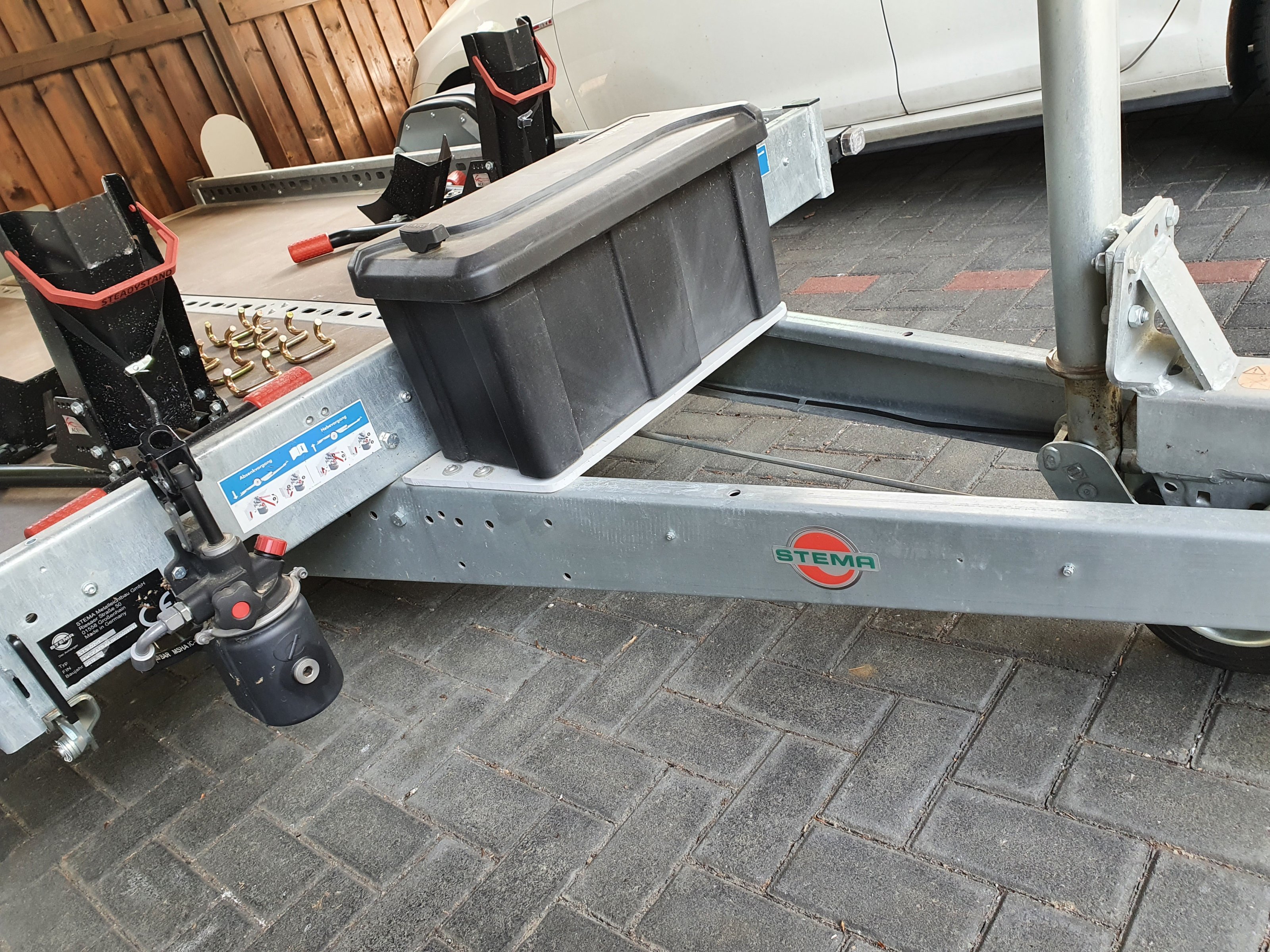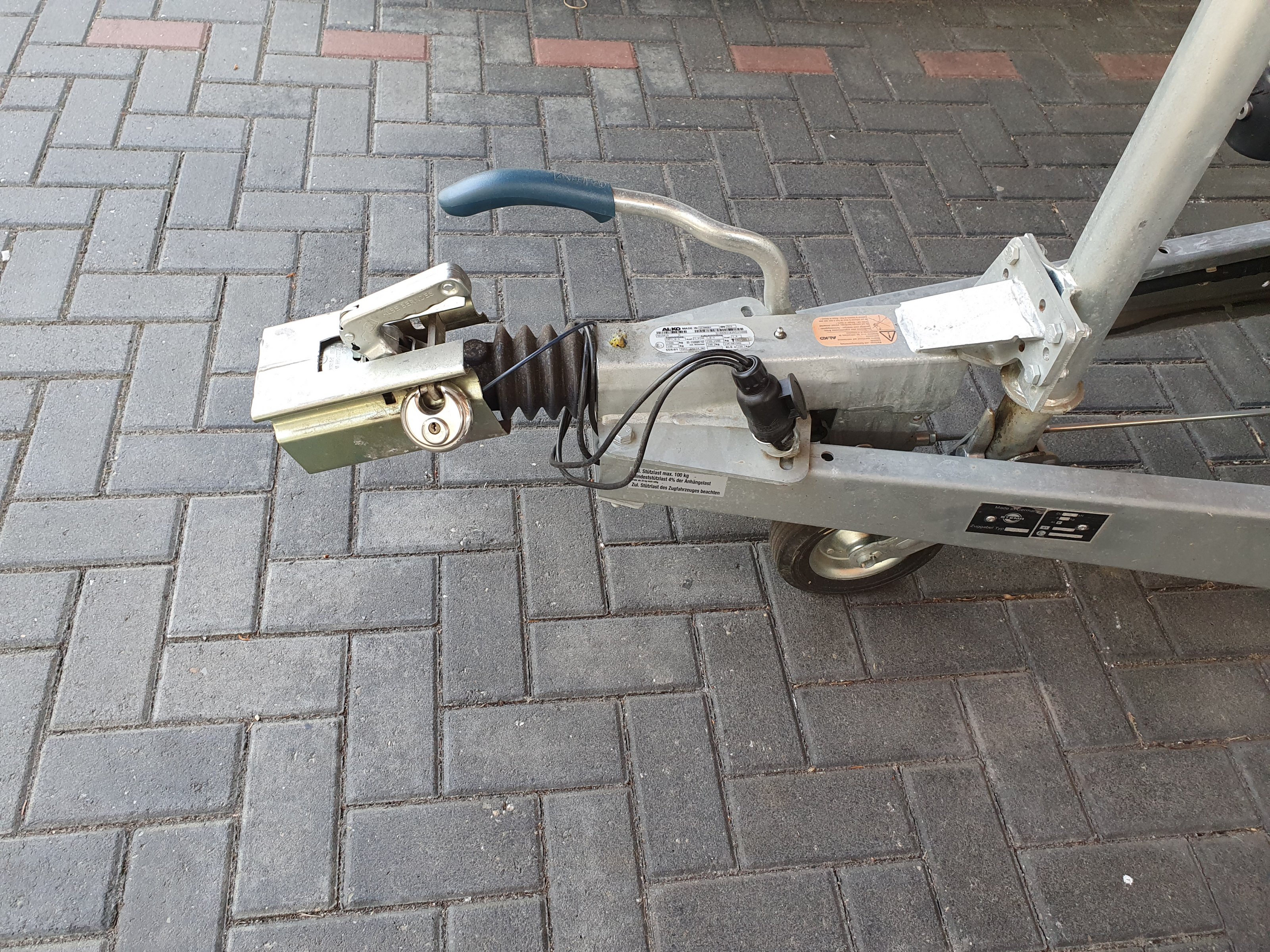 - eine Safety-Deichsel Box mit Schloss sowie eine Radkralle damit man den Anhänger