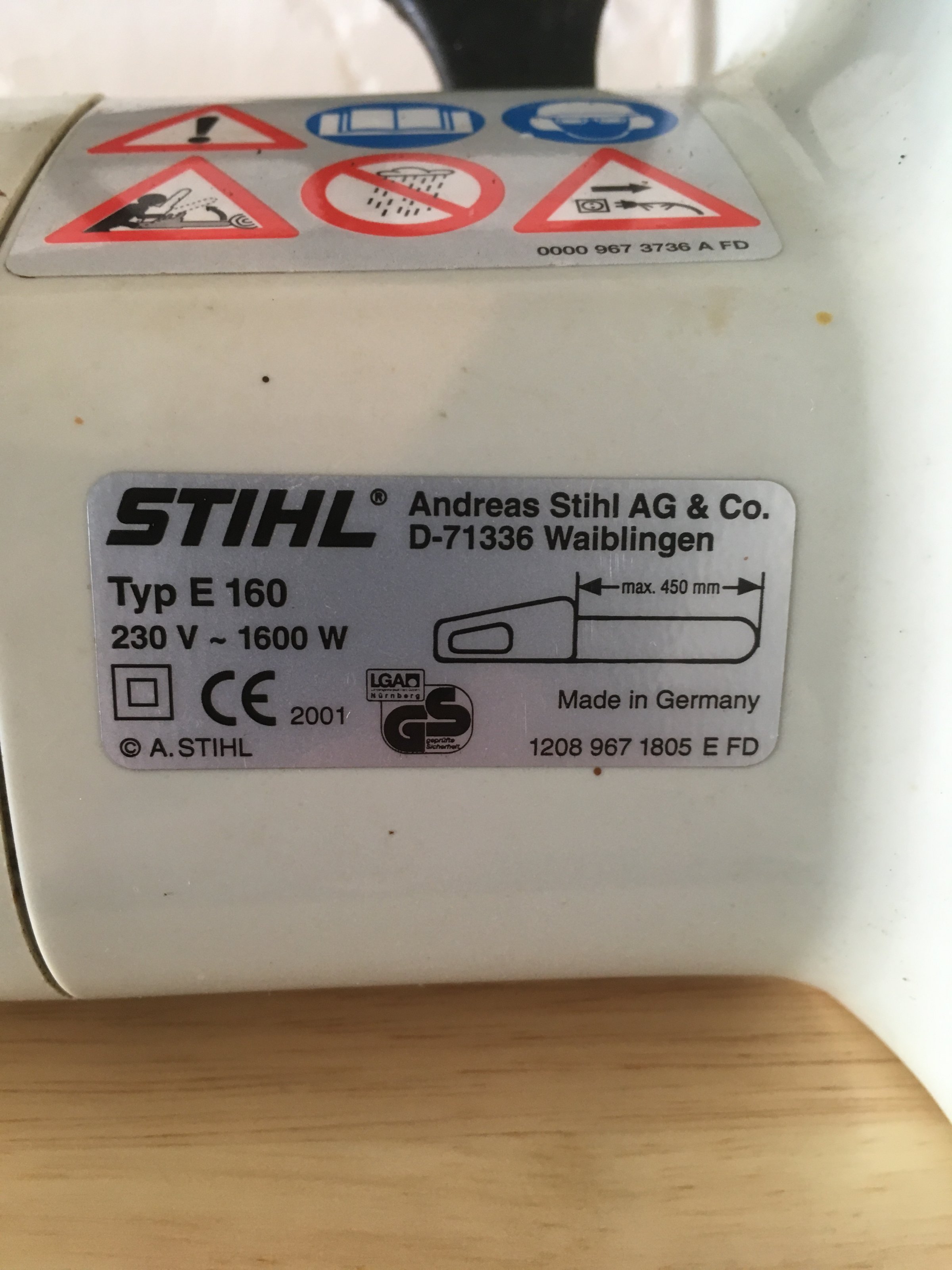 ich biete Euch hier eine sehr gepflegte elektrische Kettensäge der Firma Stihl Typ E 160 mit Ersatzkette, Multiwerkzeug und Schwertschutz an. Ich habe umgestellt auf eine Akku Säge und benötige die E 160 nicht mehr. Die Abholung in Hagen, verbunden mit einer Funktionskontrolle wäre mir am liebsten. Ein Versand ist bei Kostenübernahme aber auch möglich. Bei Fragen schickt mir eine PN, Mail, oder ruft einfach an.