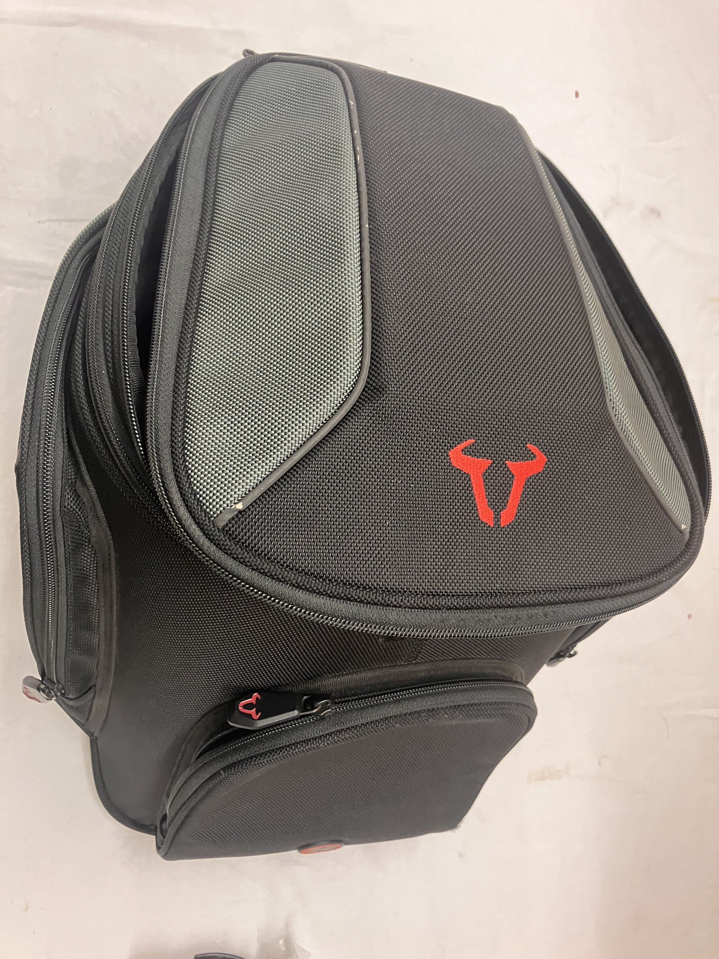Der Tankrucksack ist gebraucht, die Reißverschlüsse funktionieren einwandfrei.