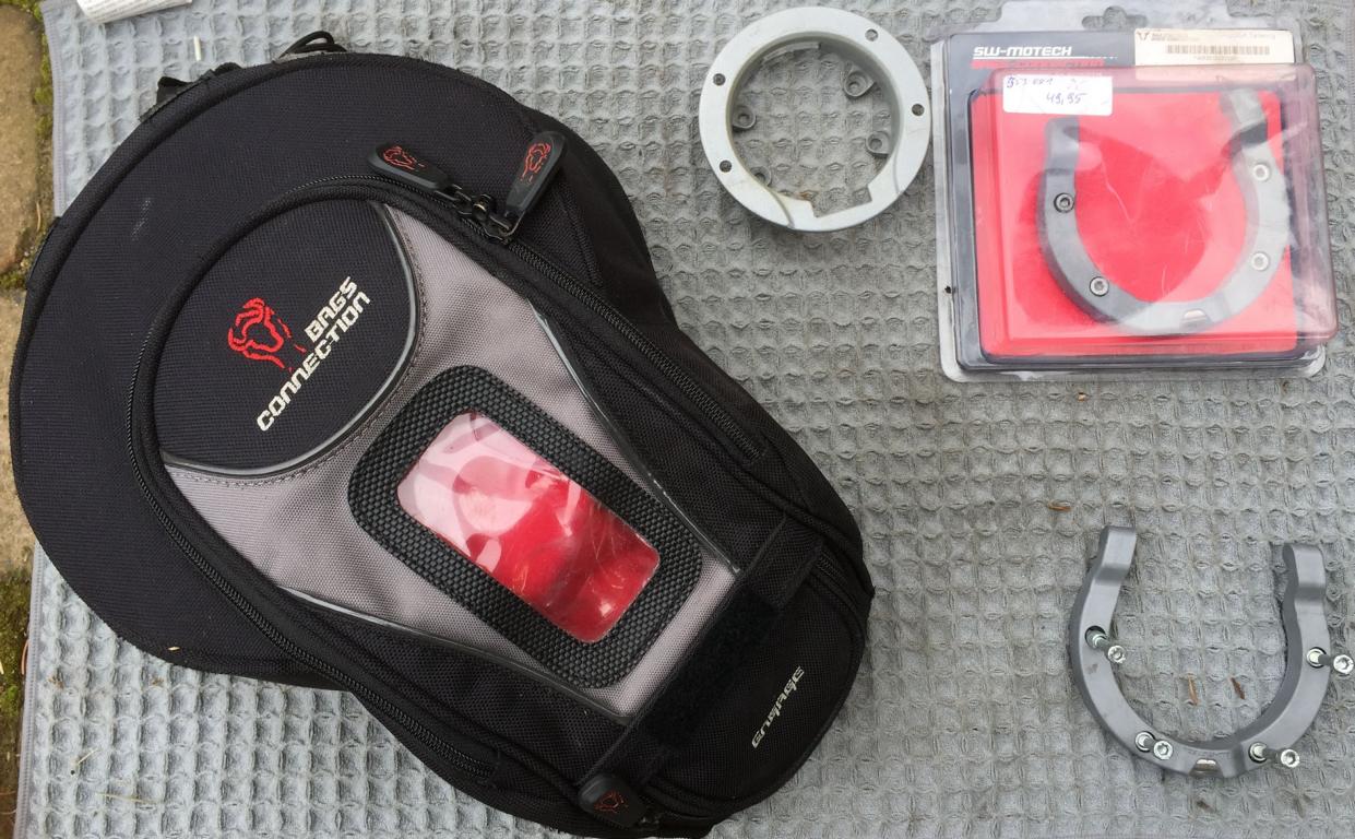 Habe hier noch einen Tankrucksack von SW-Motech Modell Engage, Zusatnd ist gebraucht, bisschen abgestoßen vom Ablegen auf dem Tisch oder unterwegs irgendwo. Tankring ist für eine R1100GS, R1150GS und für die ersten R1200GS dabei, dann ist noch ein zweiter Tankring dabei, wo der passt weiß ich nicht, vielleicht weiß je jemand Bescheid.