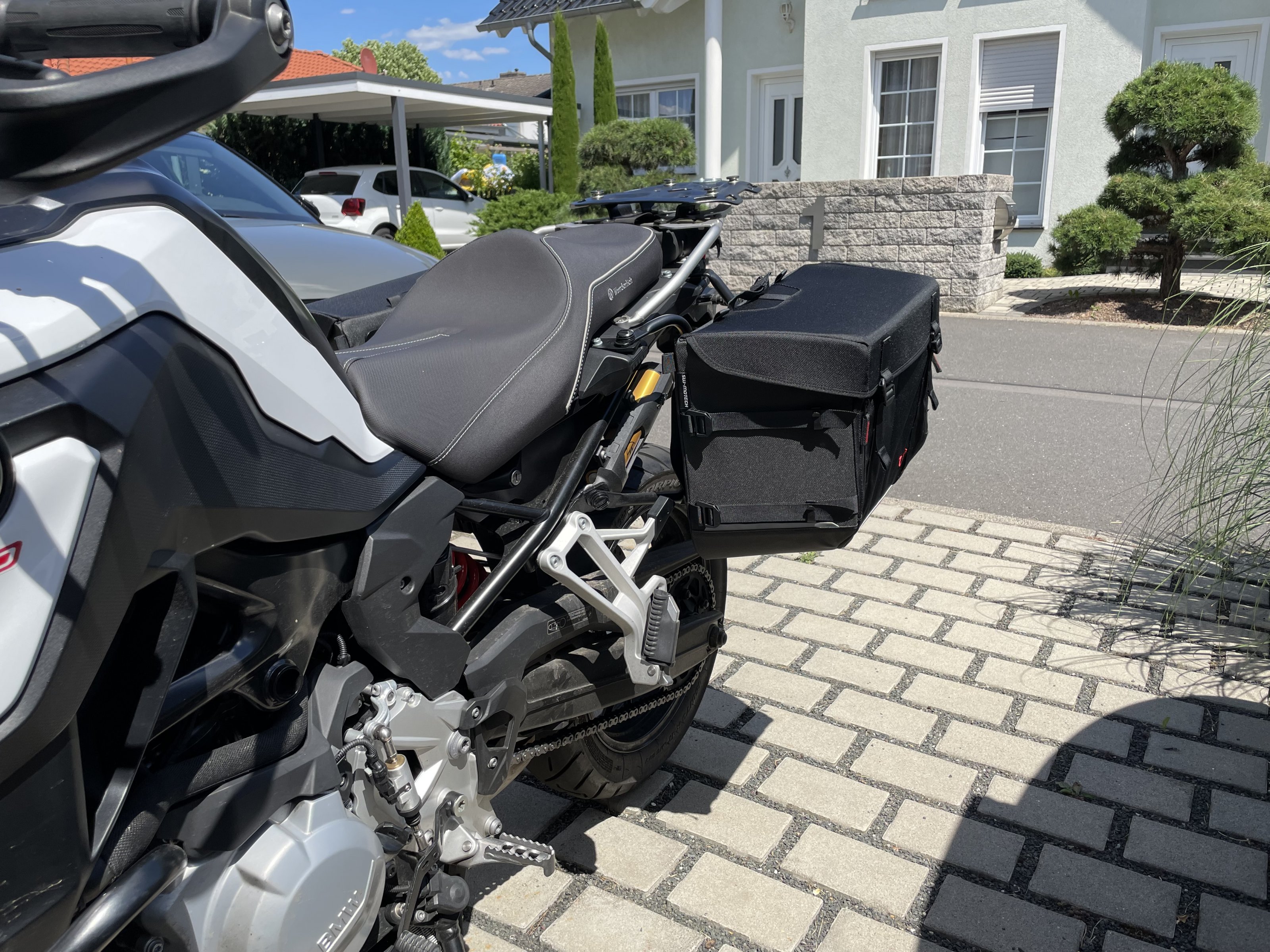Ich habe mich am Ende erstmal für den Kofferträger von SW-Motech entschieden und da wir recht spontan für ein paar Tage losgefahren sind, einfach zum testen ein paar (sehr) günstige aber große Taschen montiert. Nach der Rückkehr wollte ich dann das Kofferthema wieder aufnehmen.