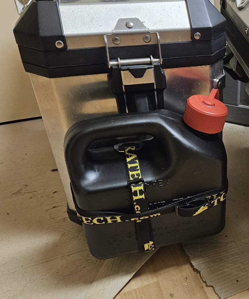 Nein, ich brauche in unseren Breiten bei meinem "ADV-Fass" eigentlich keinen Reservekanister. Der dient nur dazu, meinen Touren-Buddy mit F900R und “Fingerhut-Tank"