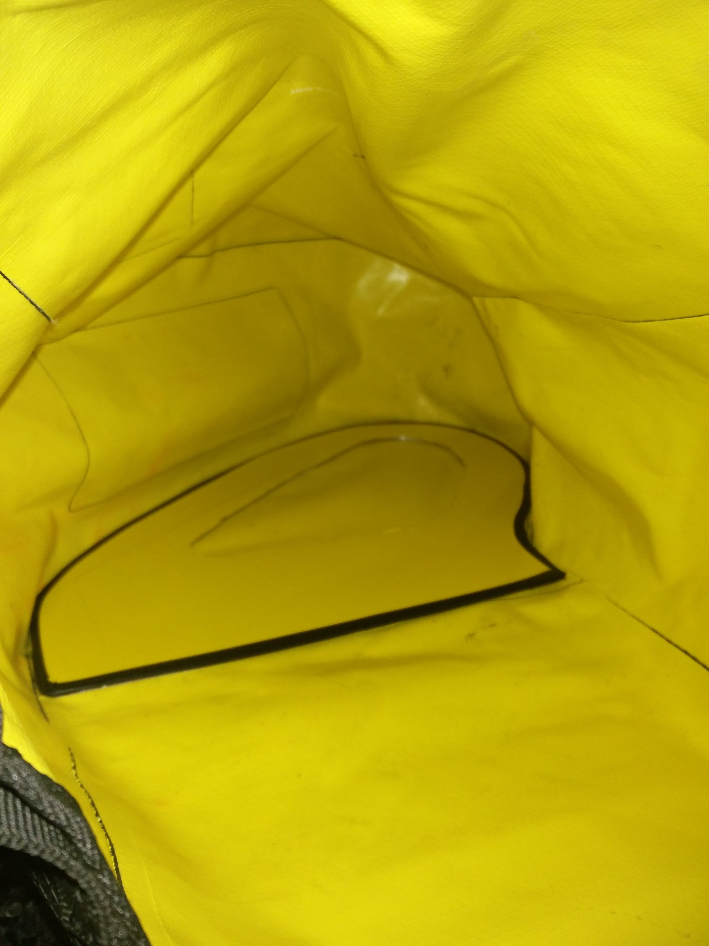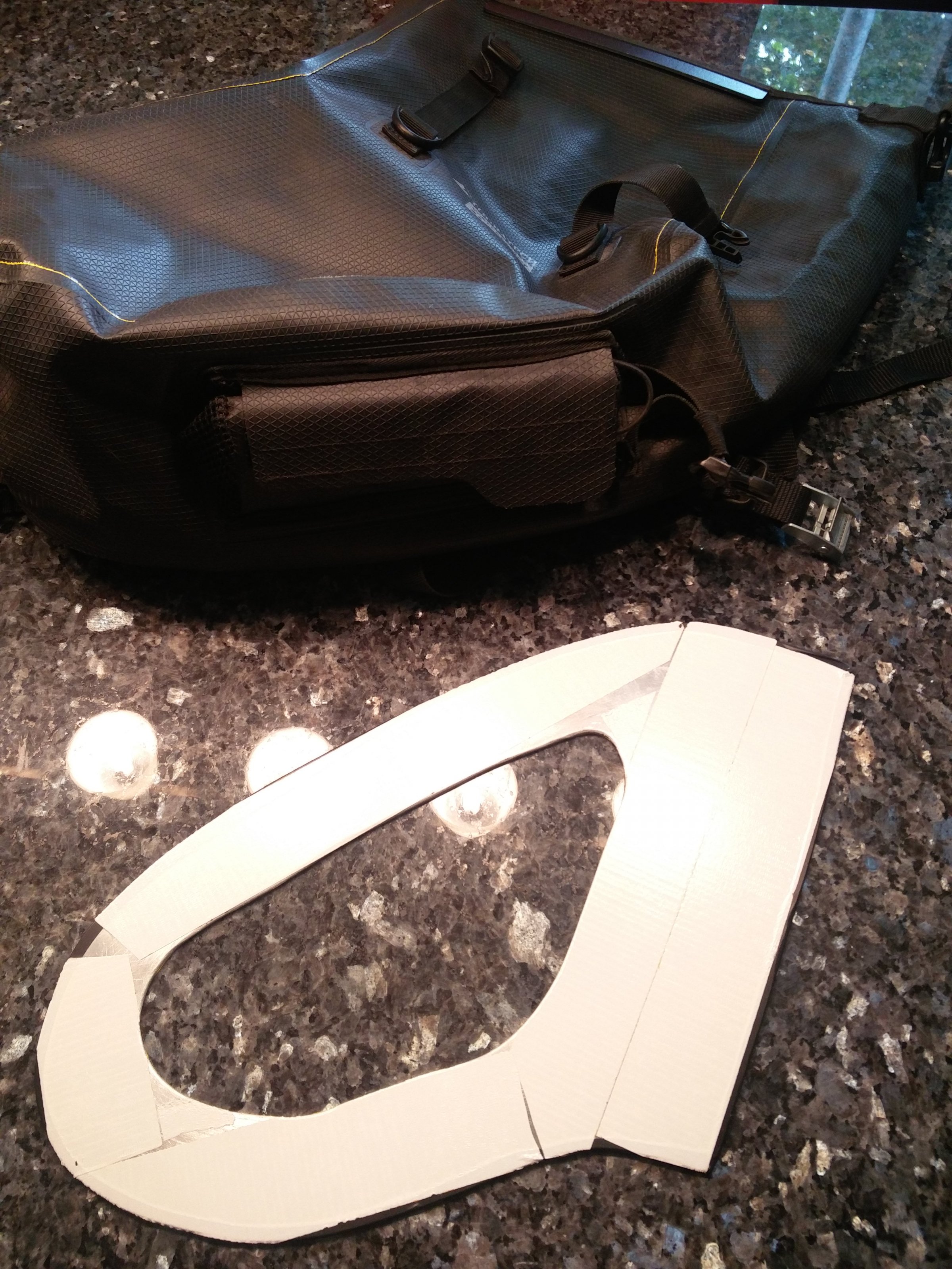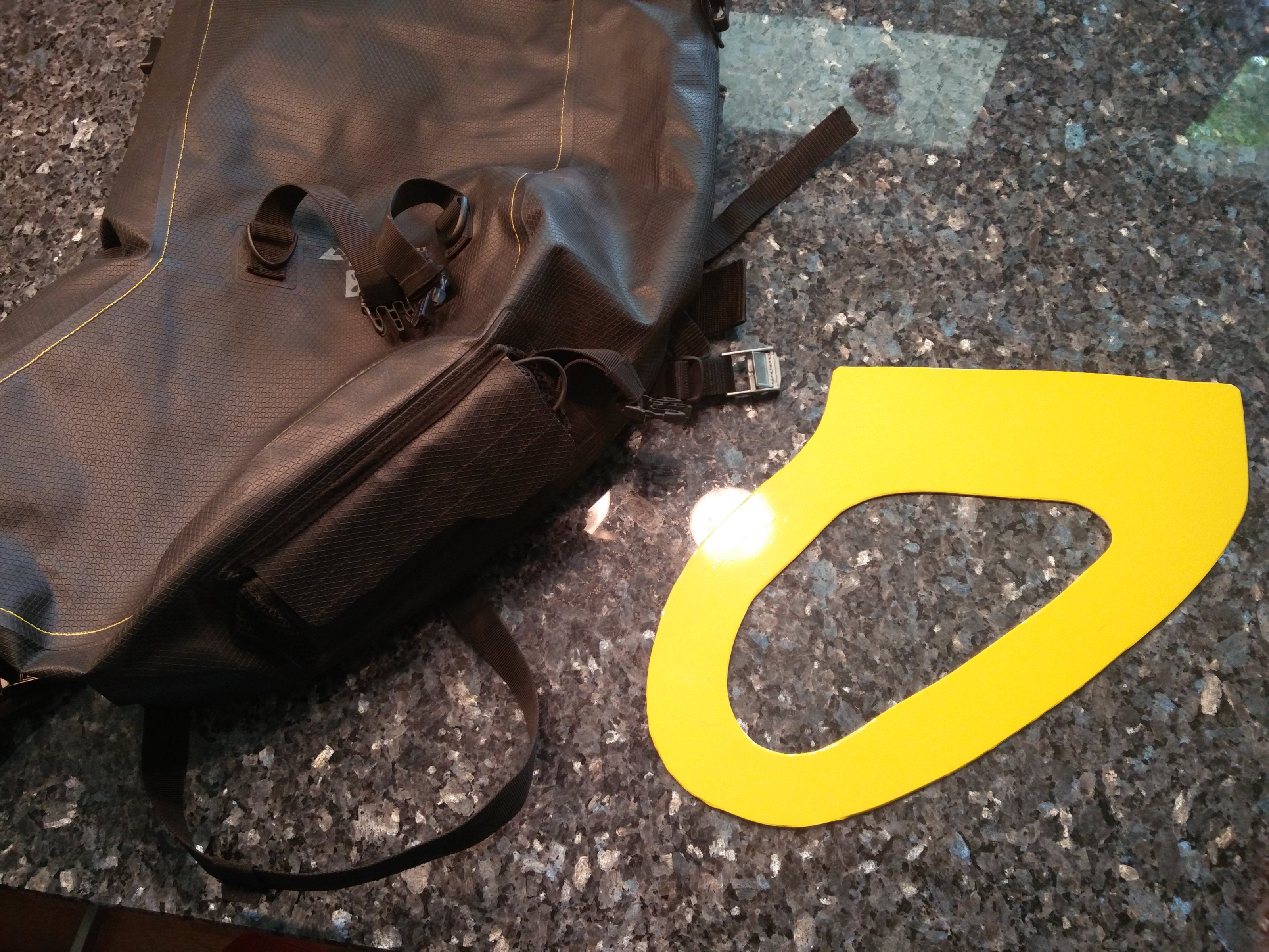 in der Tasche bringen, die ich eben "eingebaut" habe. Aus 2,5 mm Alublech ausgeschnitten, Kanten entgratet, aus optischen Gründen mit gelber Folie beklebt und dann vollflächig mit doppelseitigem Klebeband innen auf der Rückwand der Tasche positioniert und aufgeklebt. Ja, das verursacht ein Mehrgewicht von 350g, aber das ist mein geringstes Problem.