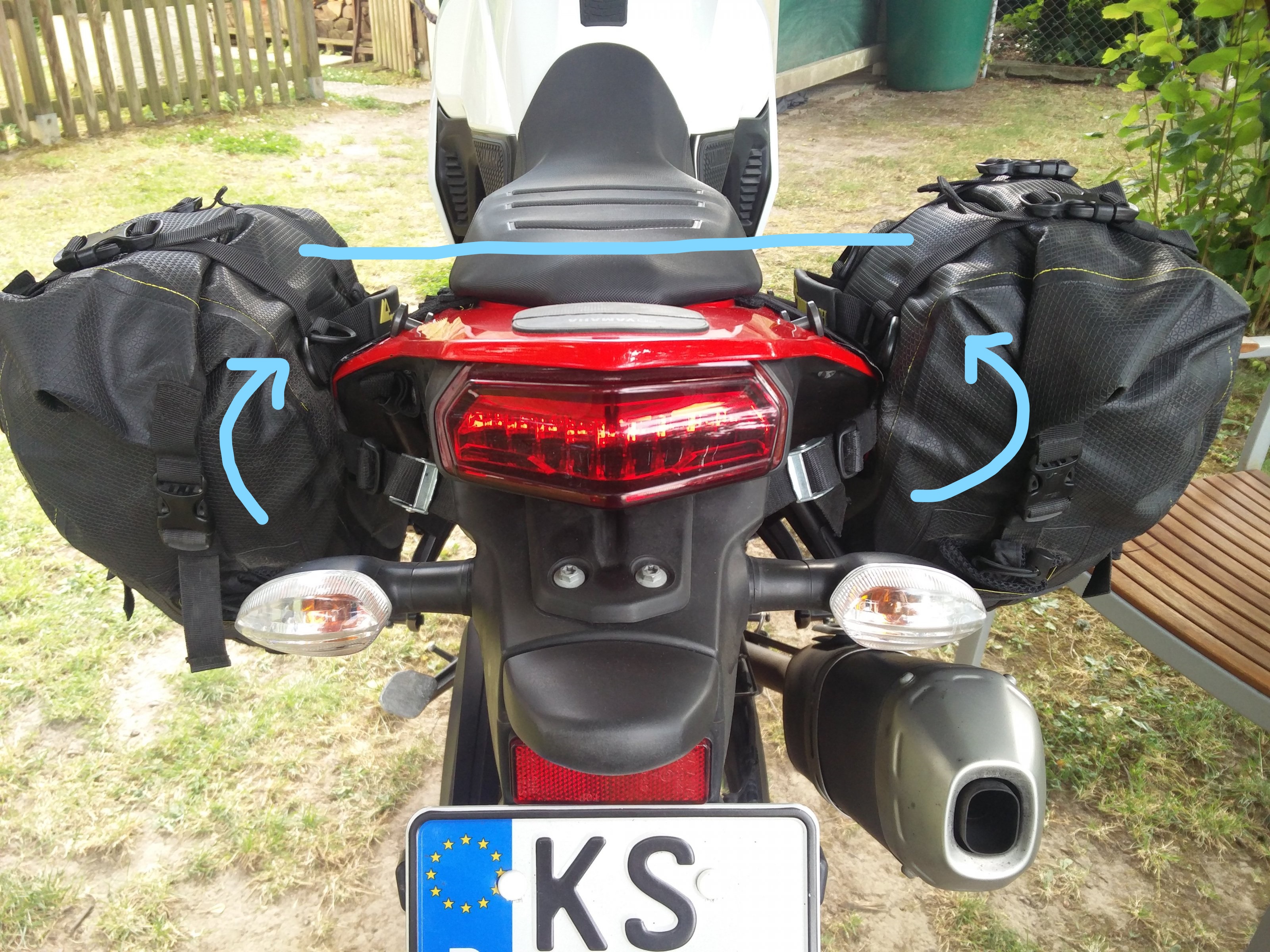 Mein oberstes Ziel war und ist ja nach wie vor mit Softgepäck in Urlaub zu fahren, ohne jegliches Trägersystem. Die rechte der beiden Taschen macht das auch klaglos mit, sitzt sofort stramm und wackelfrei, da sie sich am Halter des Endtopfs abstützt. Bei der linken funzt das nicht so gut, da die Tasche im unteren Teil komplett in der Luft hängt und sich dadurch immer Richtung Hinterrad neigt. Vor allem im vollbeladenen Zustand kommt sie dem Reifen bedenklich nahe, wer die Taschen an der T7 hat kennt das Problem.