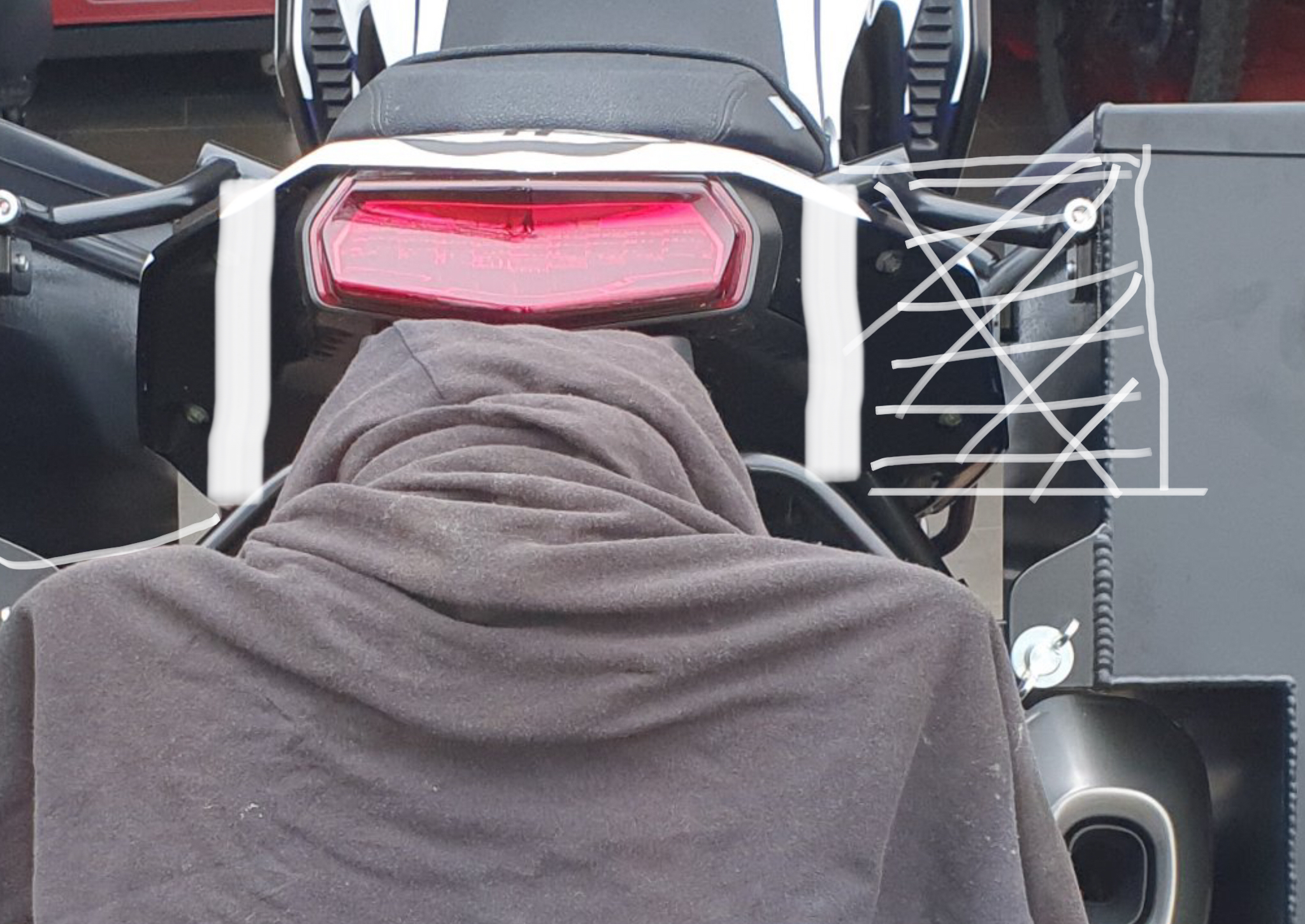 3. Oder der Auspuffseitige Kofferträger ist um den Auspuff herumgezogen, und es wird ein Koffer mit Aussparung für den Auspuff verwendet.