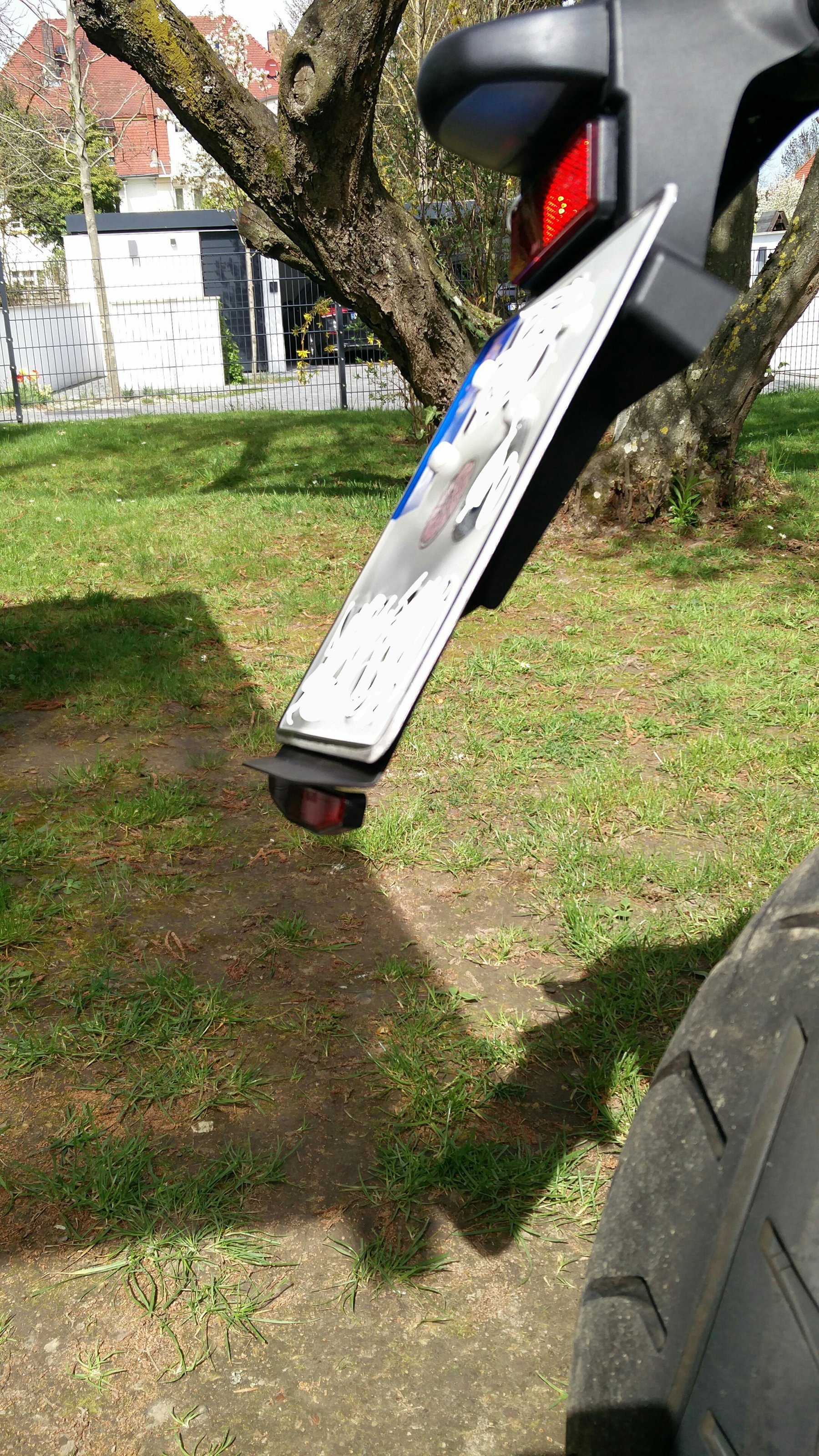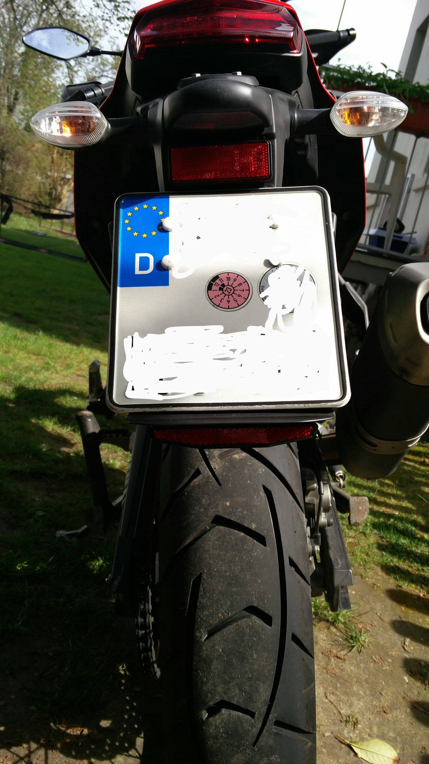 Durch die Verkürzung des Hecks wurde die Hecktasche und der Rücken immer eingesaut. Kleines Alublech gebogen ala Touratech, bisschen schwarz drüber, noch n Strahler drunter für den optischen Abschluss und schon bleibt hinten alles trocken und sauber. Funktioniert tatsächlich!