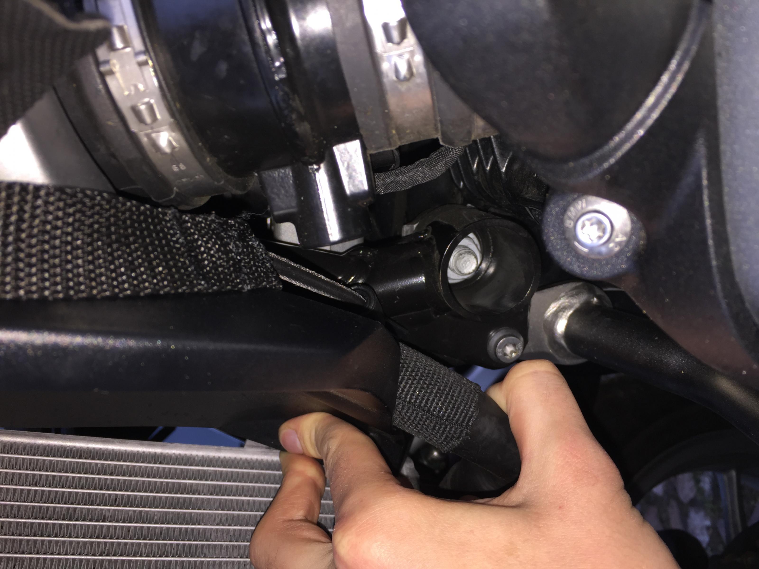 Durch besagtes Loch habe ich nun einen Kabelbinder gezogen und locker geschlossen. Dann habe ich von vorne den Halter angeklippst und den Kabelbinder festgezurrt. Damit ist der Haken ziemlich "final" mit dem Motorrad verbunden. Daraus ergibt sich auch, dass die Taschen beim Fahren grundsätzlich auch immer am Motorrad sein sollten. Man kann das natürlich auch anders lösen, jedoch muss man trotzdem zum lösen immer ins Motorrad greifen. Auch bei den vorderen Befestigungen.