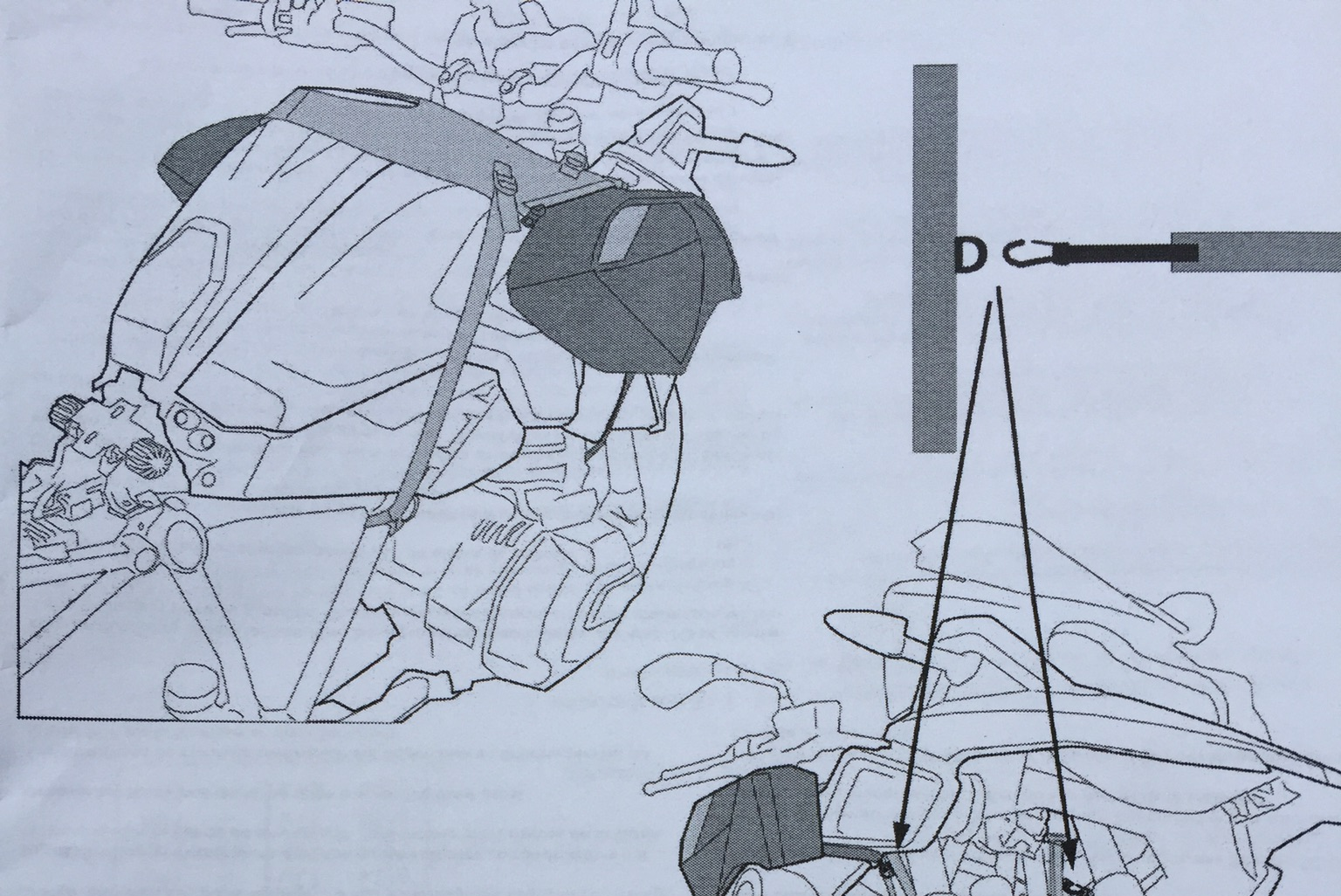 Komme gerade vom Bike zurück. Die TT Lösung gefällt mir überhaupt nicht. Das Band sitzt derart unter Spannung, dass ich mir sicher bin, dass der Plastikhaken irgendwann mal in alle Teile zerfliegt. Außerdem ist auf der anderen Seite die einzige Möglichkeit zum Einhaken komplett verdeckt. Da ist kein rankommen. Im Moment habe ich die Bänder jetzt direkt nach unten an die Sturzbügel gespannt. Das sitzt gut, allerdings direkt vor dem Boxer.