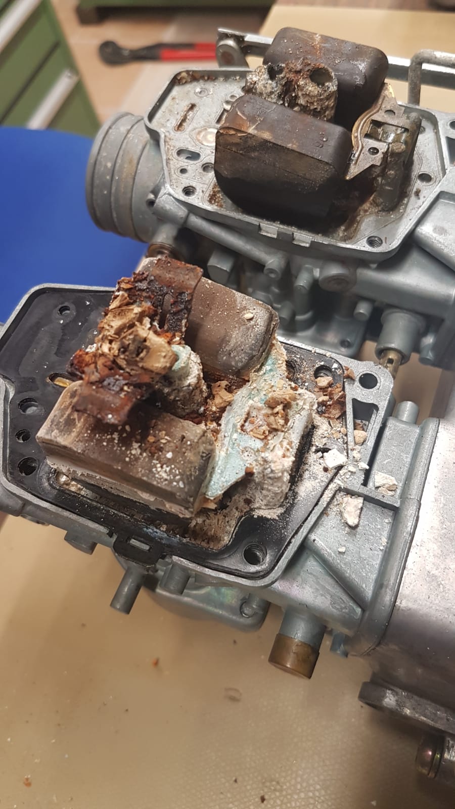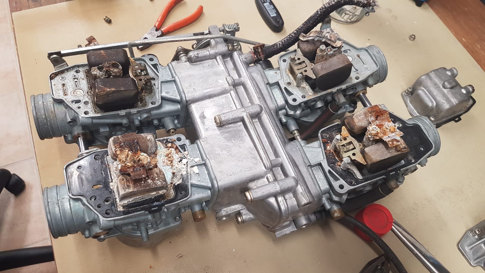 An den Gleichdruckvergasern mache ich die Kammern ab, die Gleichdruck-Membranen sind jetzt über 30 Jahre alt und ohne Probleme. Die mögen alten Sprit in den Kammern nicht so. Anbei ein Foto, was ein Standschaden an einer Goldwing-Vergaserbatterie war, da hat jemand mangels Möglichkeiten und/oder Wissen den Sprit nicht abgelassen.