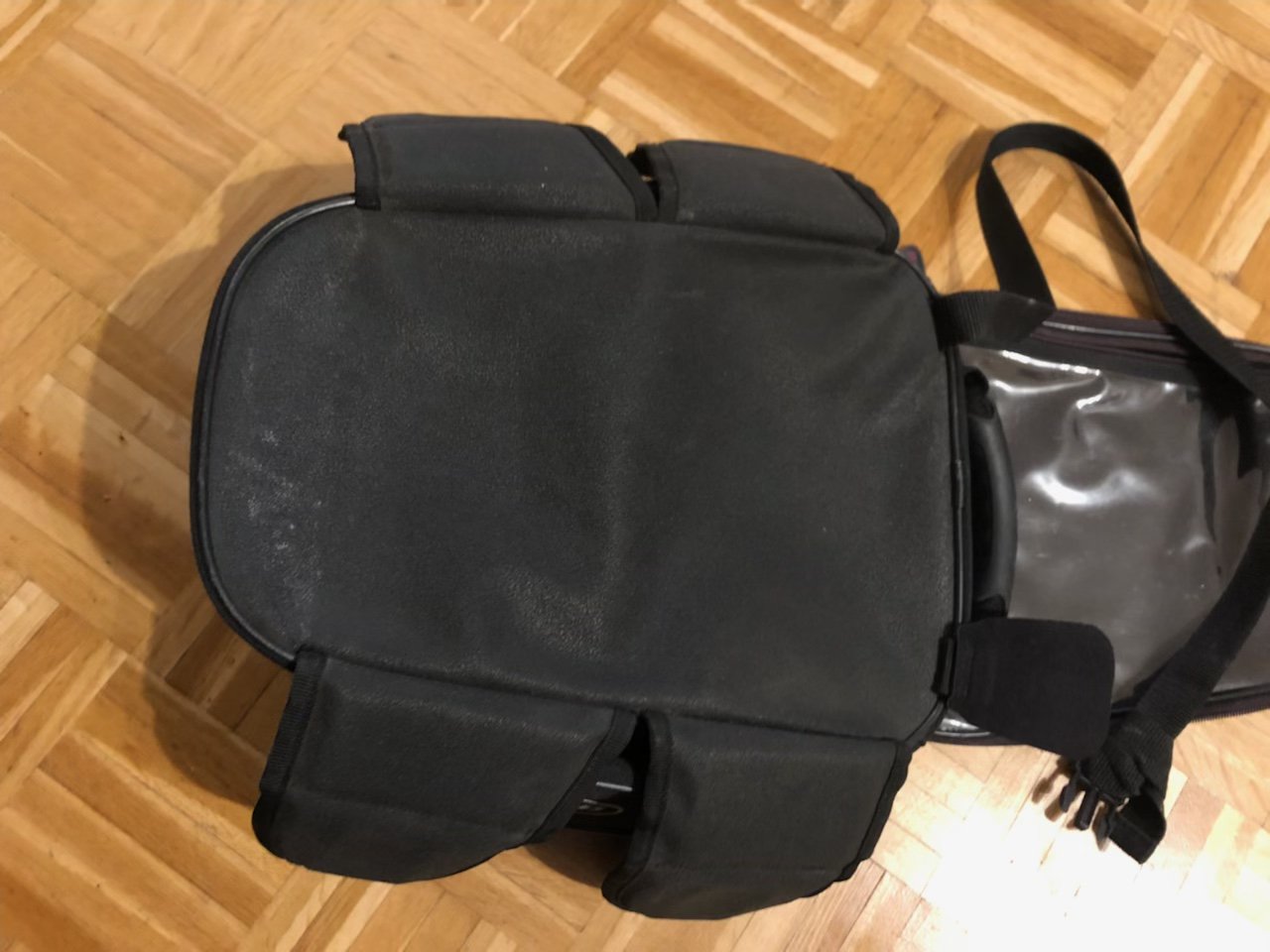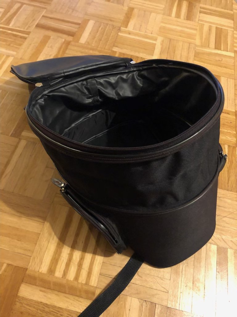 Zusätzlich hat er noch einen Riemen, der als Schultergurt verwendet werden kann und als zusätzliche Sicherung um den Lenkkopf gelegt wird.