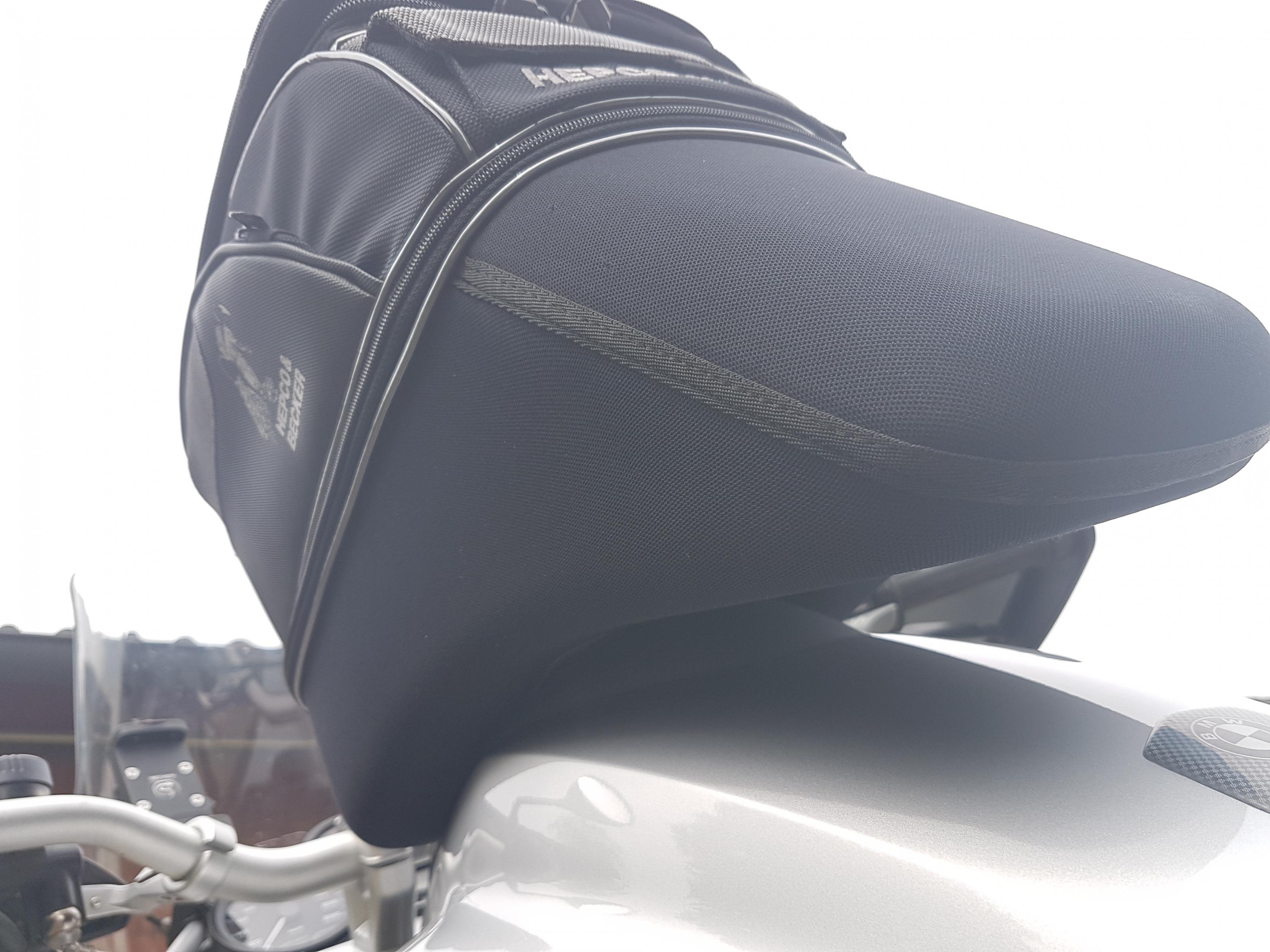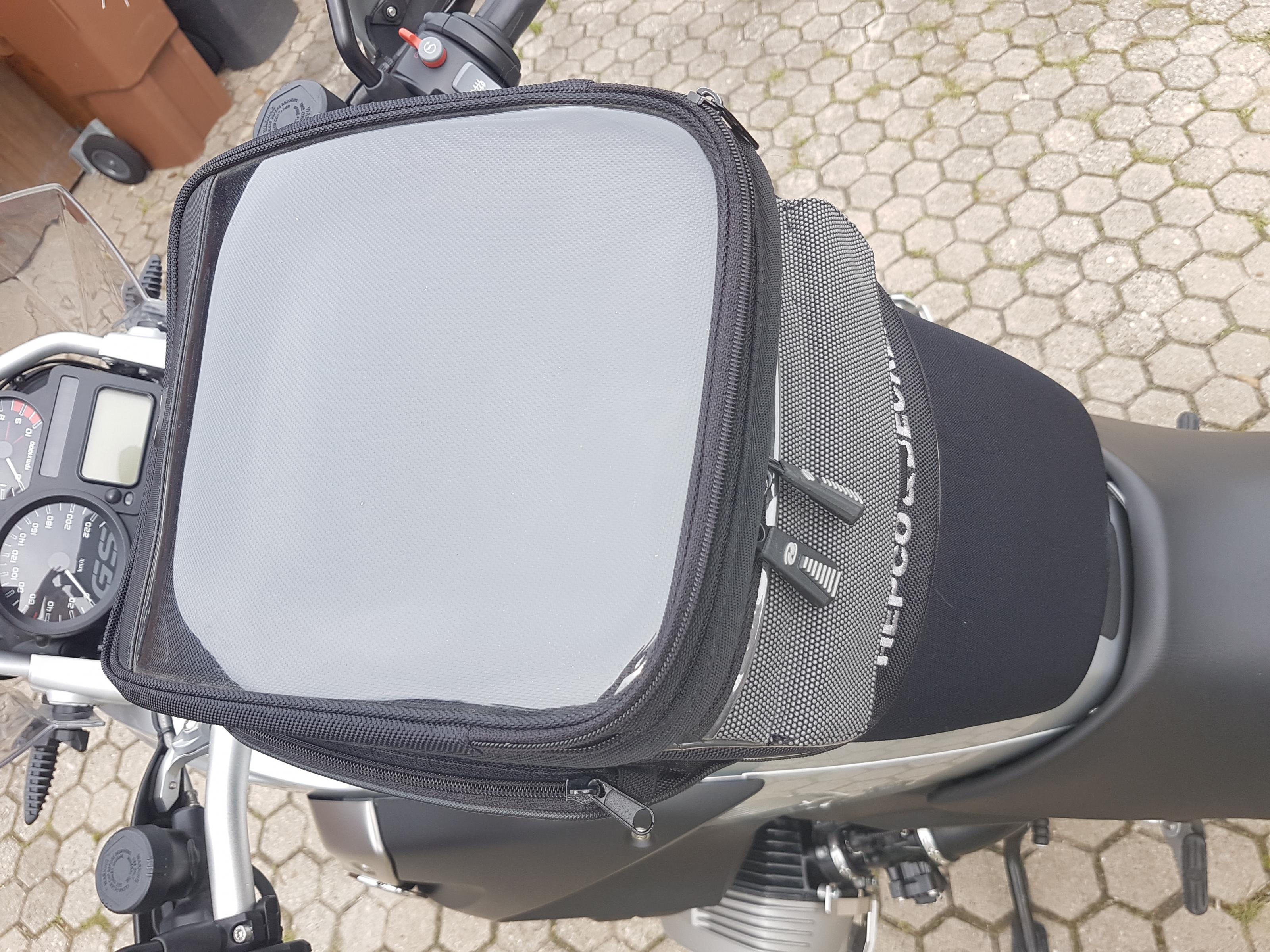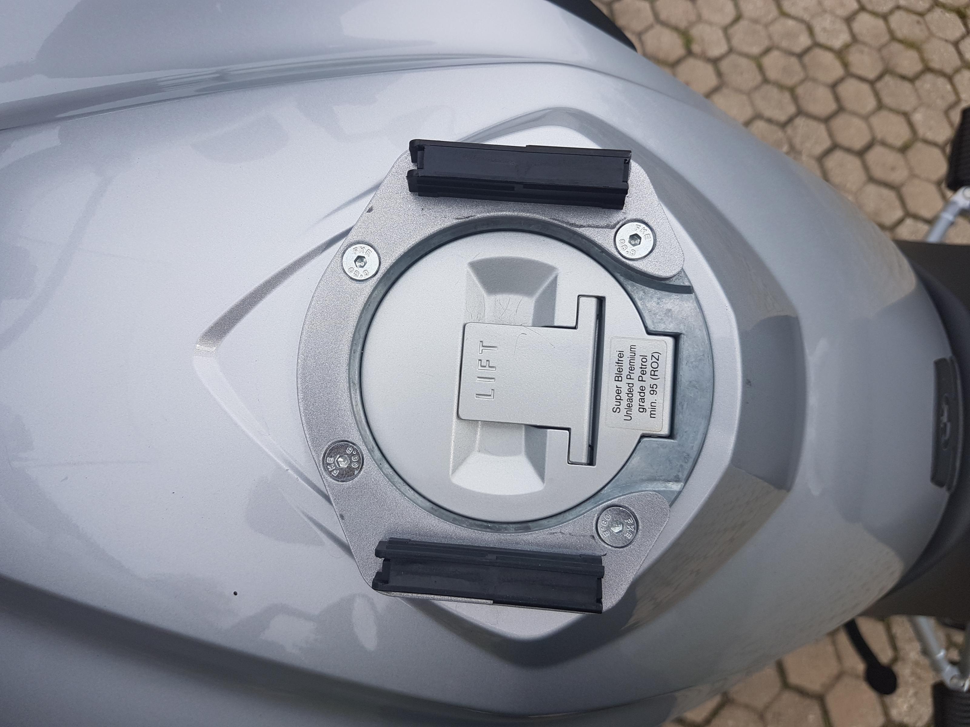 Der Tankrucksack lässt sich durch die Magnetbalken am Tankring sehr einfach arretieren. (Bei anderen Quicklock-Adaptern fand ich persönlich das Gepfriemle an der Tankstelle nicht so toll bis der TRS wieder arretiert war)